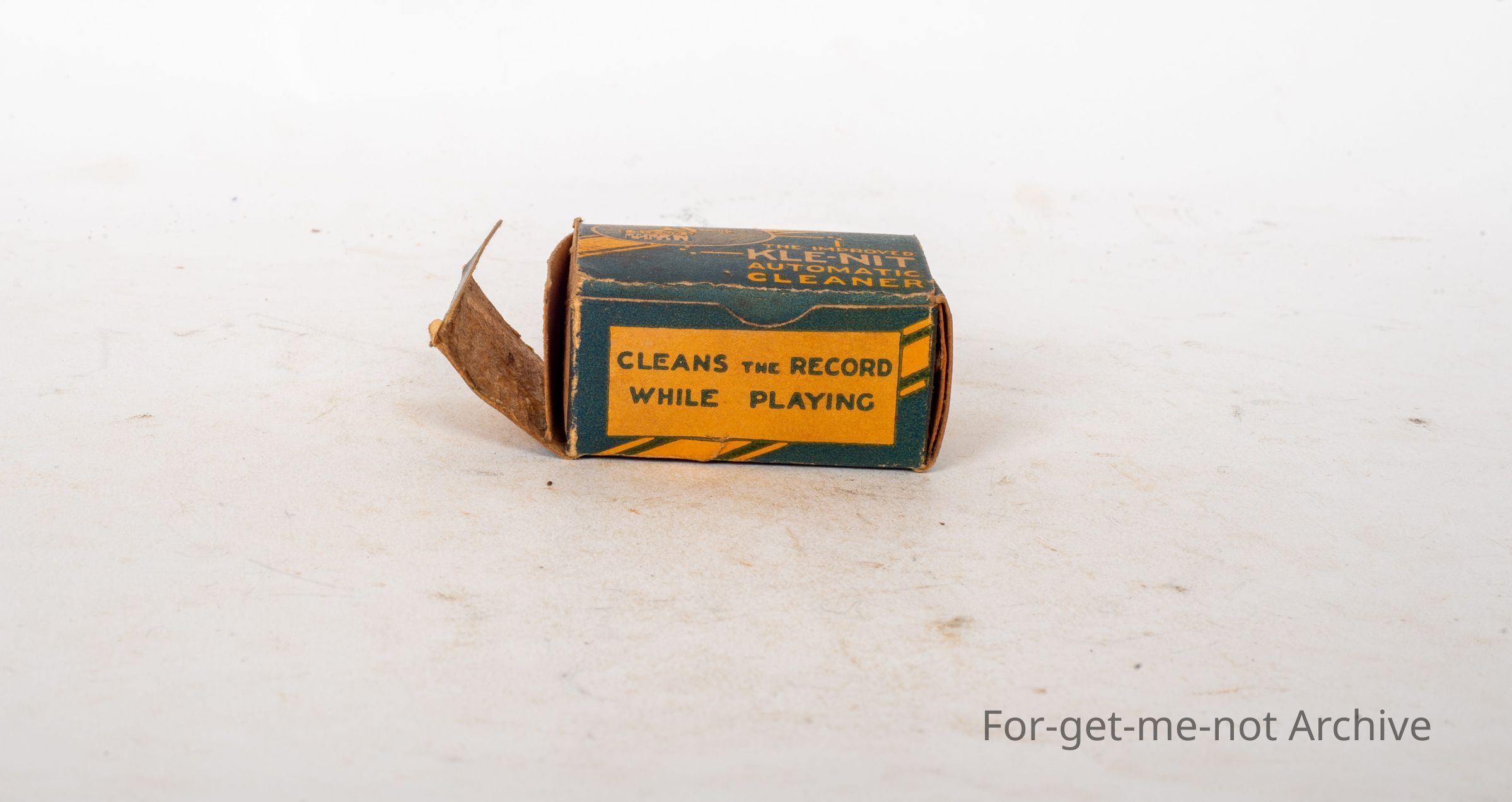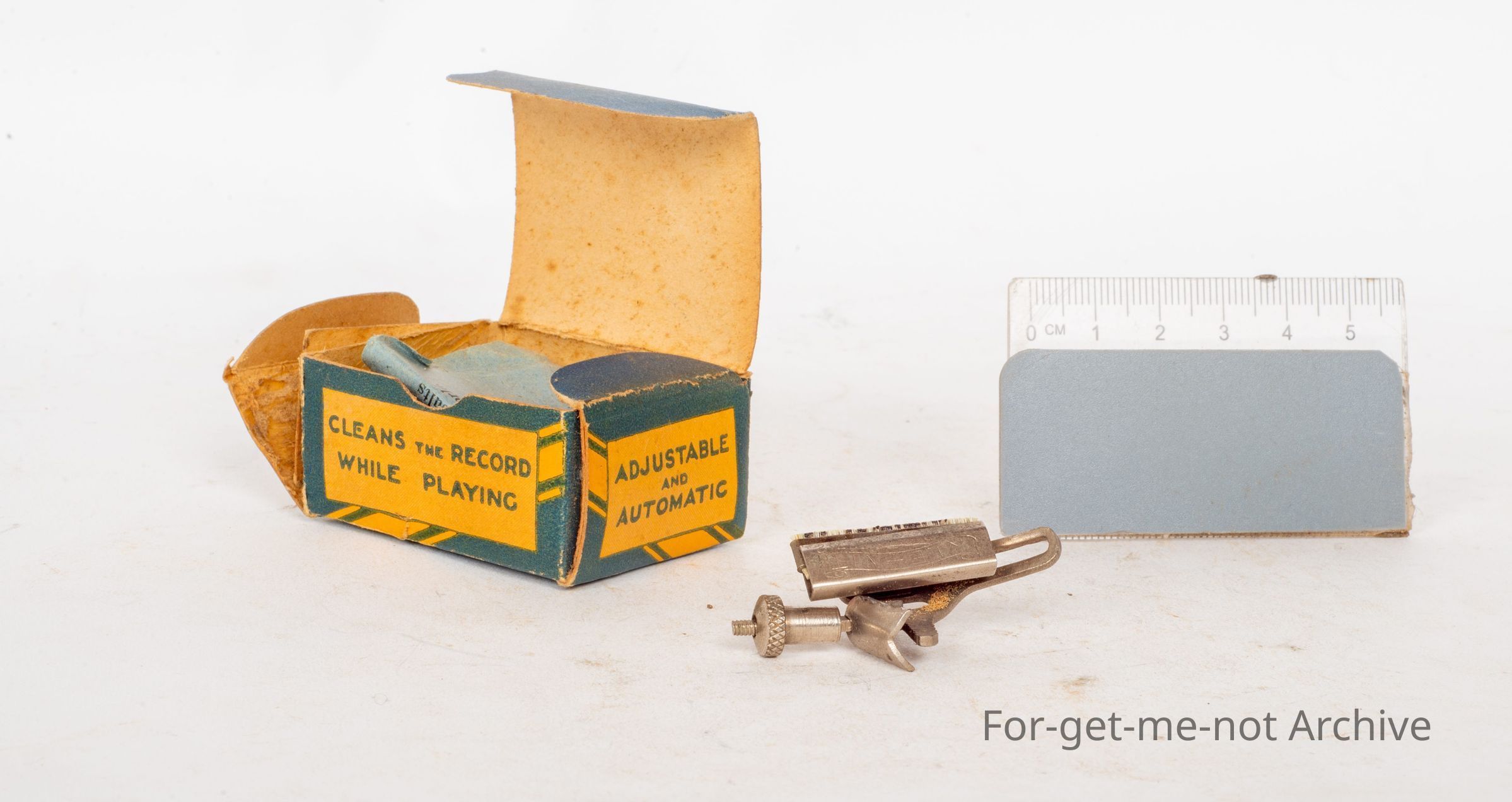 This is a little packaging box from Mrs. Rowan's Music Warehouse, the Plaza Theatre Building, Parrot Street, Warrnambool. This little apparatus is clipped onto the end of the stylist and as the record, goes around, this thing sweeps the record while it's in motion and it's called the Clean Knit Automatic CleanerCollection