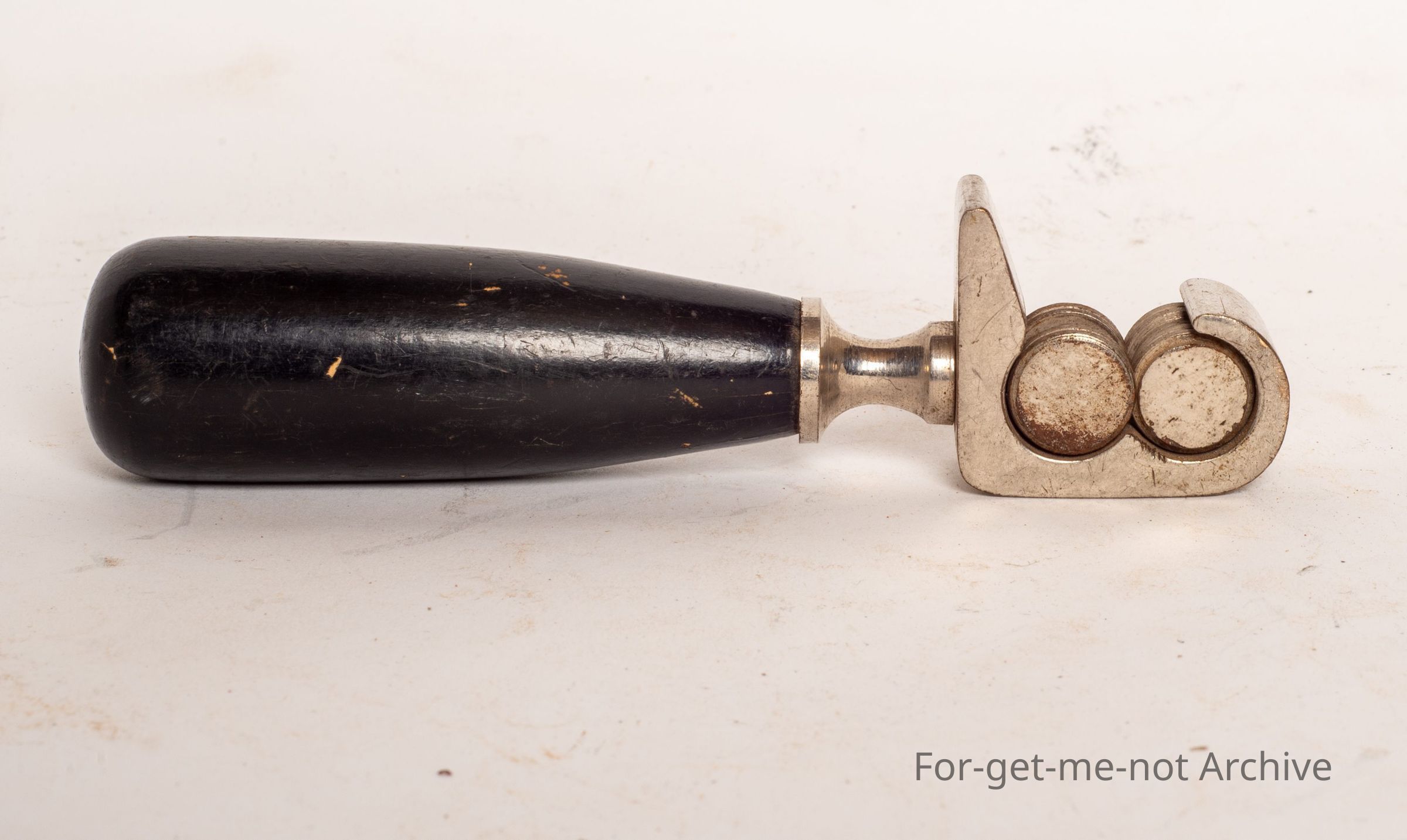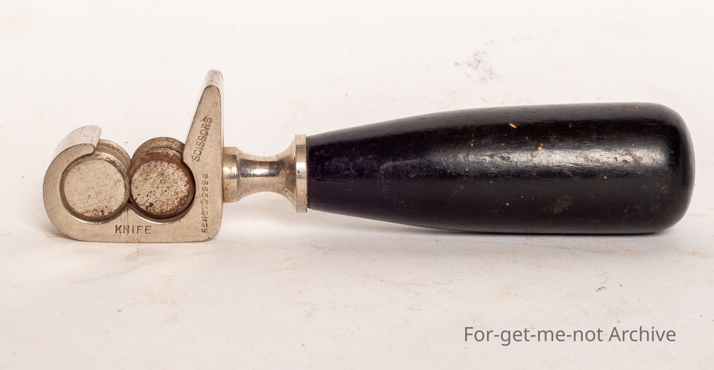 Glorious little knife sharpener, wooden handle, unusual design, few stampings of knife, rifle knife, scissors, and a registered number.