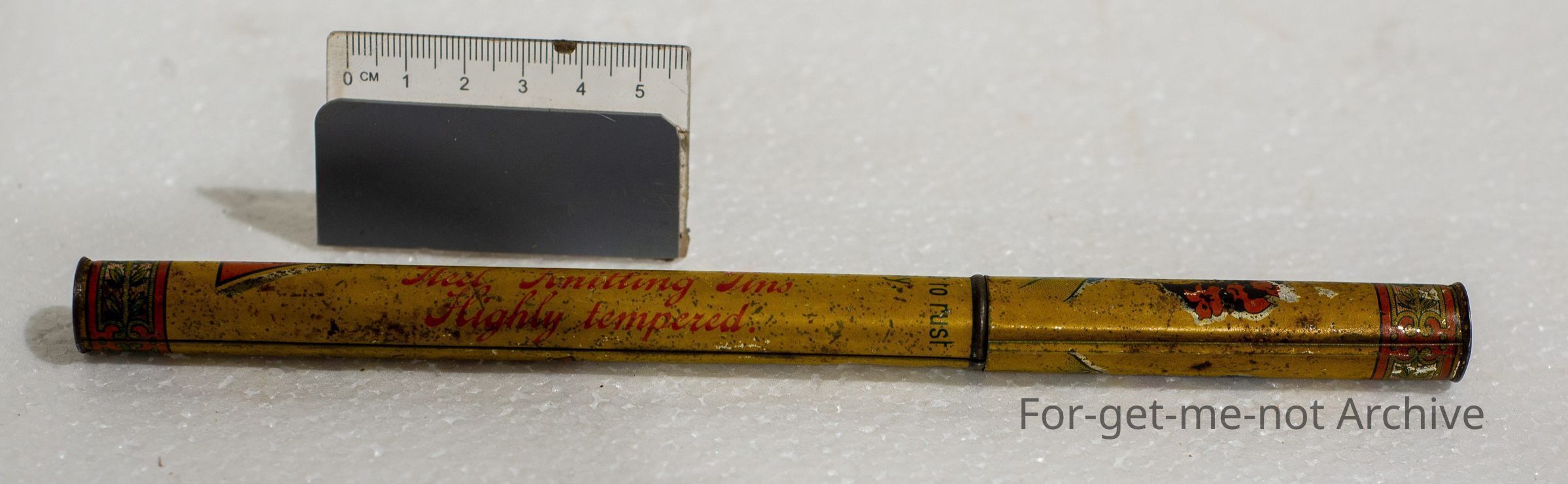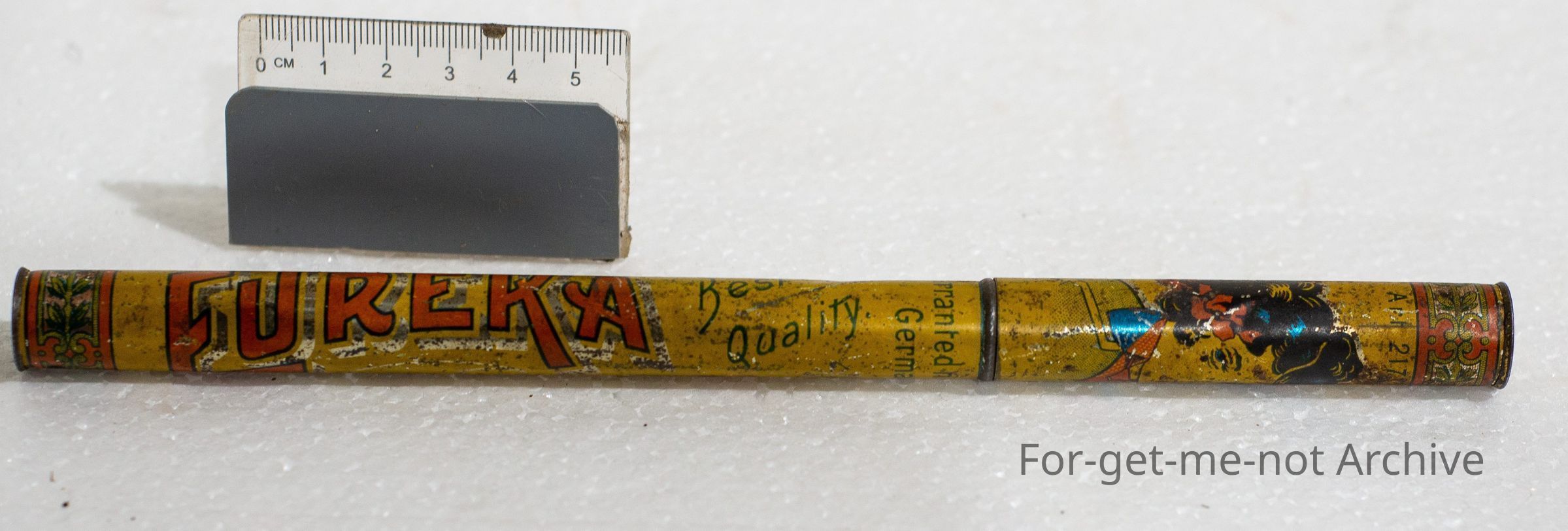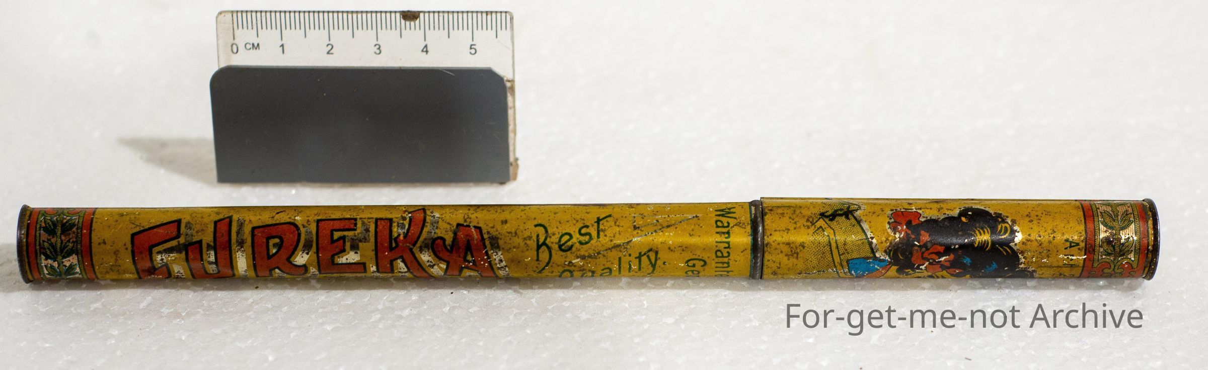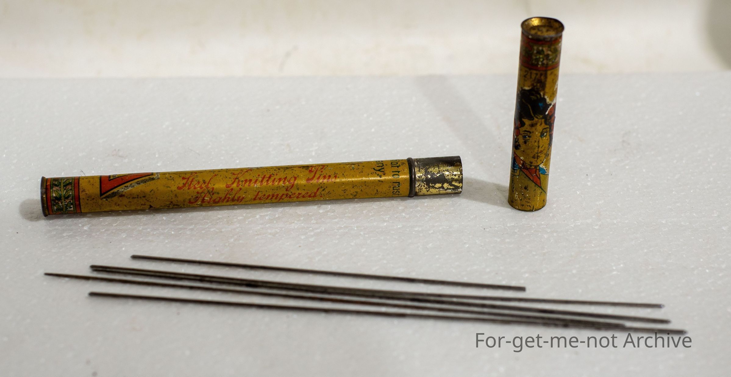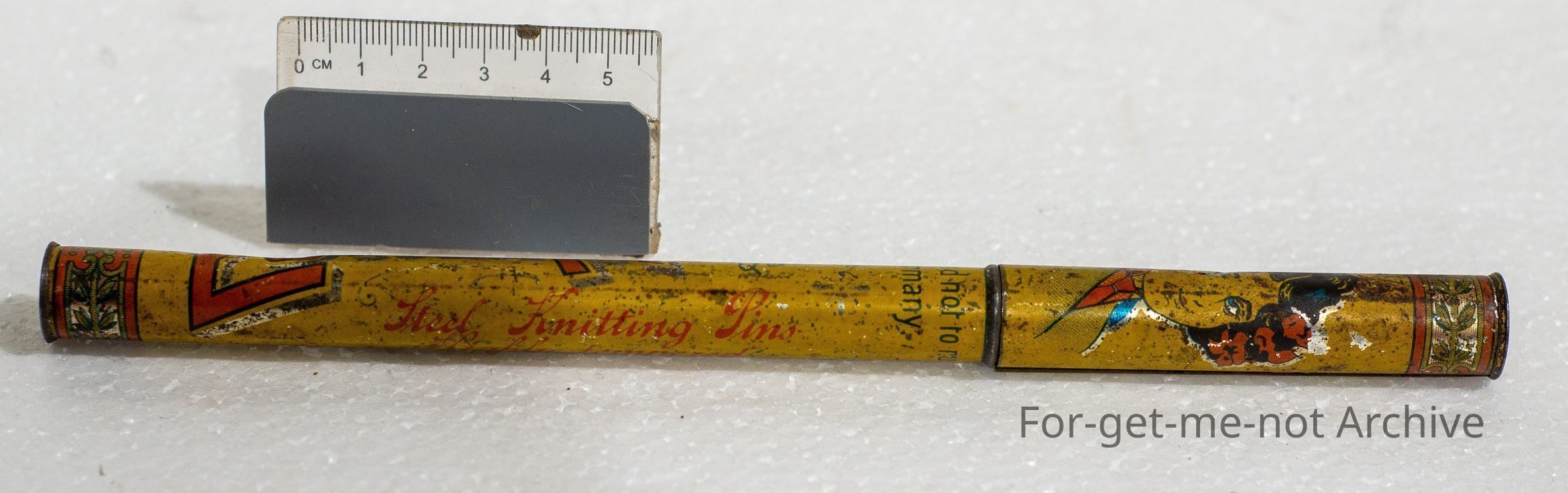 well decorated cylindrical tin to hold steel knitting pins " Eureka , Best Quality , Steel Knitting Pins, Highly tempered, Will not rust , made in Germany"
