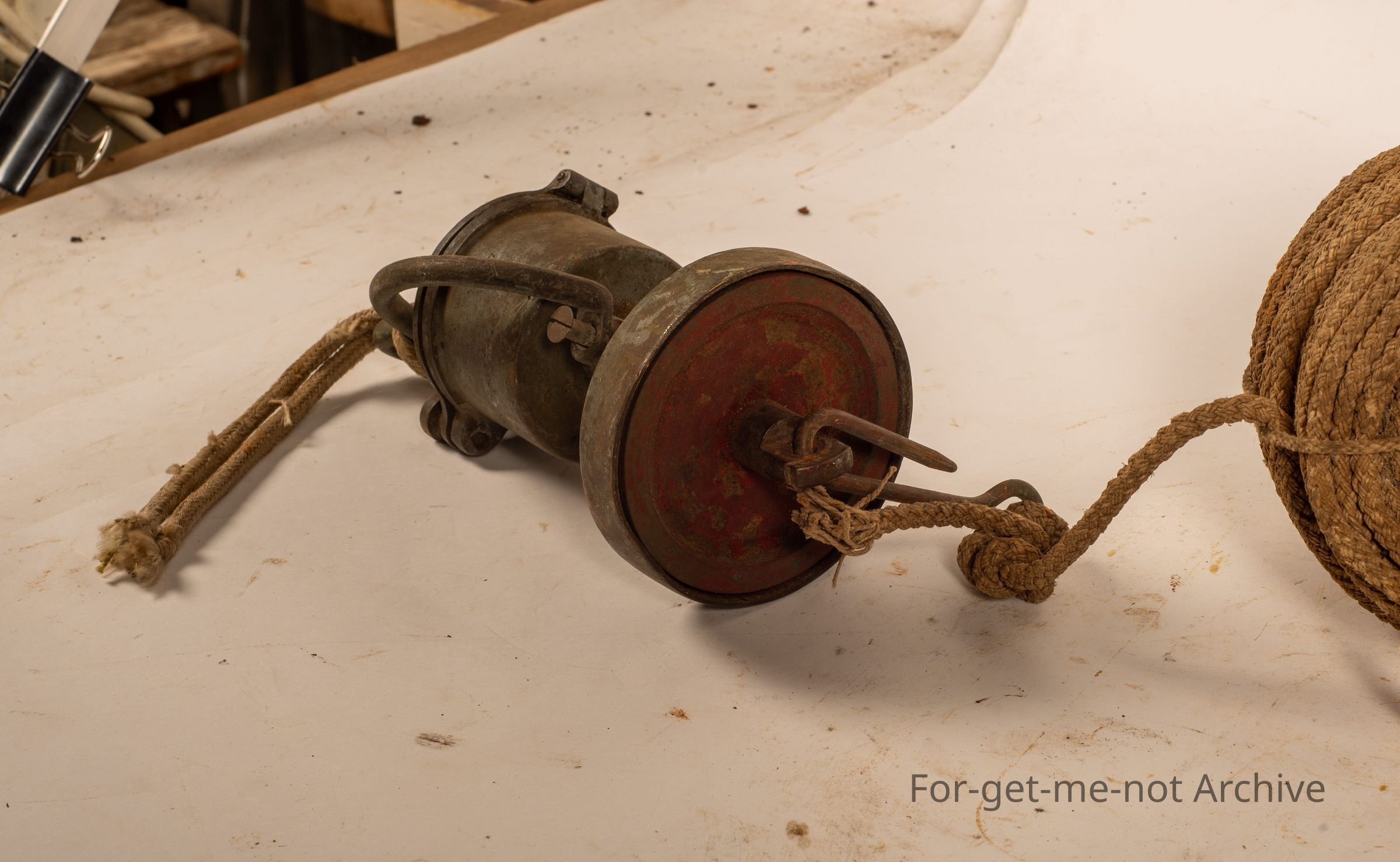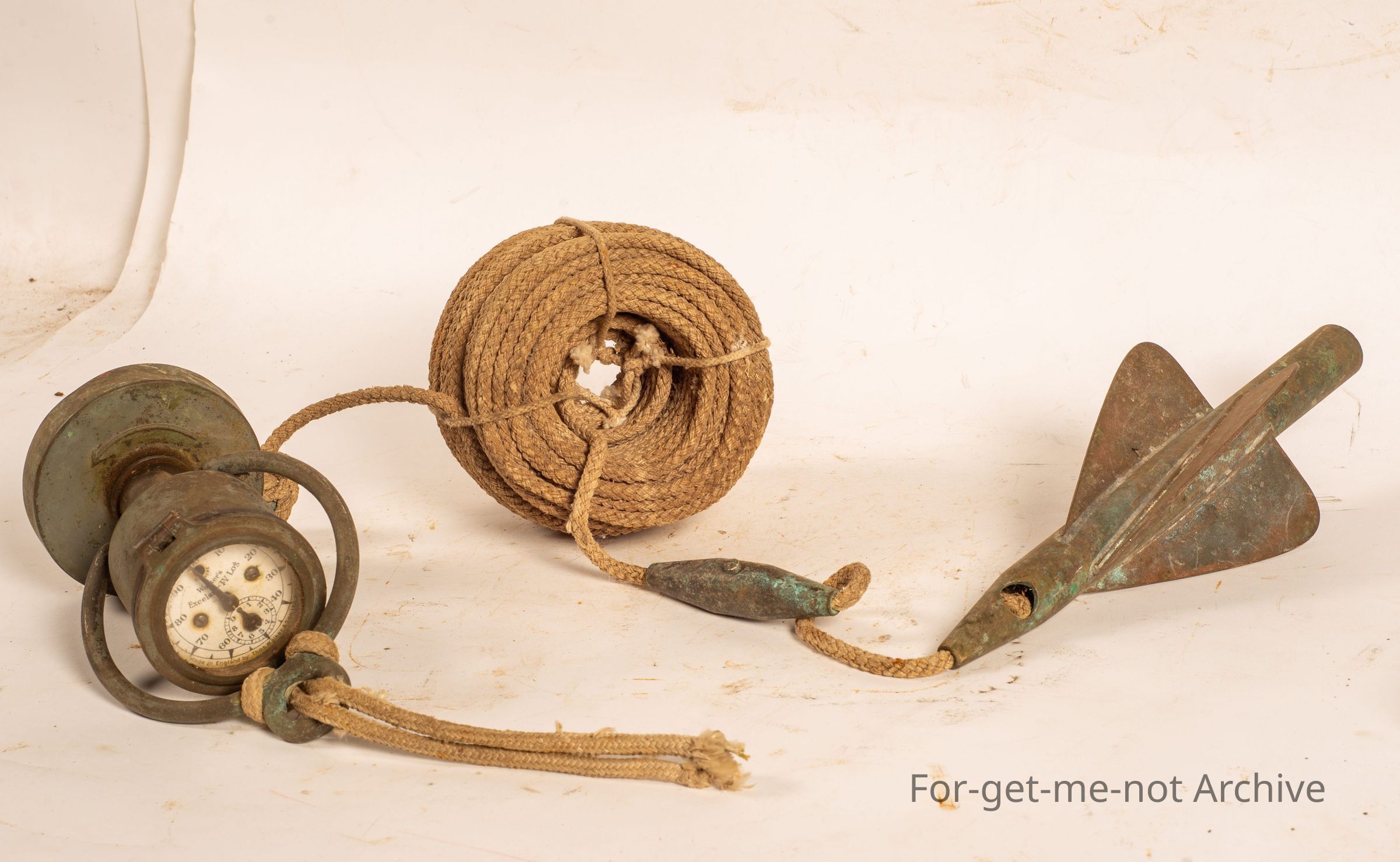 This is referred to commonly as a knotmeter. The, it has a heavy woven cord that won't undo under any rotation. It has a lead weight to keep the propeller part, spinning in the water behind the boat. In the boat is the meter which gives you the speed you're travelling through the water by the rotation of the rope from the propeller. Unusual to see these 3 parts together. Beautifully made, very early, Really hard to find.Collection