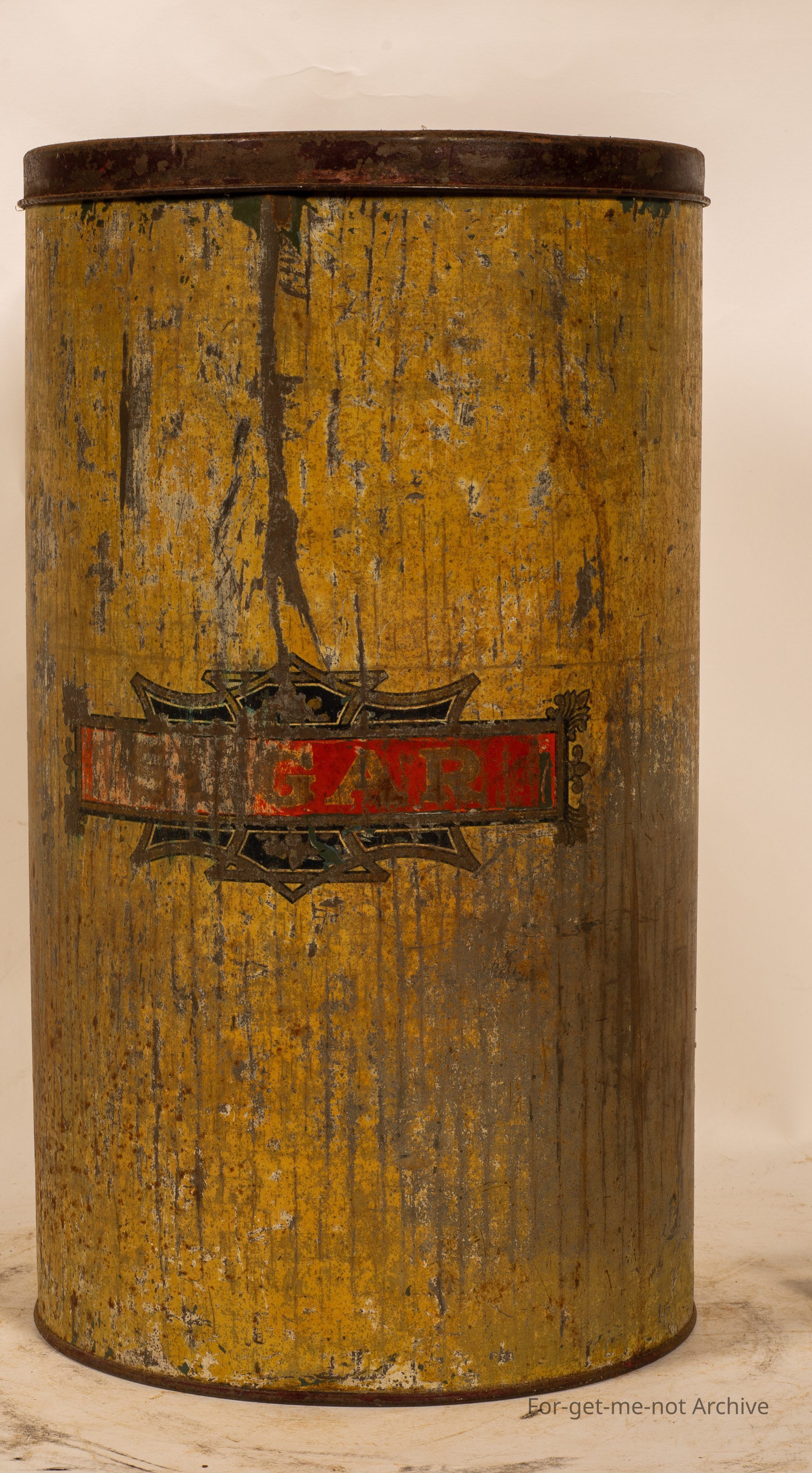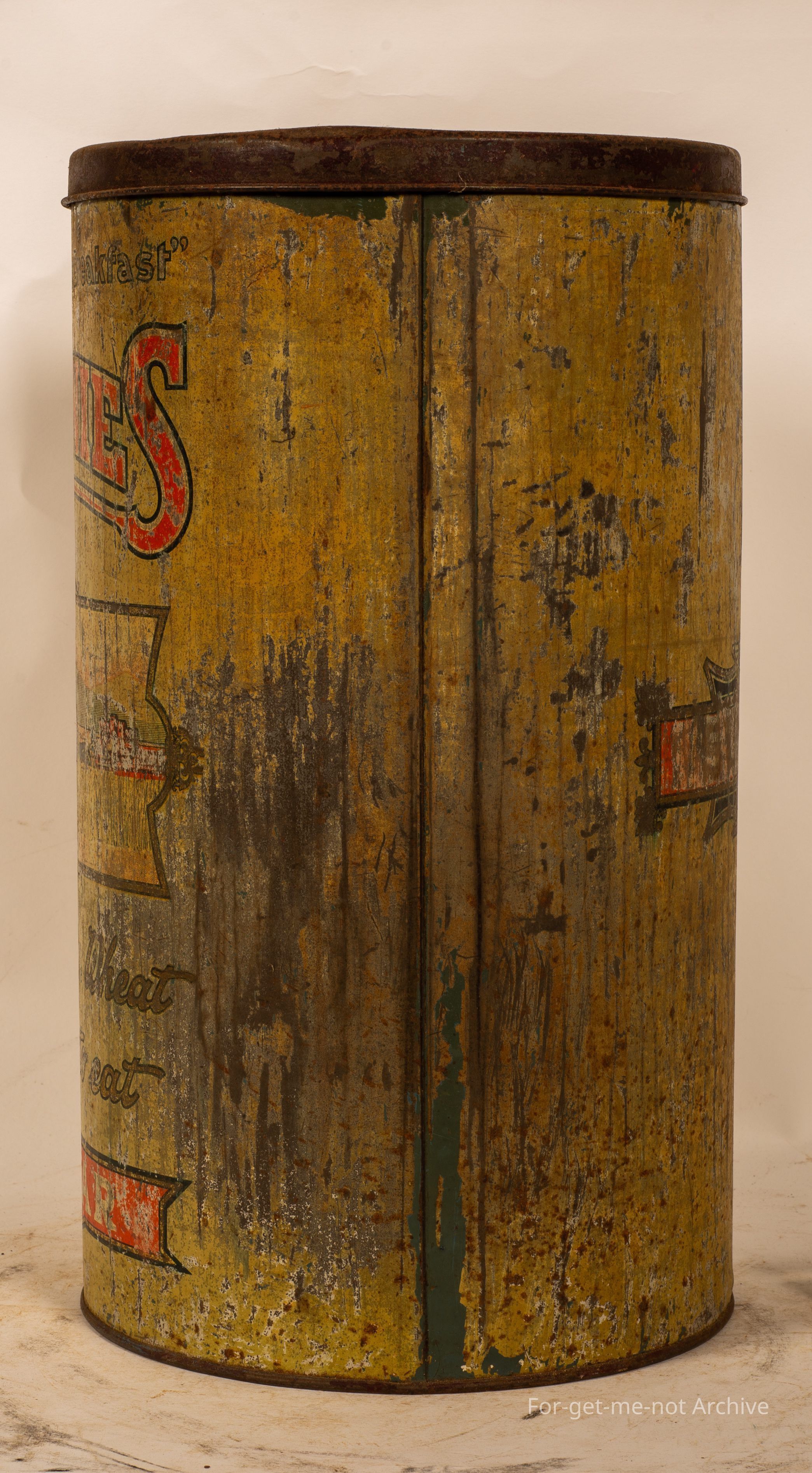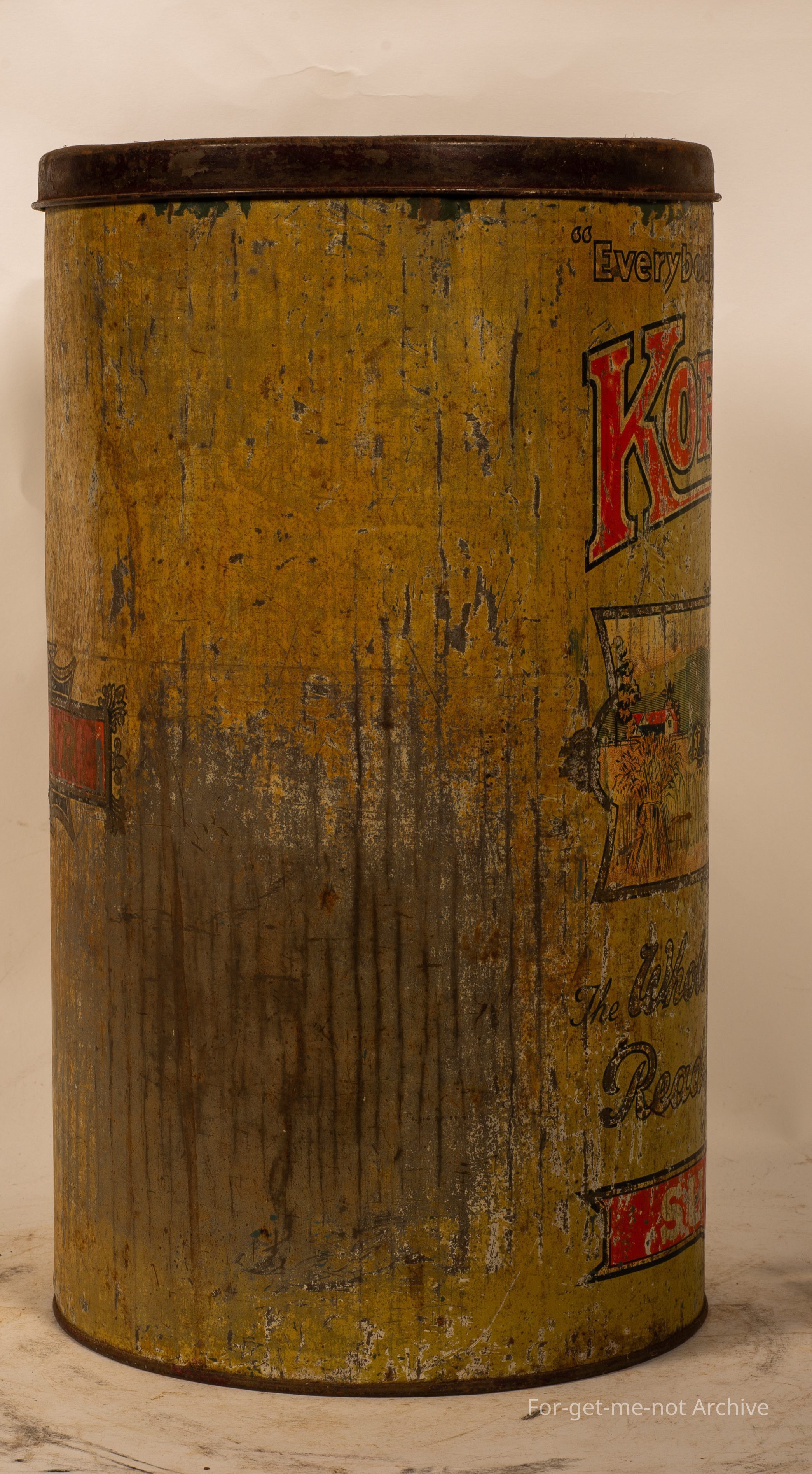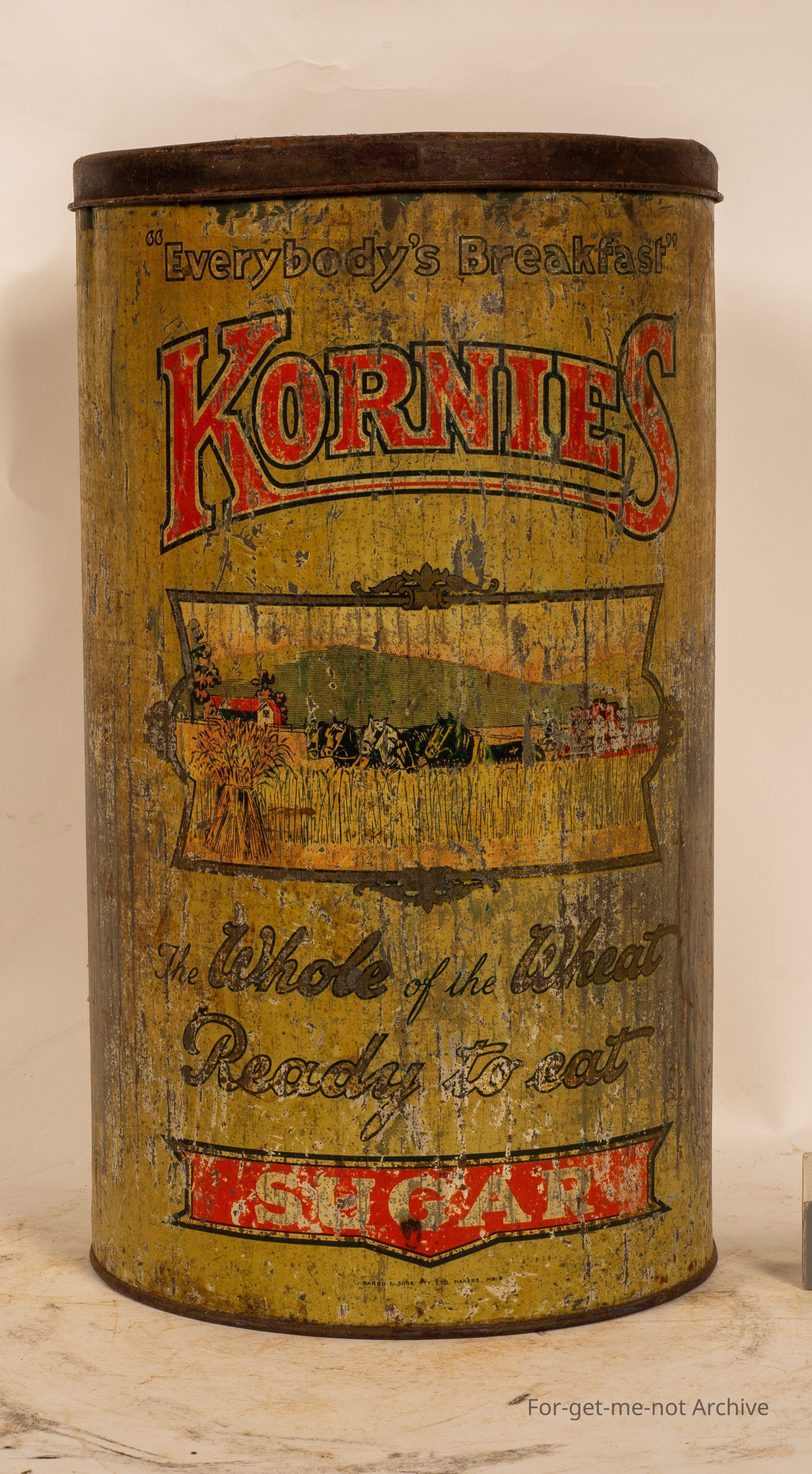 This is a tall, cylindrical tin of Kornies, everybody's breakfast. Image of a horse stream pulling a stripper. The whole of the wheat ready to eat. As this is also secondary use of a storage thing, labelled sugar. Not in good condition, but a desirable tin.Collection
