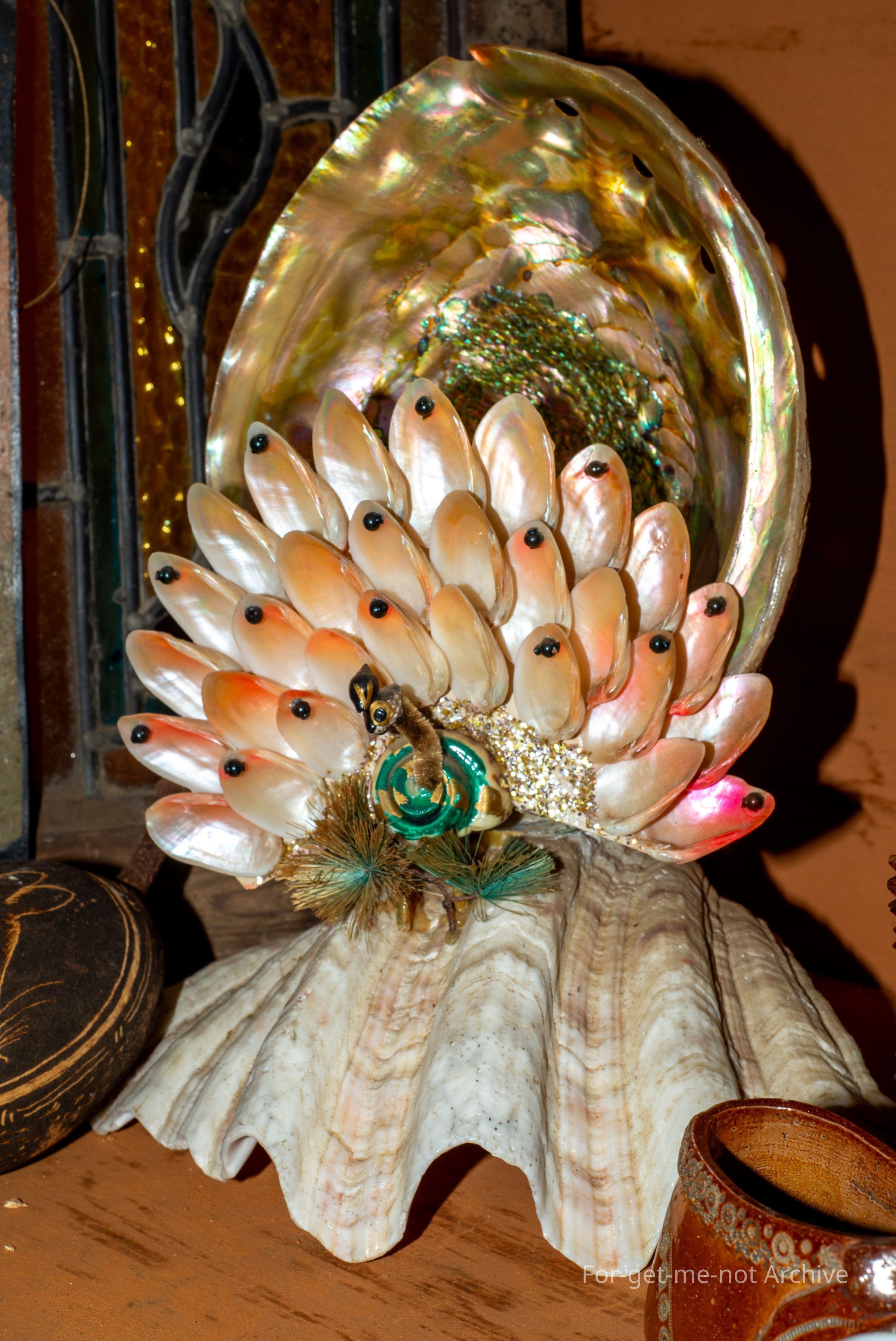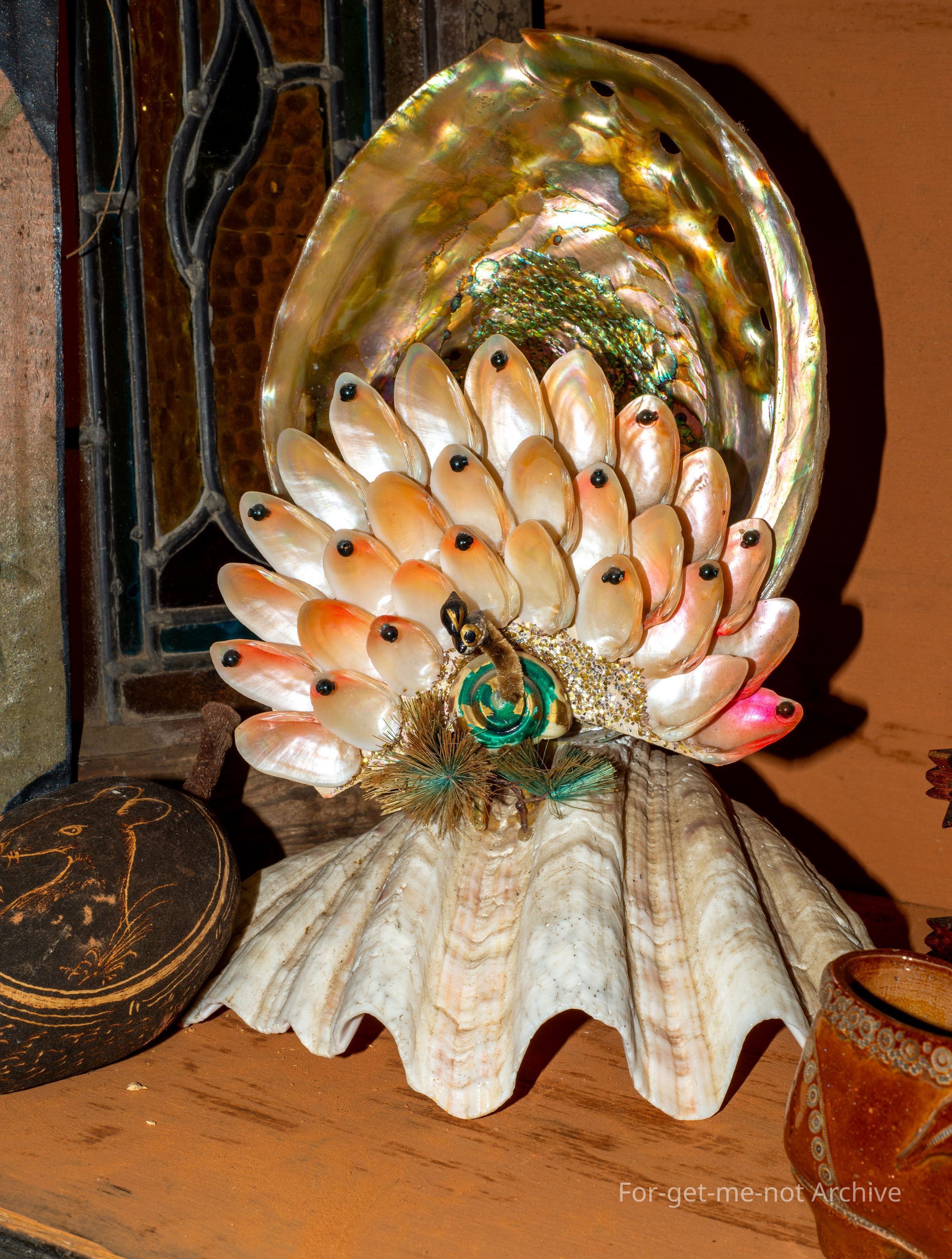 A decorative shell formed lamp, in the with the created form of a peacock, and the back of it is an abalone shell. The foot is another one.