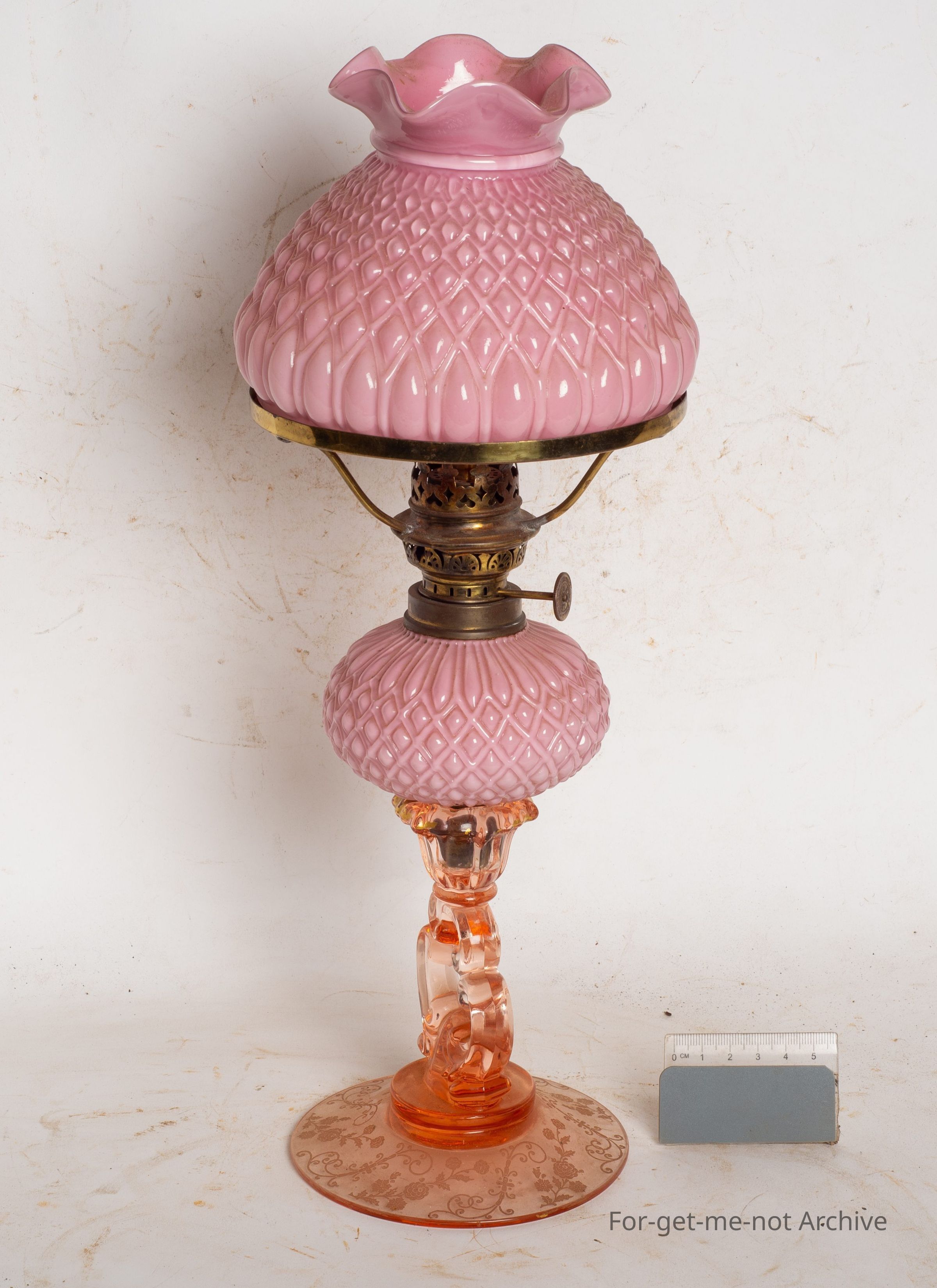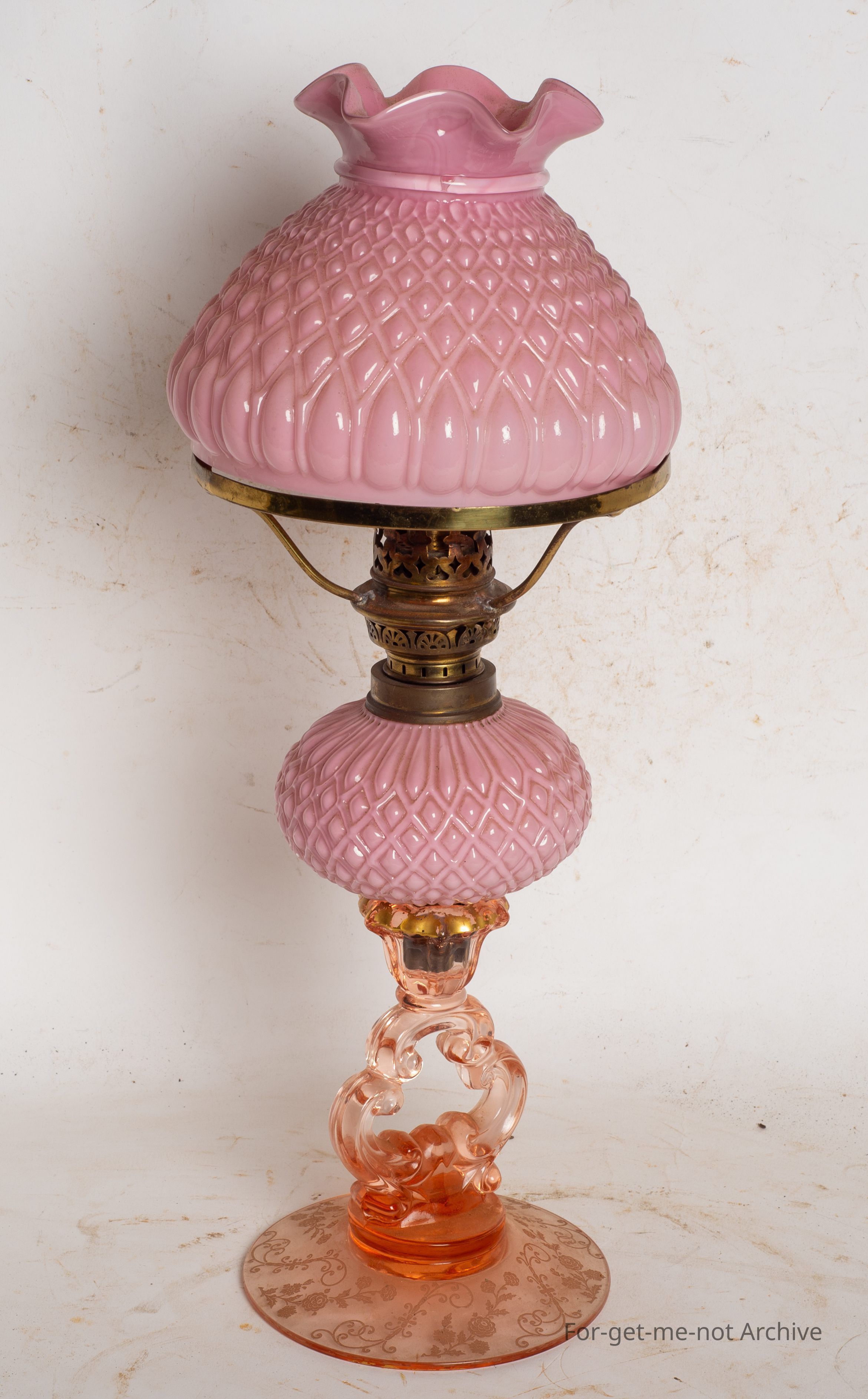 This is a peg lamp on a glass pink stand. The font is pink. The, canopy is pink. Lovely little unit altogether.