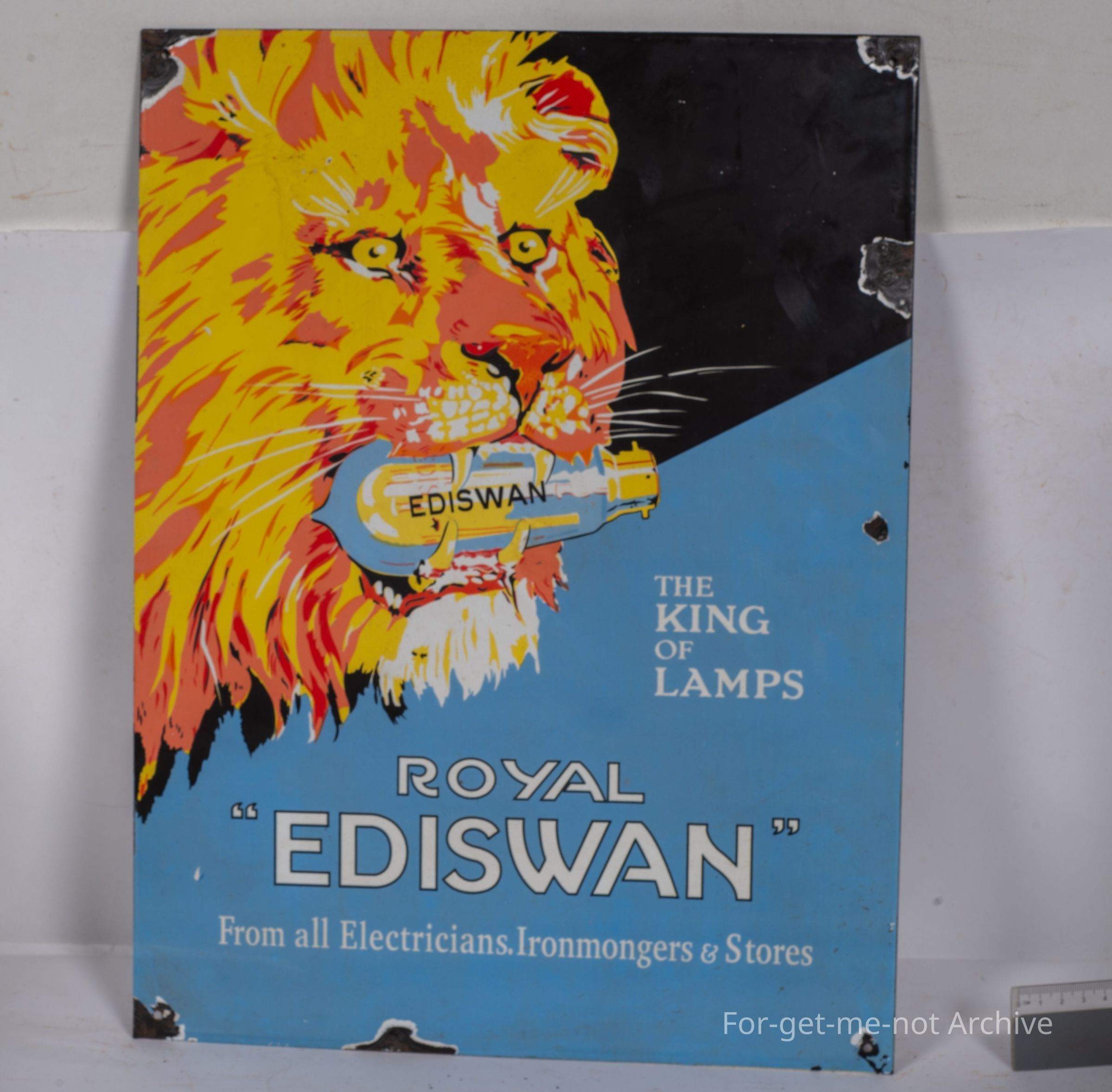 Sangeet Collection . This is quite a colourful pictorial sign, advertising Royal Ediswan, king of all lamps with a pictorial of a lion holding a light globe from all electricians, ironmongers, and stores. This one is not a reproduction. It is a genuine manufactured enamel sign of really good quality.Collection