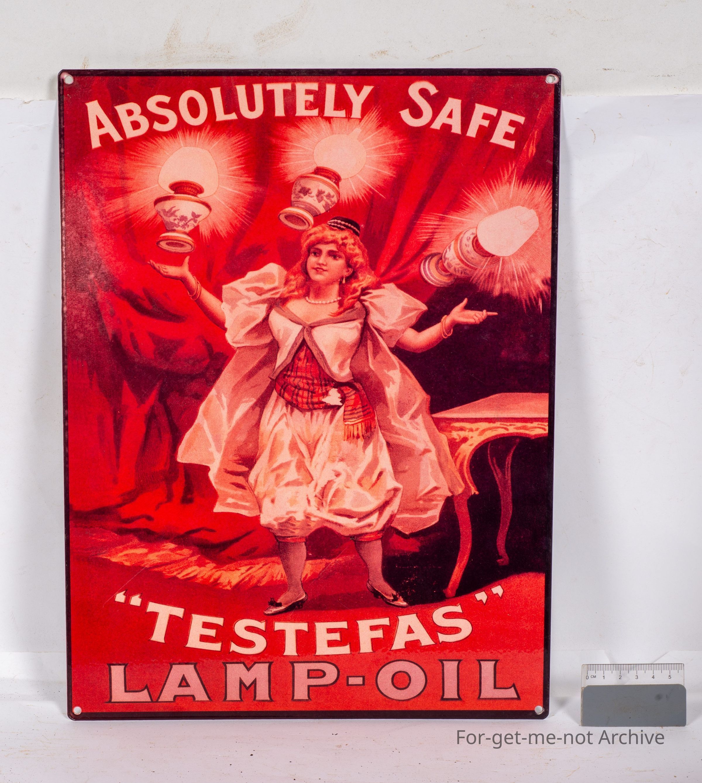 Sangeet Collection. This is a sign that's been enamelled on pretty light tin. Even though it's beautifully done, it is very likely to be a reproduction. Glorious pictorial advertising. Absolutely safe. Test testefas lamp oil.Collection