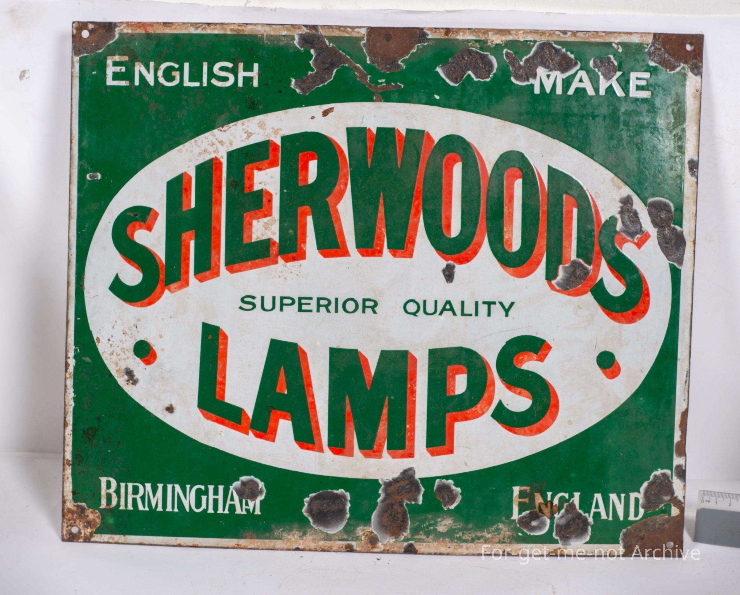 Sangeet Collection. Enamel sign advertising Sherwood Superior Quality Lamps, Birmingham, England. This is a very early, enamel sign in relatively good condition.