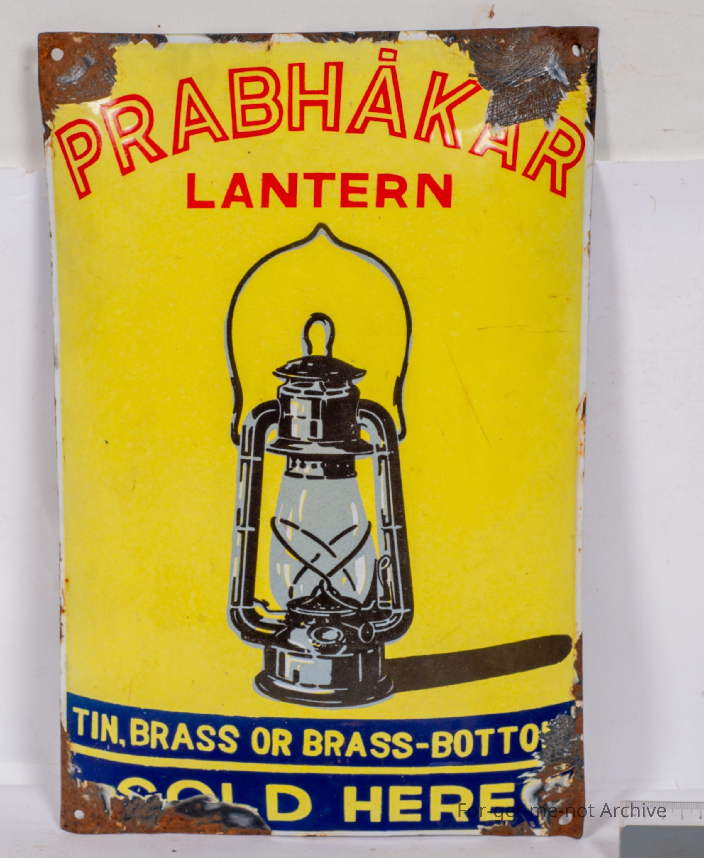 Sangeet Collection. Another, convex, enamelled sign, an early one. This one is advertising Prabhakar lanterns, tin brass or brass bottom, sold here. Image of a hurricane lamp. This one's in very good condition.Collection