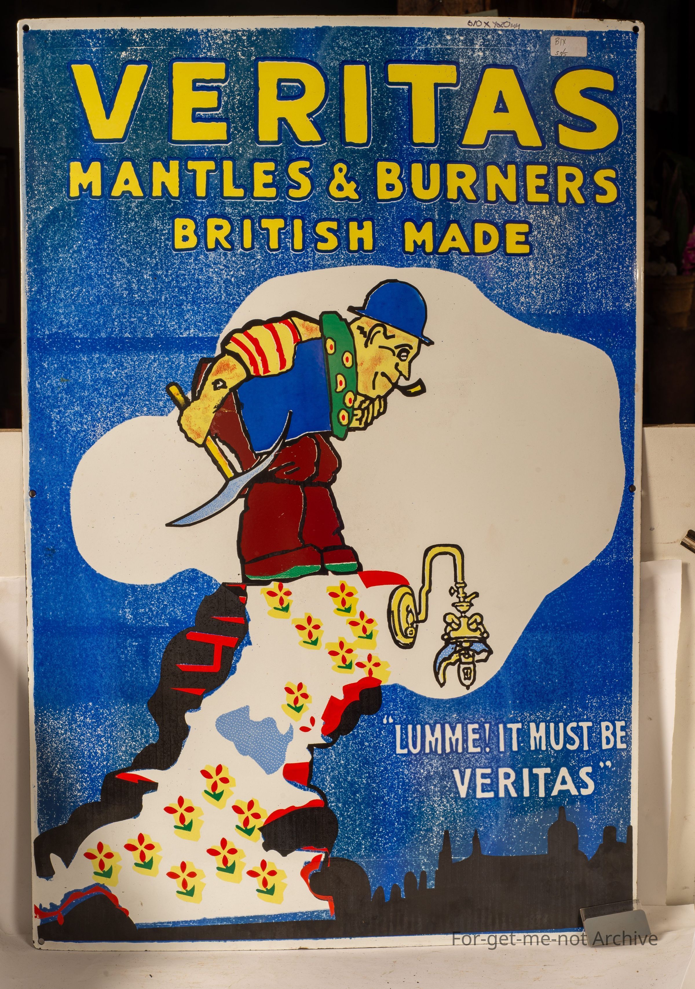 Sangeet Collection. This is a large enamel sign advertising Veritas Mantles and Burners, British made, an image of a fellow, with a quote, "Lummy, it must be Veritas."Collection