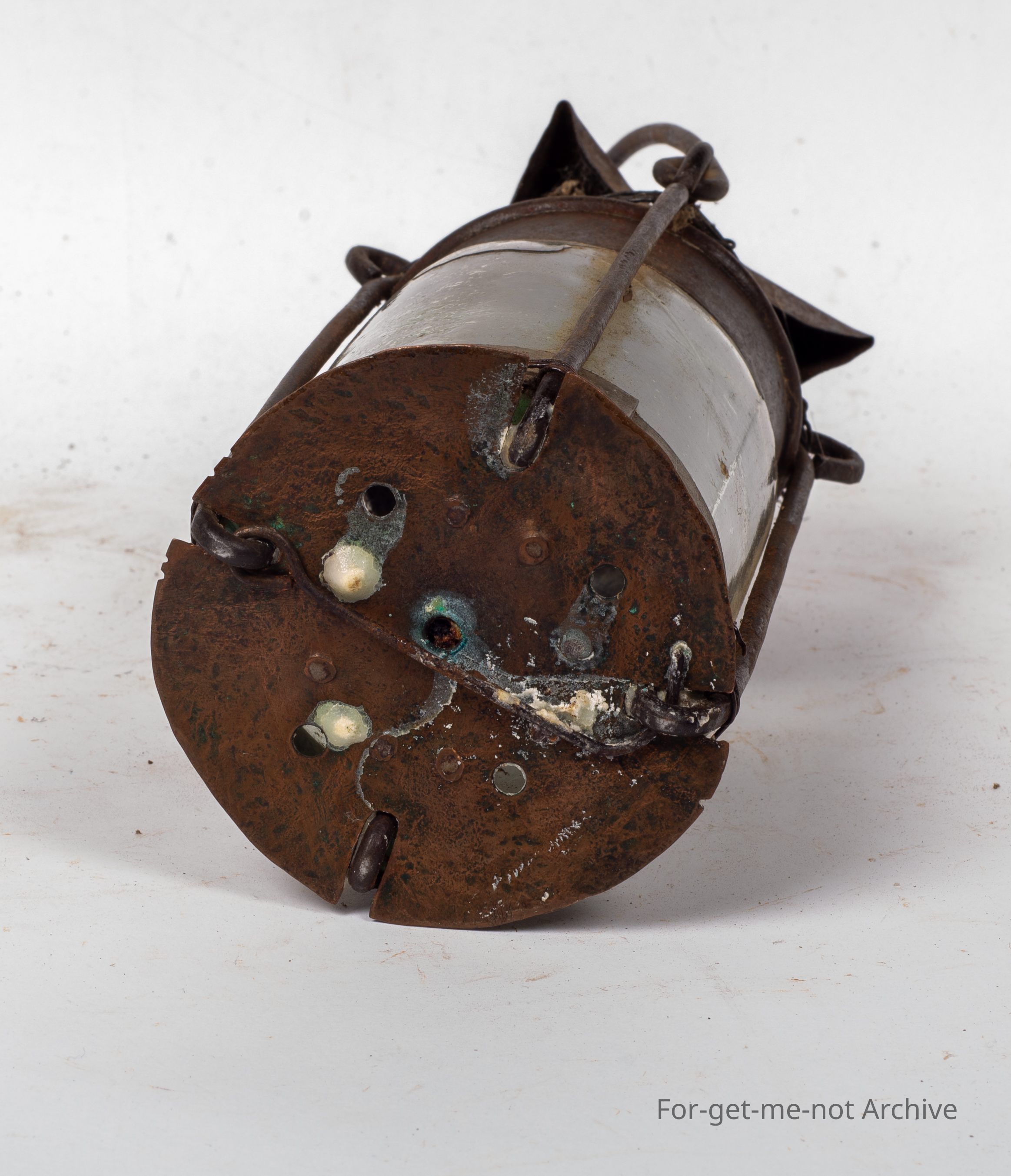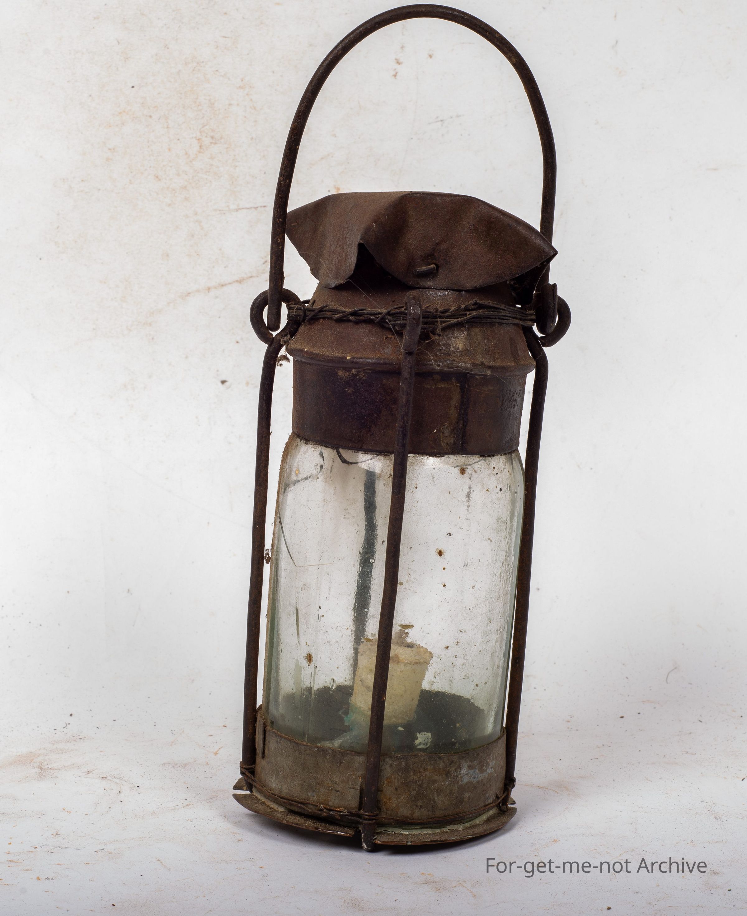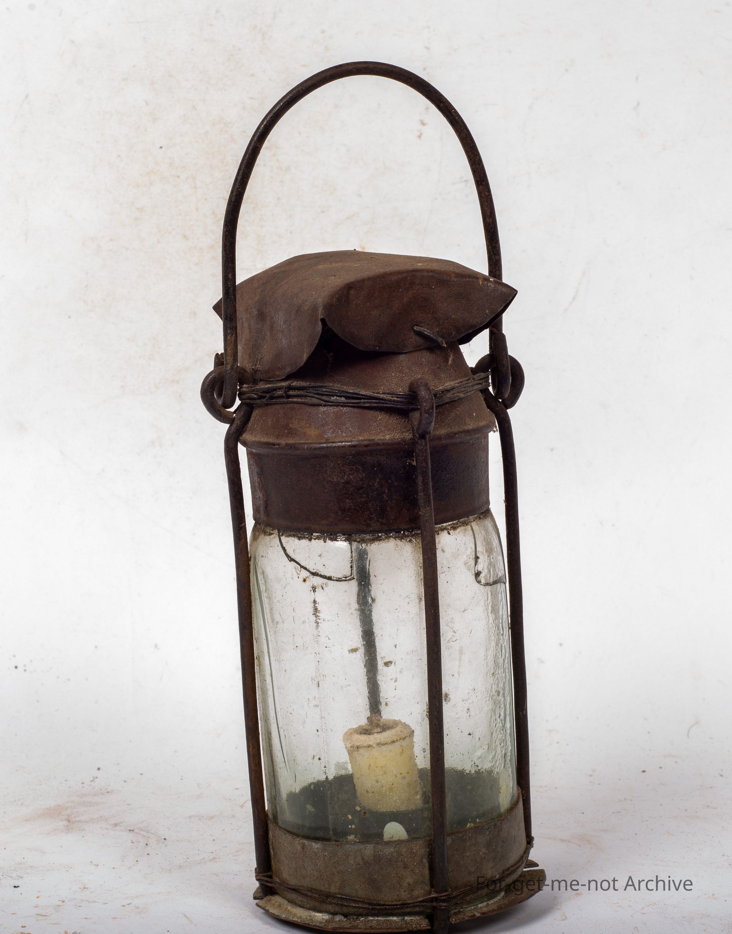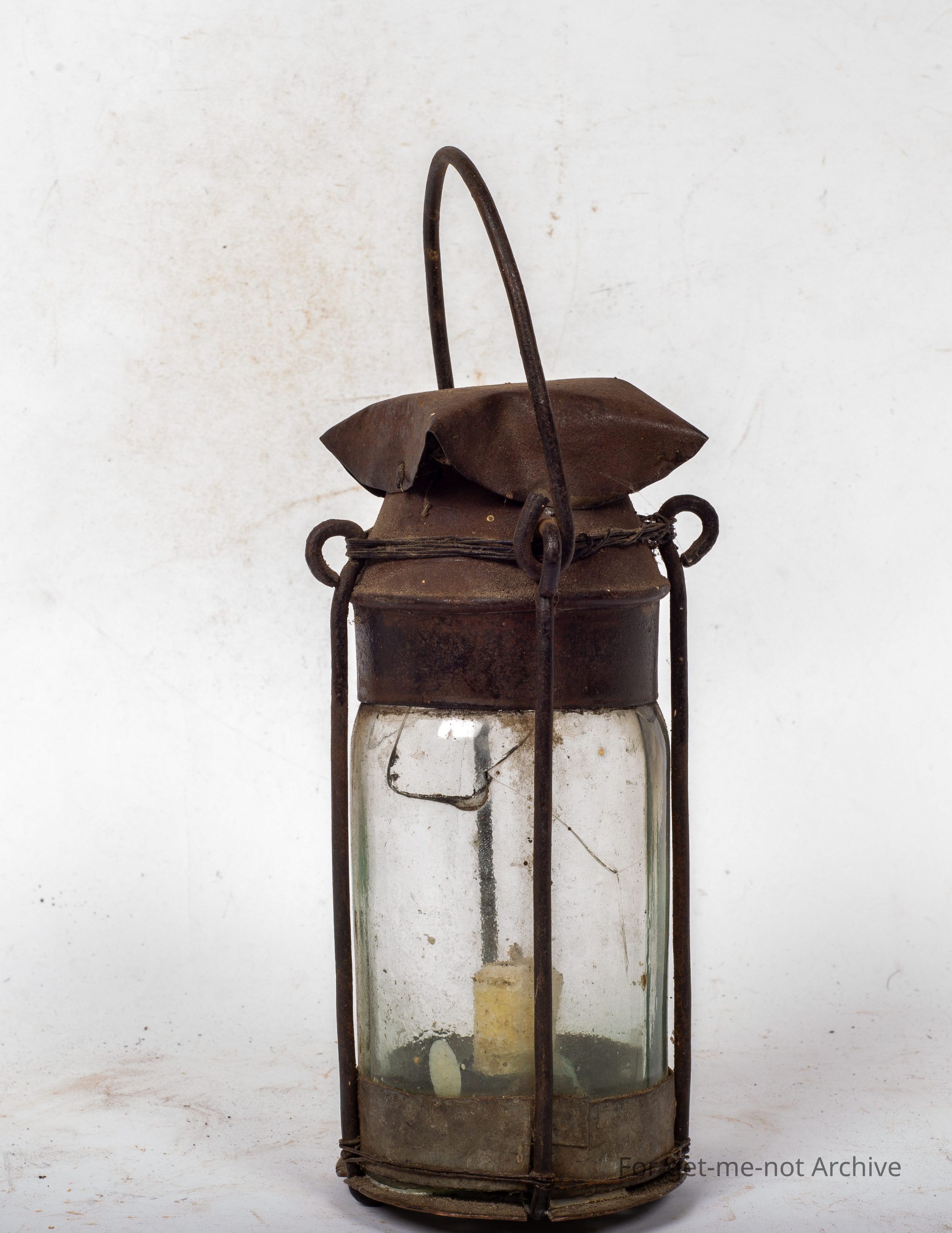 This is a wonderful, piece of classic depression improvisation creating a candle lamp from a jar, with a pressed metal tin, a handle, and, supported with links of wire, bound together with wire with the candle inserted. This is from an era gone by of times,Collection