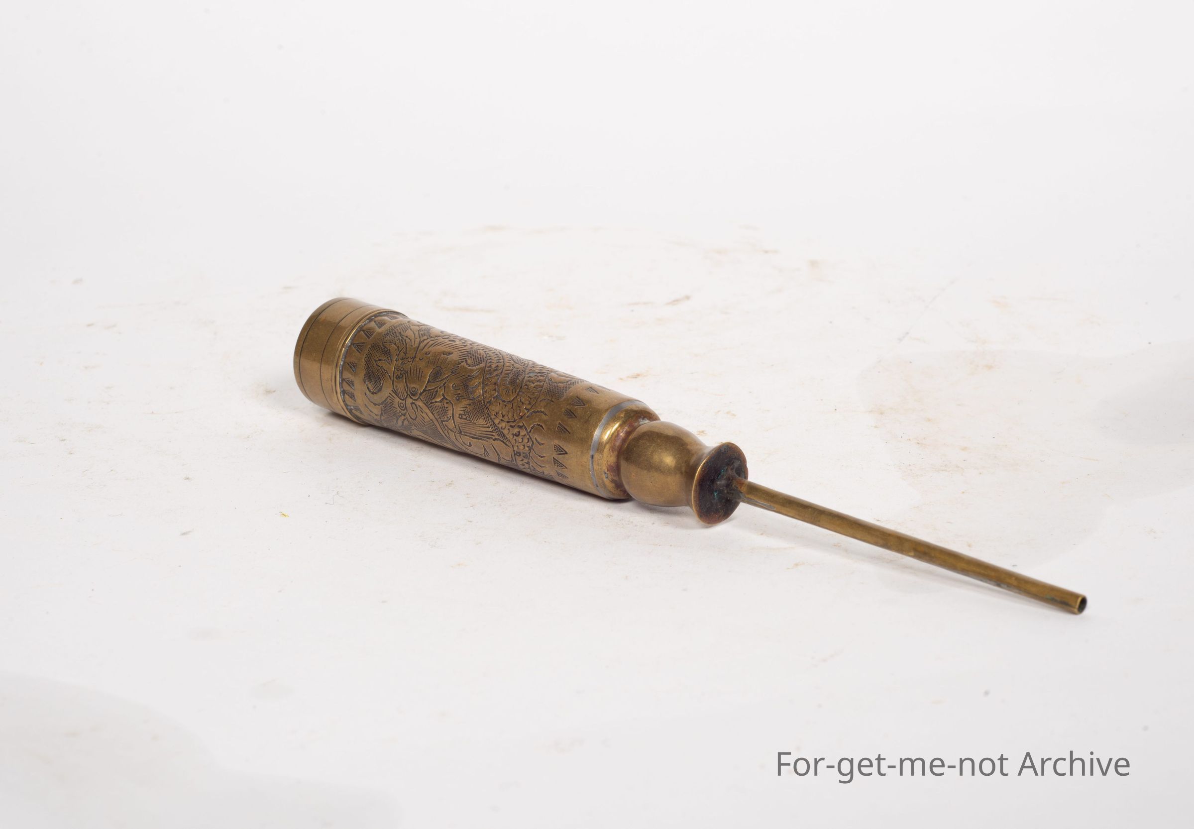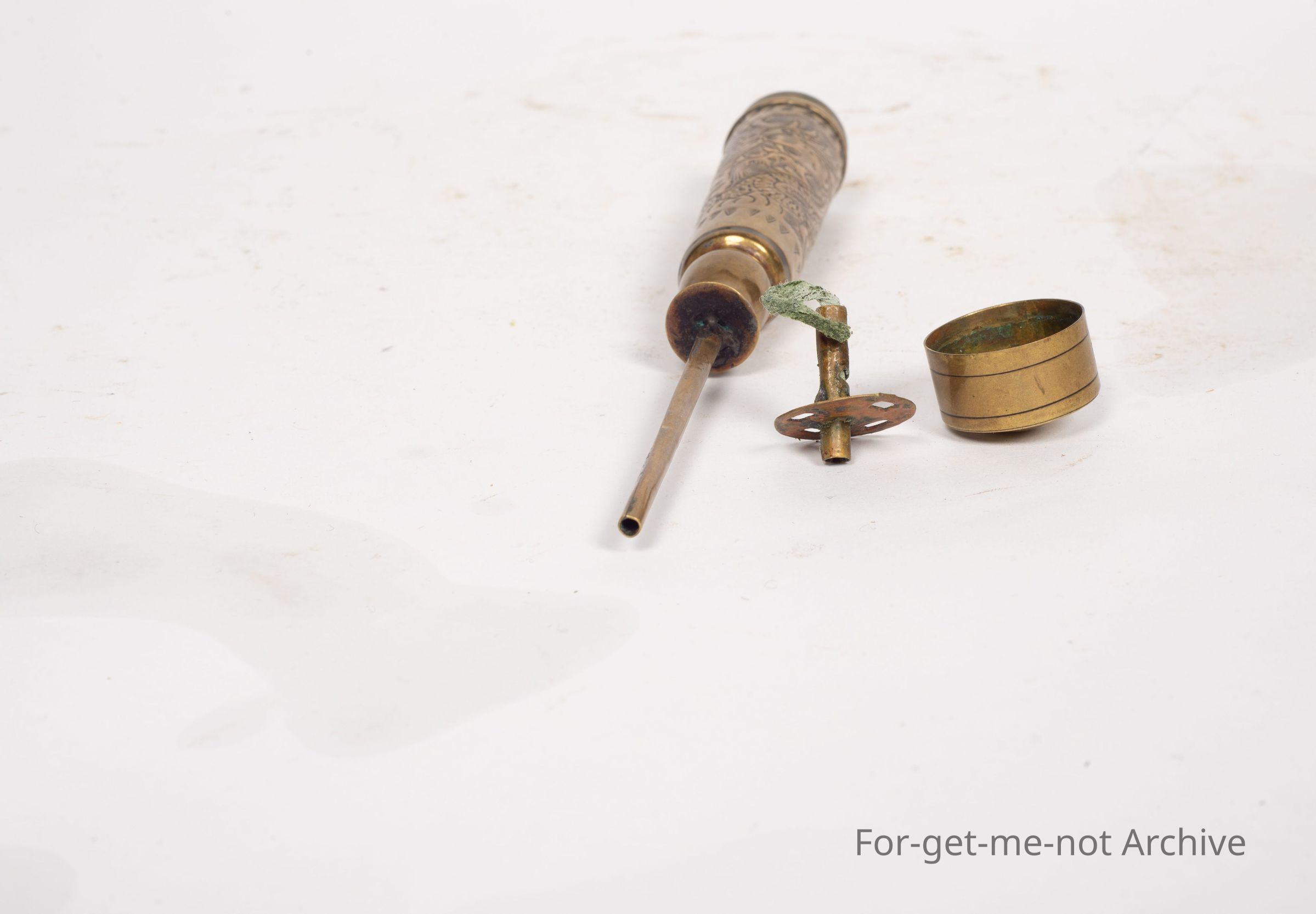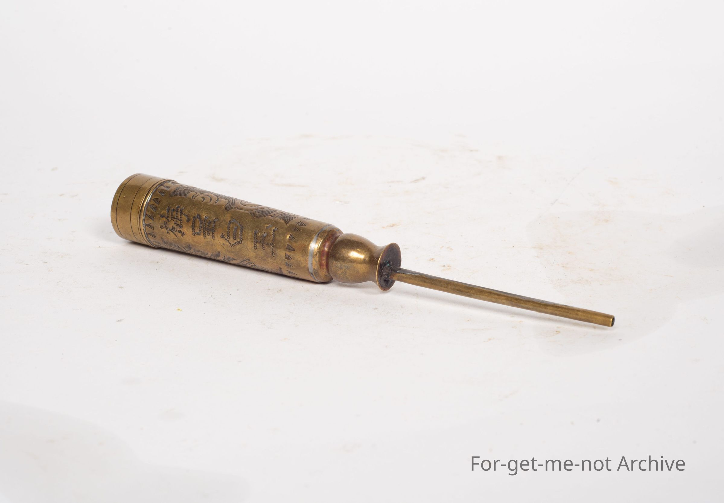 Is a strange little instrument that holds fuel. This has a long slender tube which held holds a wick, the fuel feeds up the wick. This is used for lighting early Japanese, Chinese lamps. This is considered a very rare piece