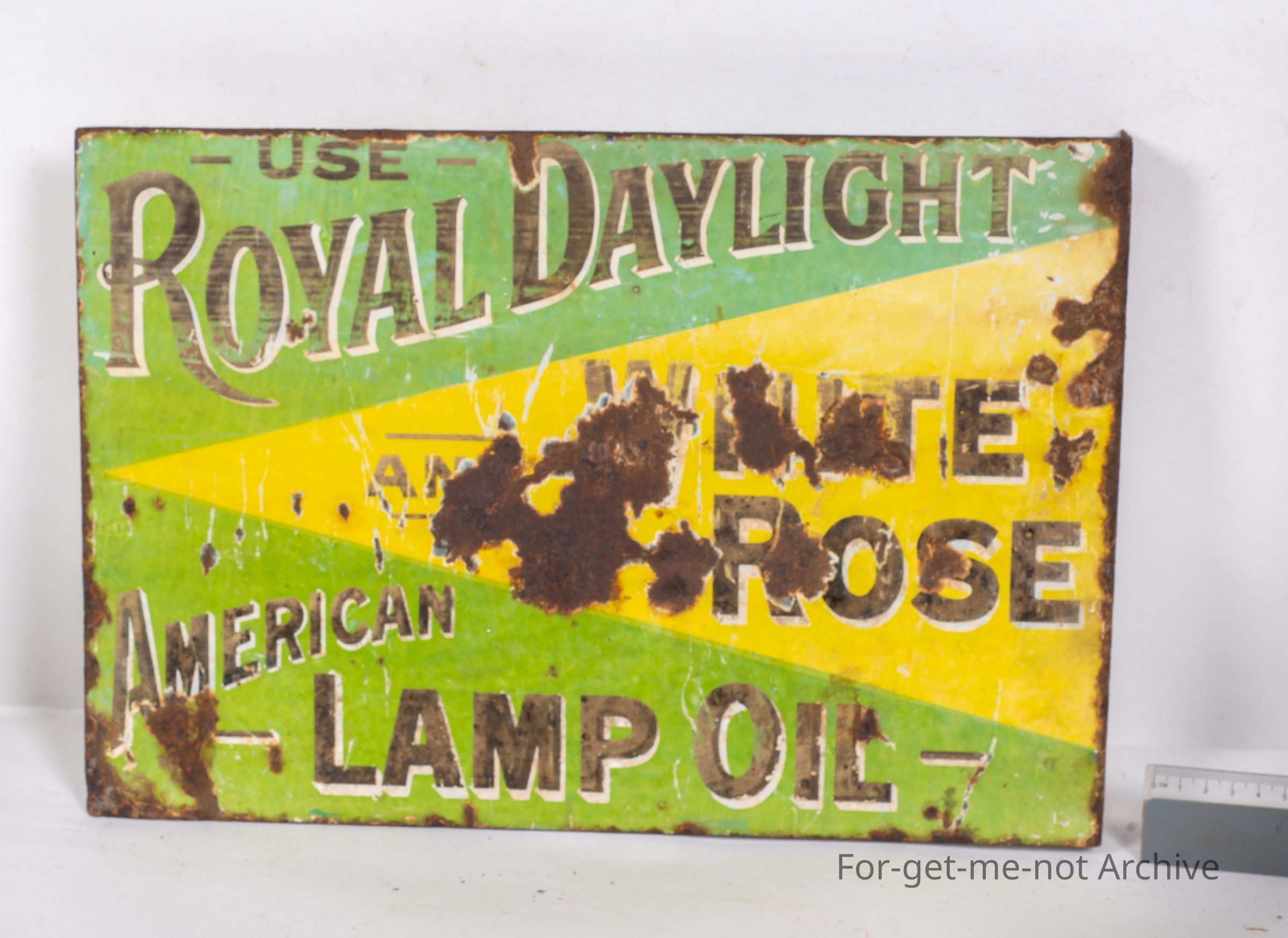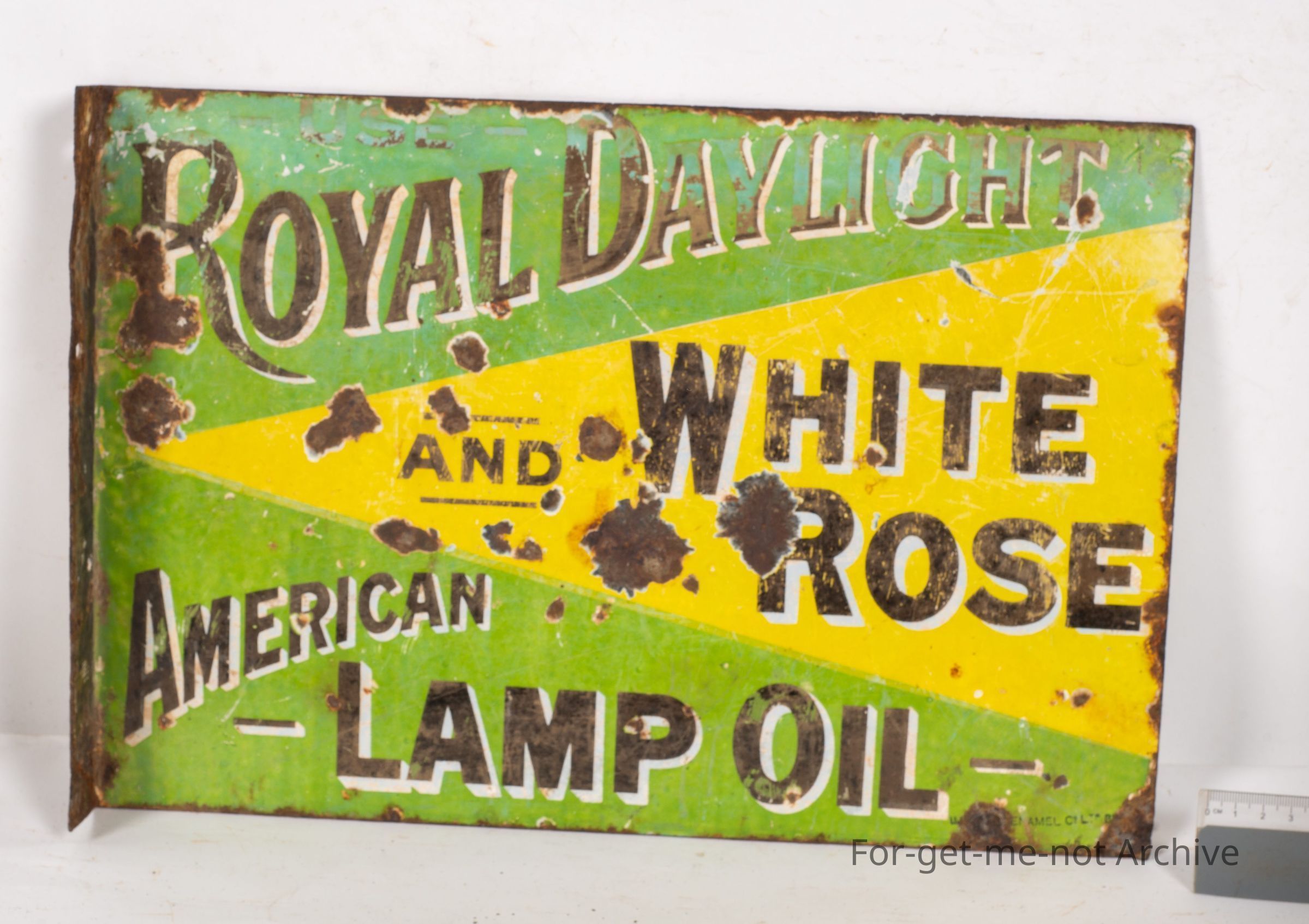 Sangeet Collection. This is a double sided enamel sign with a 90 degree bend. This one is advertising Royal Daylight Lamp Oil and White Rose American Lamp Oil on both sides. Been knocked around a bit, slightly faded. Early signCollection