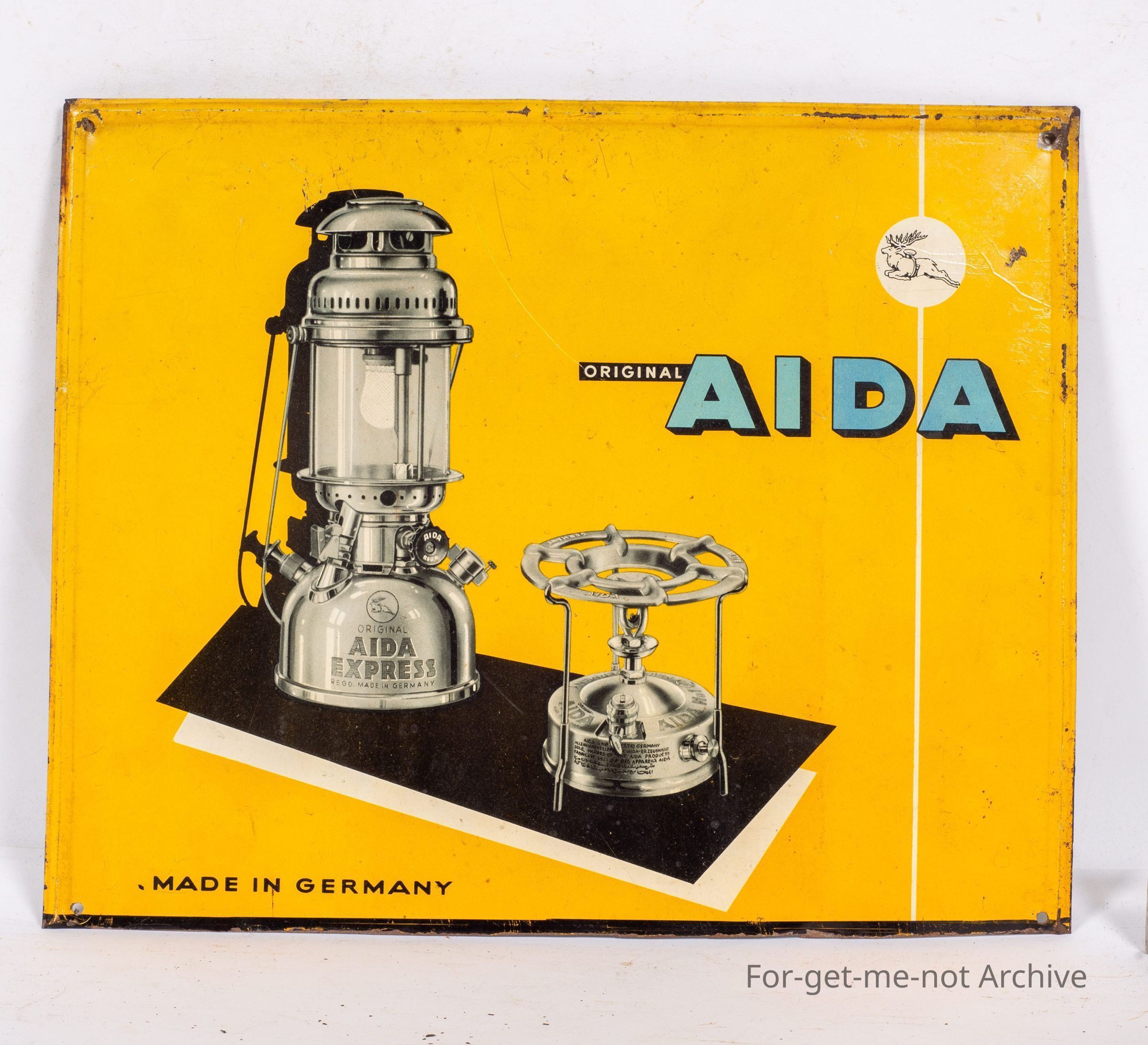 Sangeet Collection. This is a very light tin sign, advertising AIDA, pressure lamps with a light and a pressure stove. This is made in Germany. A nice little sign.