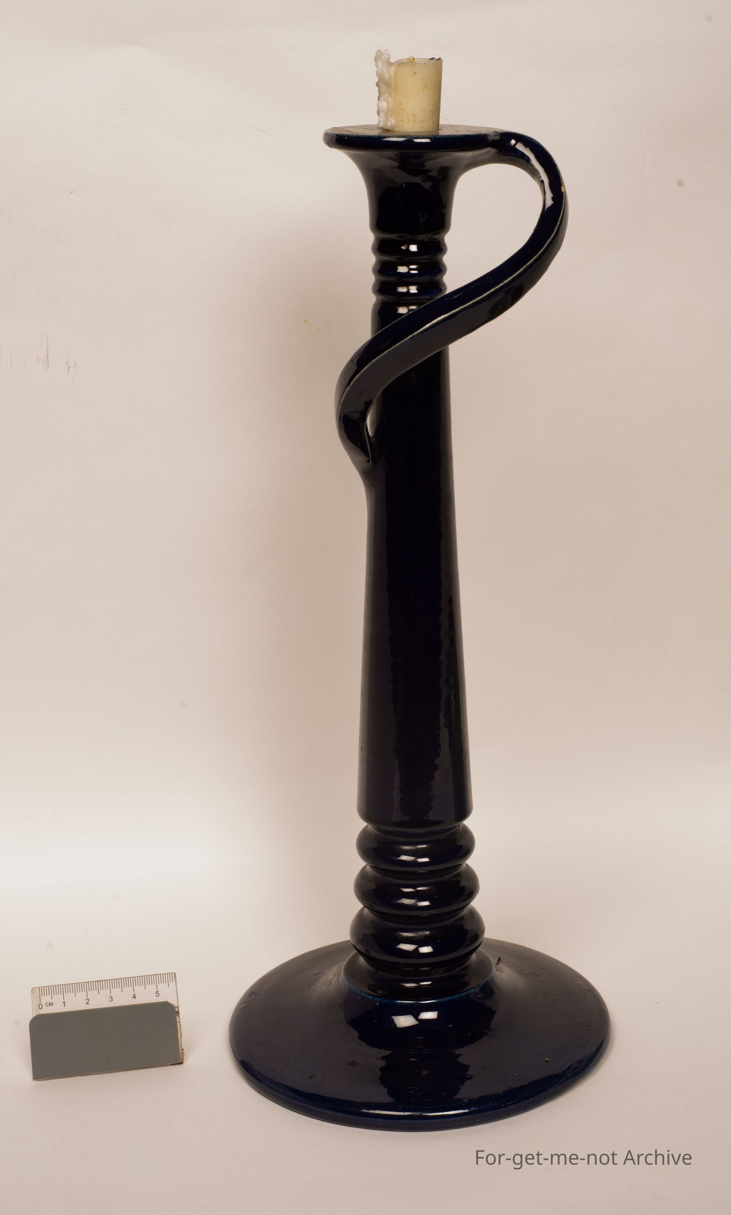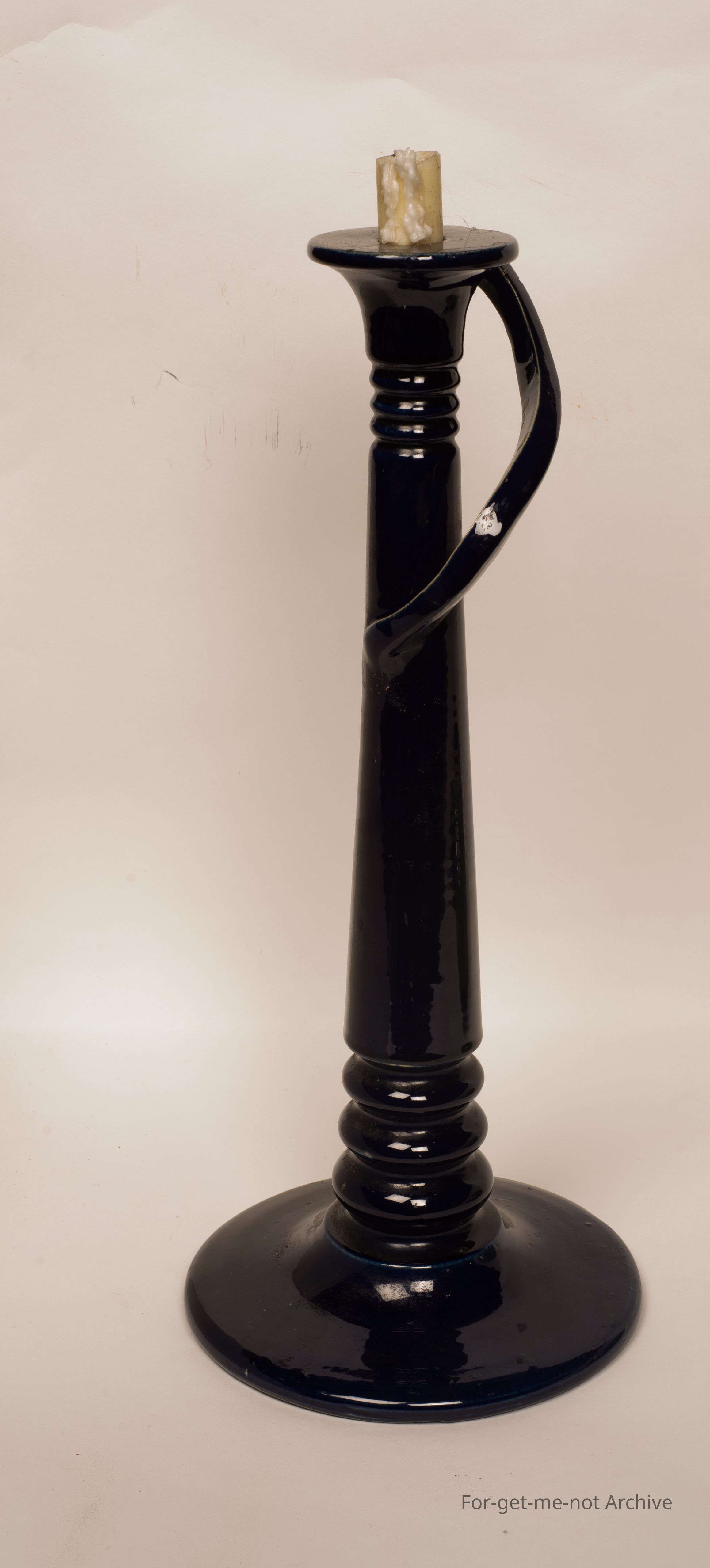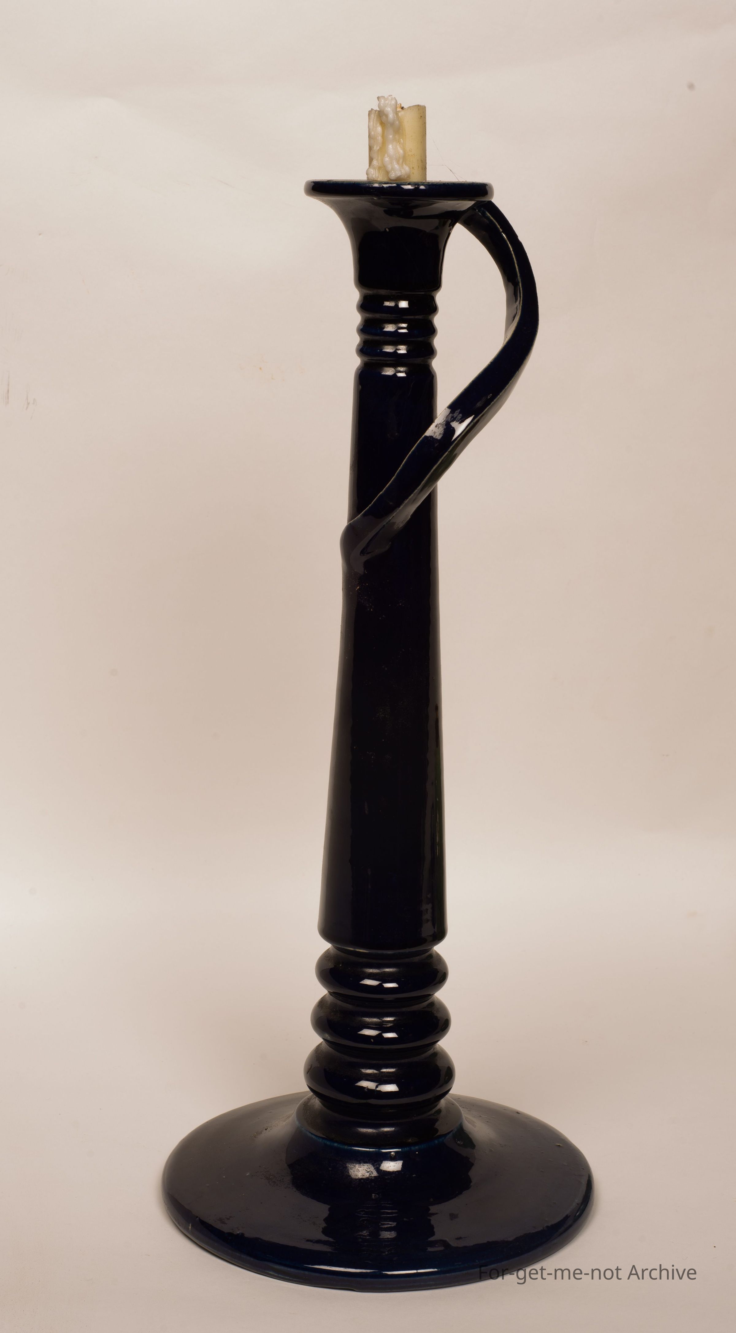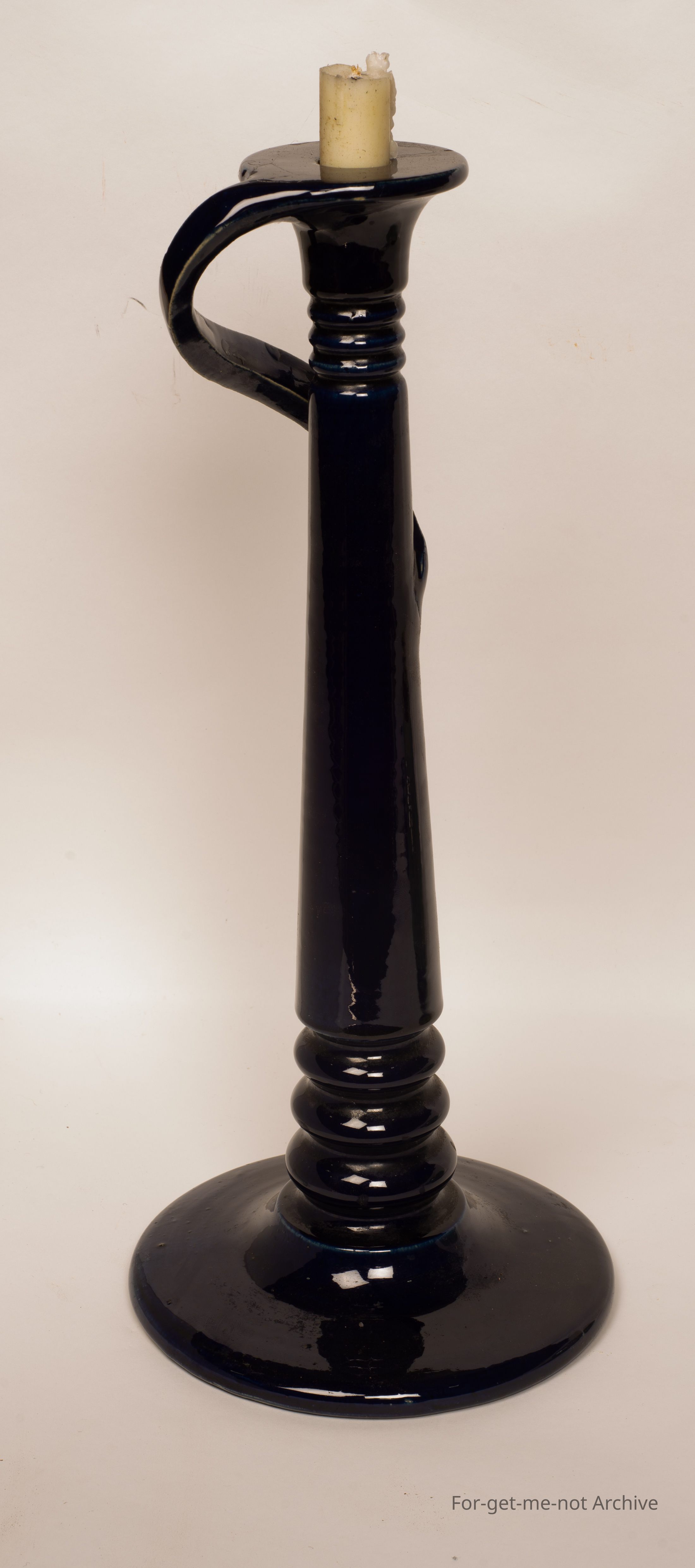 This is a large studio pottery candlestick, navy blue glaze, flamboyant, handle. Beautiful piece. The signature can't be deciphered. It has been suggested that it is Bosley South Australia.Collection