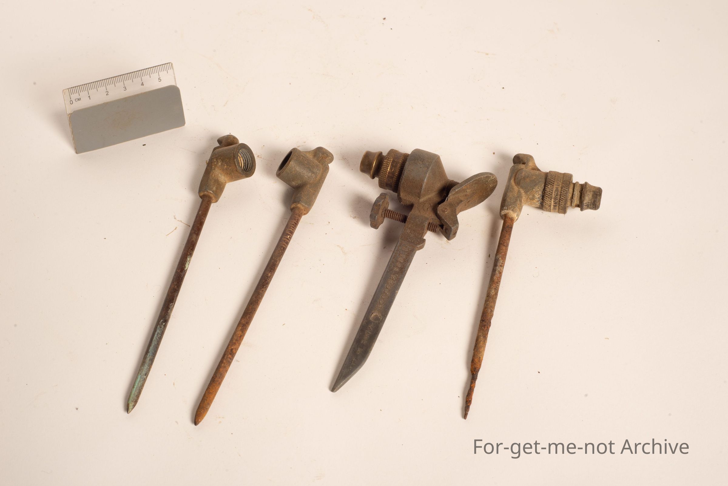 These are 4 lawn sprayers that with a steel pin that are pressed into the lawn to, work up garden patches or what have you. 1 is a pulp product. The others don't have names.Collection