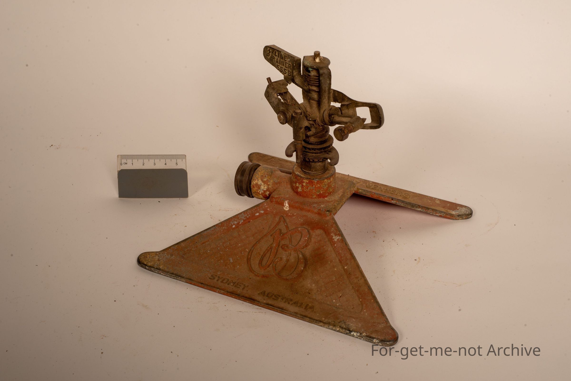 This is a cast, a lawn sprinkler, stamped, j b, preps. Well, it's Buckner Australasia. Made in Sydney, Australia. Very complex looking, sprinkle on the top.