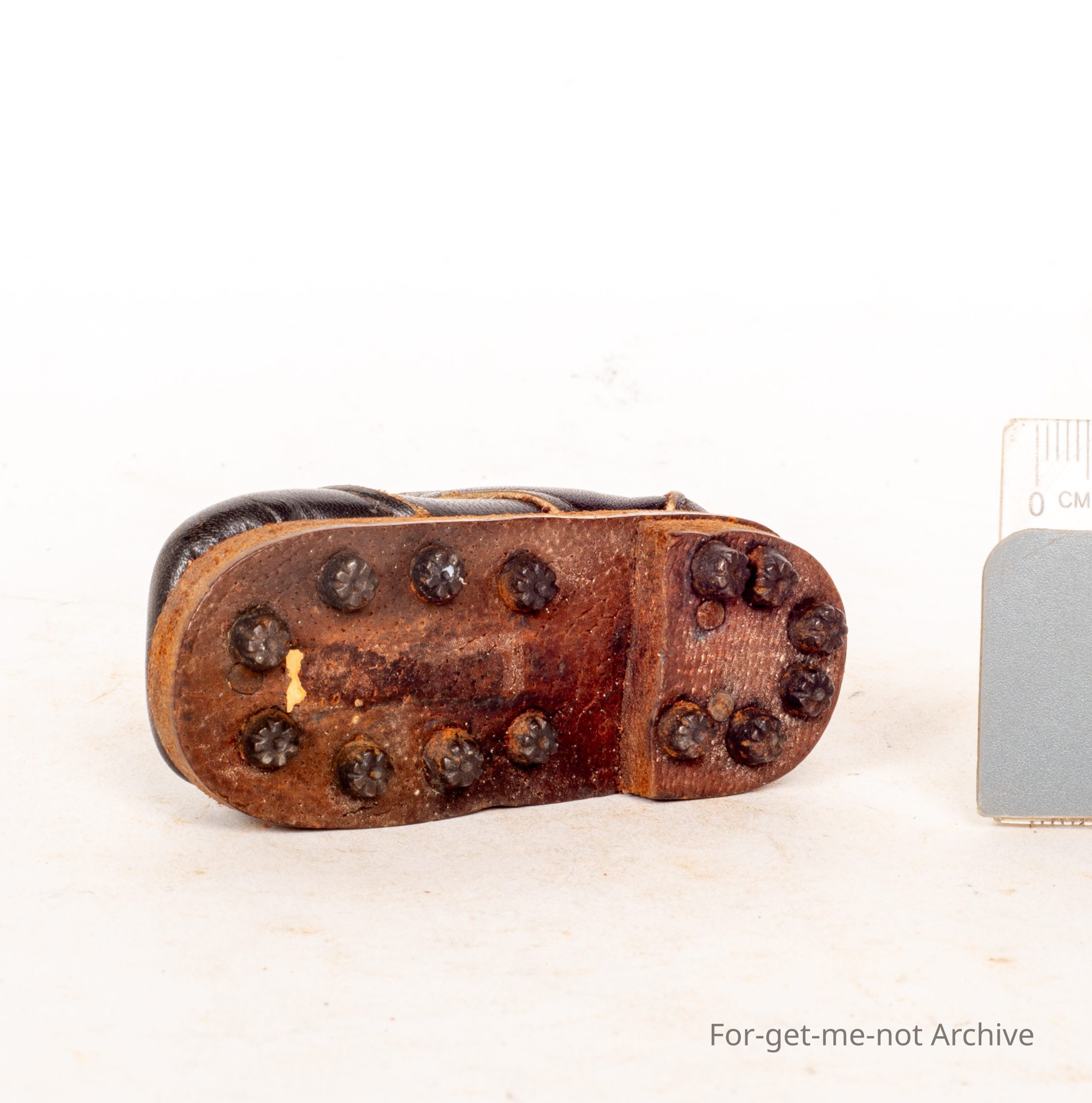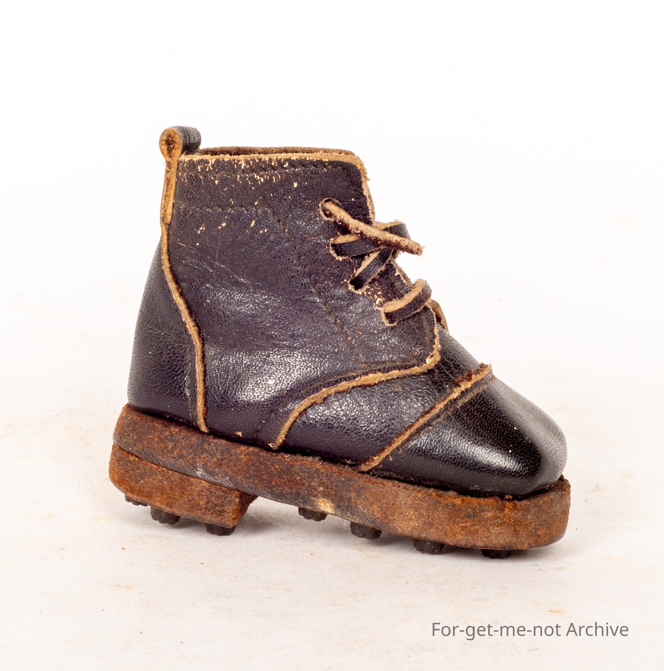 This is a beautiful little leather boot, like a heavy workman's boot, leather sole, studs in the bottom of, decorative steel, has a lace and everything. These were used as fundraisers during the first royal war. Very hard to find one in this pristine condition.Collection