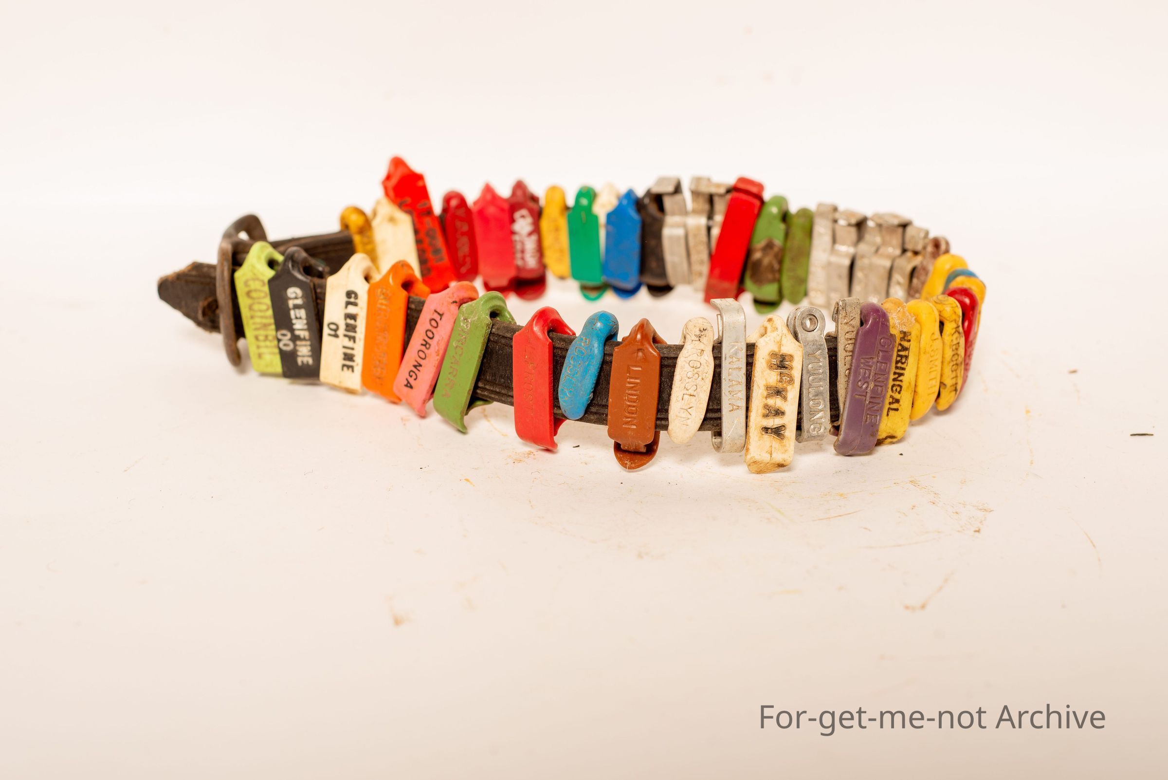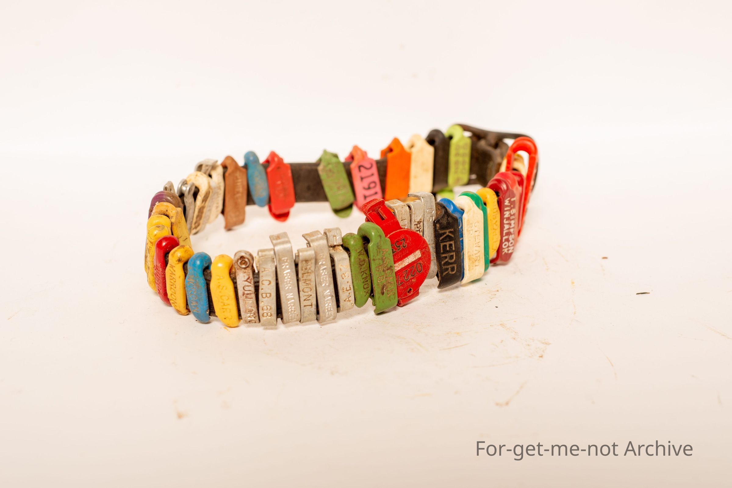 This is a, the collar from a dog, a leather collar with various ear tags from various properties, strung around it. Interesting,