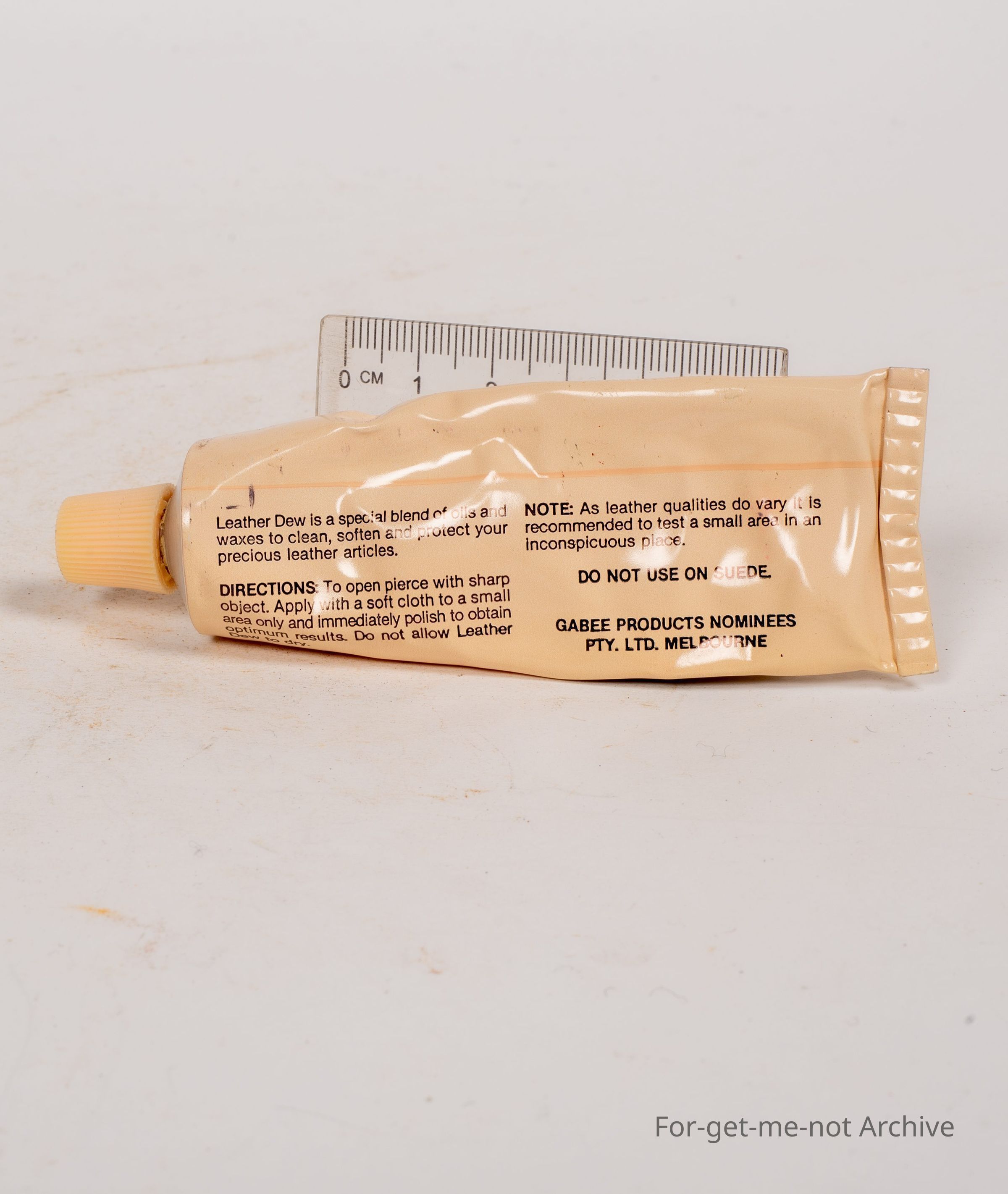 A tube of leather dressing, , Leather Dew, Cleans, softens, protects. Do not use on suede. Made by Gabby Products Melbourne.