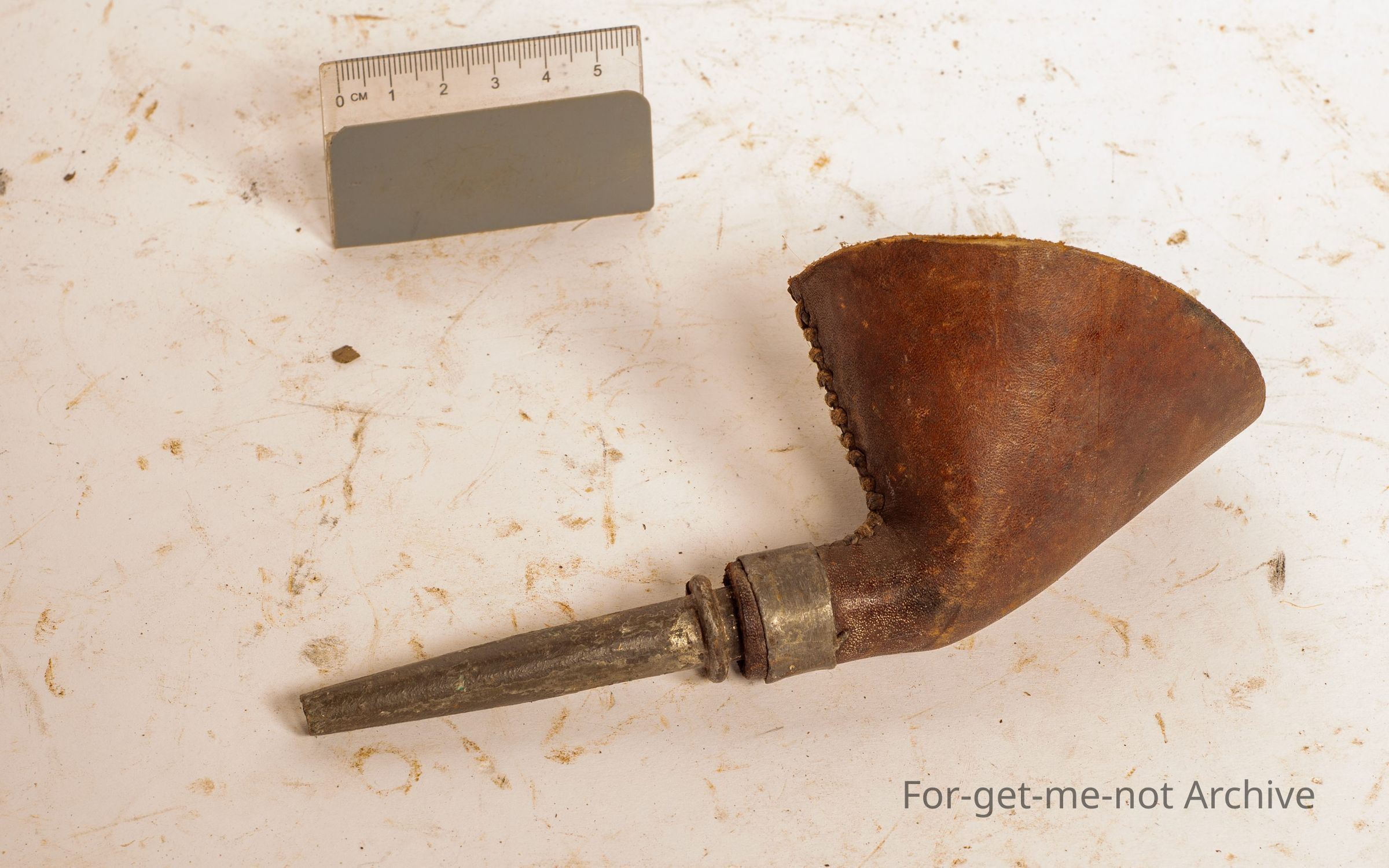 This is a leather funnel on a tin spout. This is believed to have been used, First World War to flush out the barrel of 303 rifles, as part of the maintenance. It's in good order,Collection