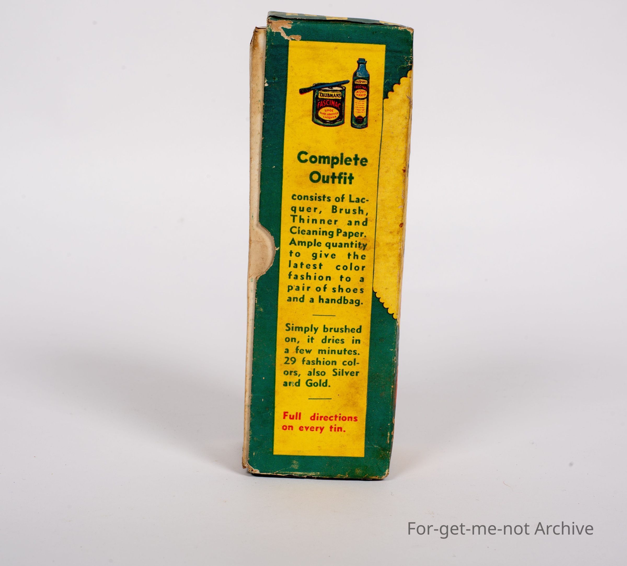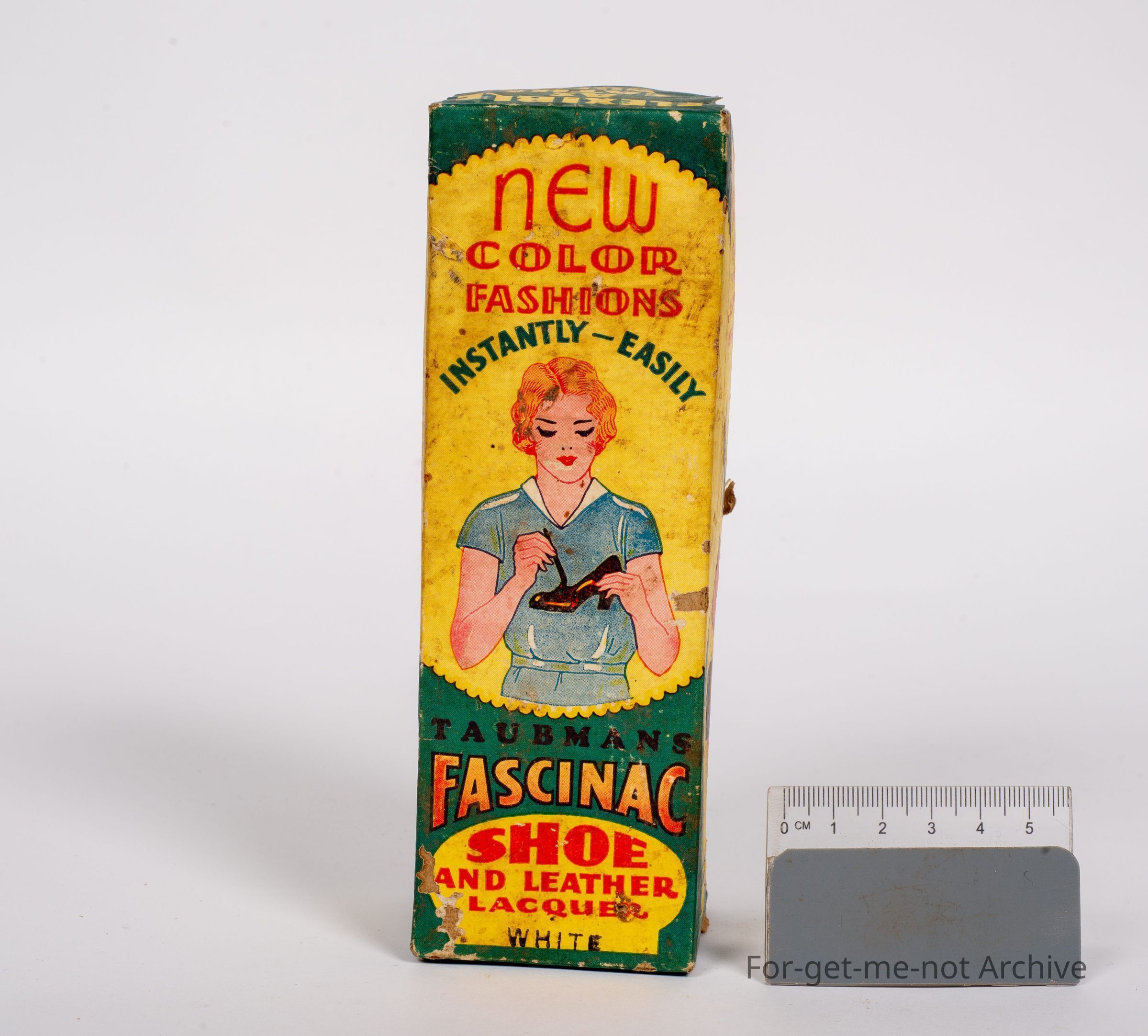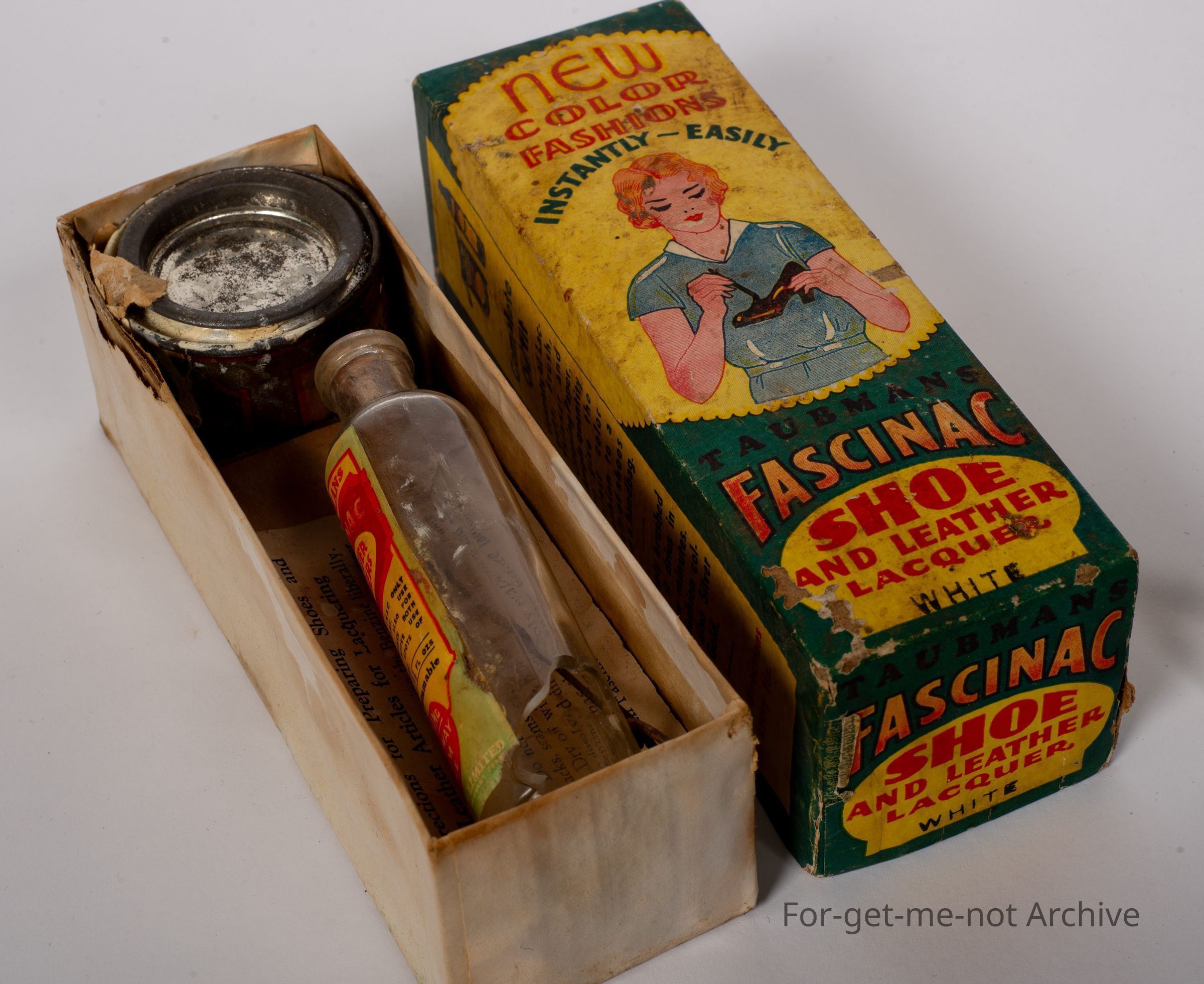 This is put out by Taubman's shoe and leather lacquer white. An unusual product, with graphics of a woman painting a shoe. This was for all leather articles. Probably quite an unusual piece from Taubmans,Collection