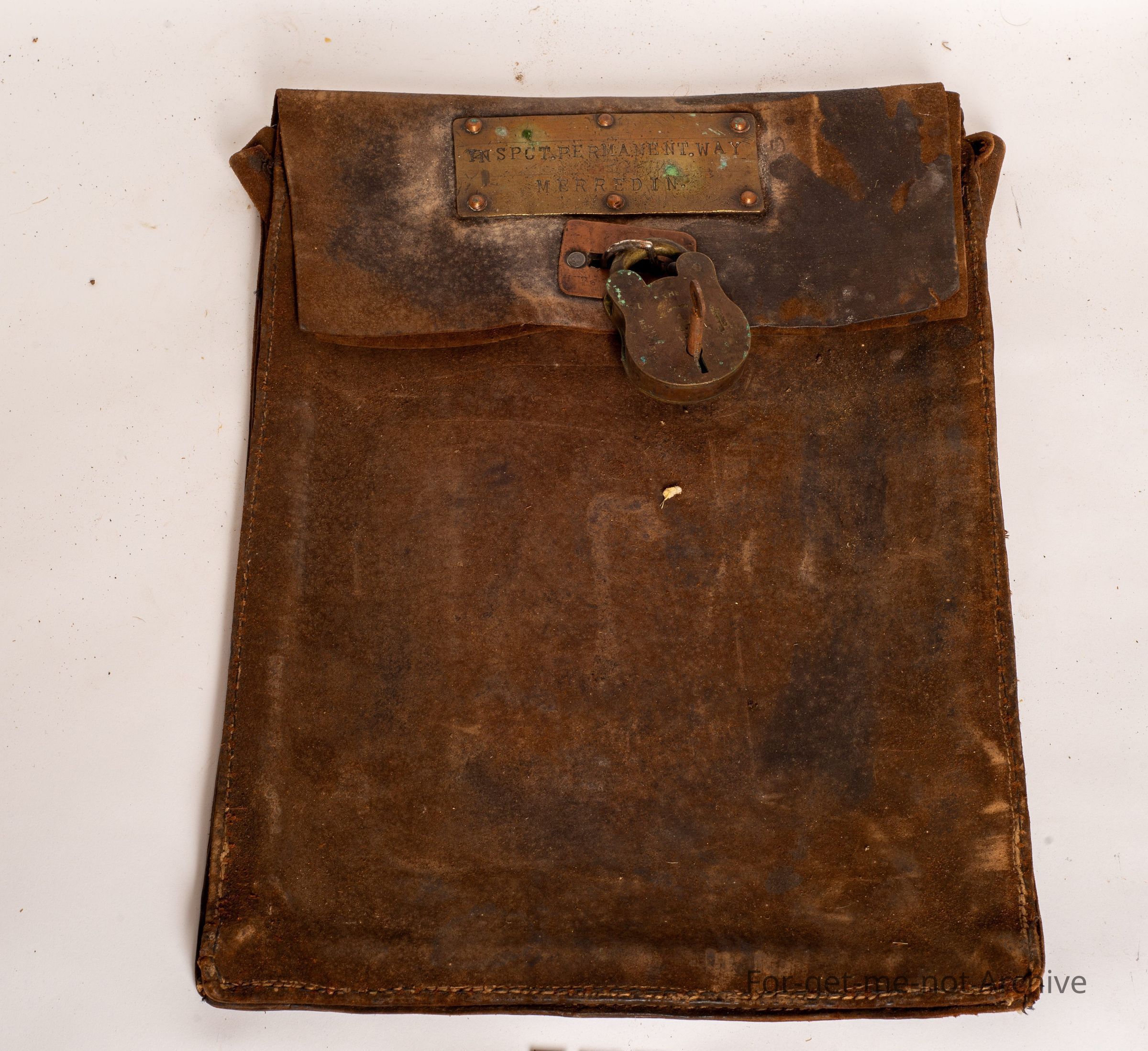 This is a leather pouch with a brass, riveted plate on the top, which says Inspect Permanent Way, Meriden. This was, in fact, the money bag that was used to drop the payoff at various, railway stations on the way to Meriden. Origins of Western Australia with a nice brass lock, just a bit of historic railway, memorabilia from Western Australia.Collection