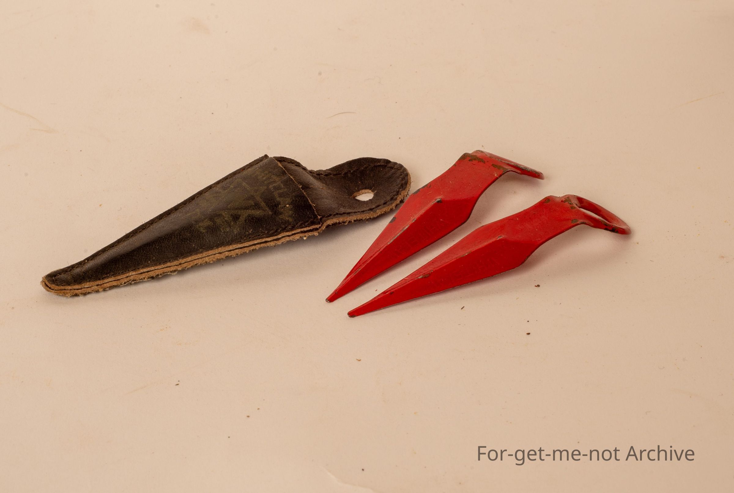 This is a little leather pouch of golf tees by Whitlaw.. Has 2 metal golf tees that are on an angle. The idea is that when you supposedly hit the ball, that the little tees are neither bent nor lost. Little leather pouch that buttons onto a shirt pocket or somethingCollection