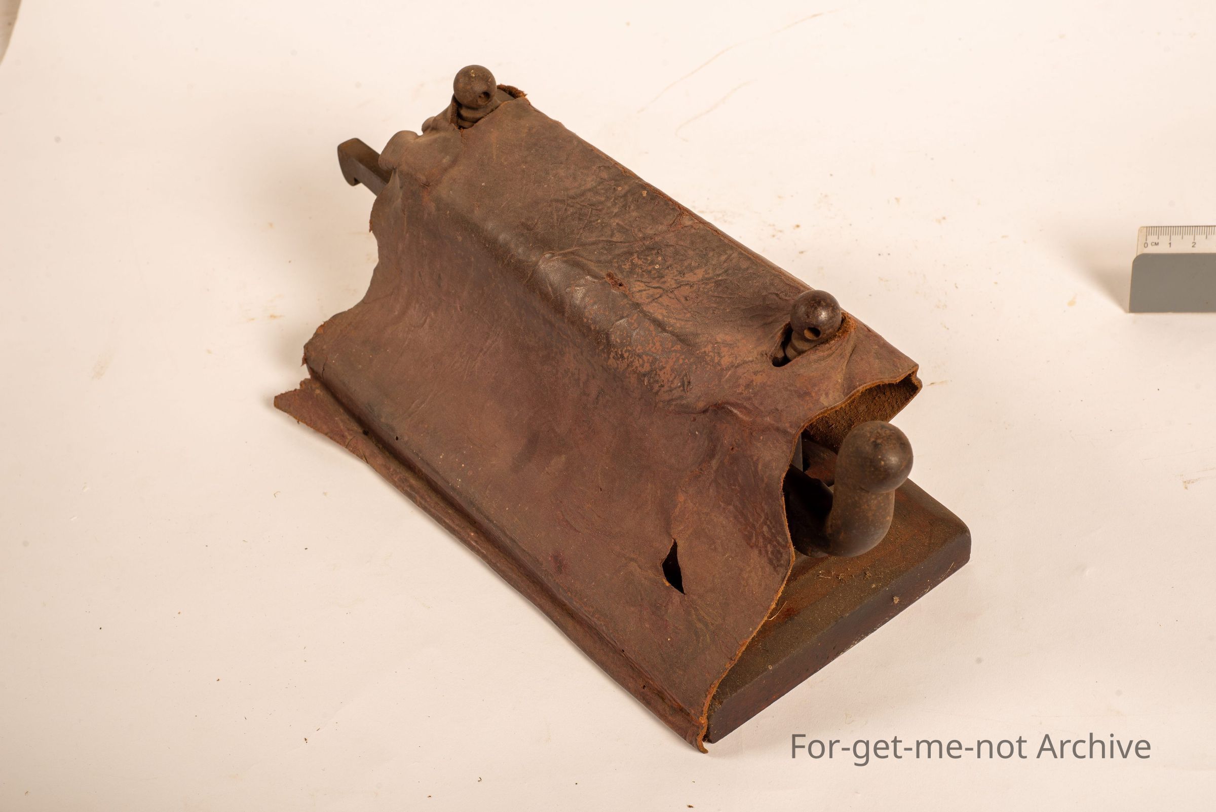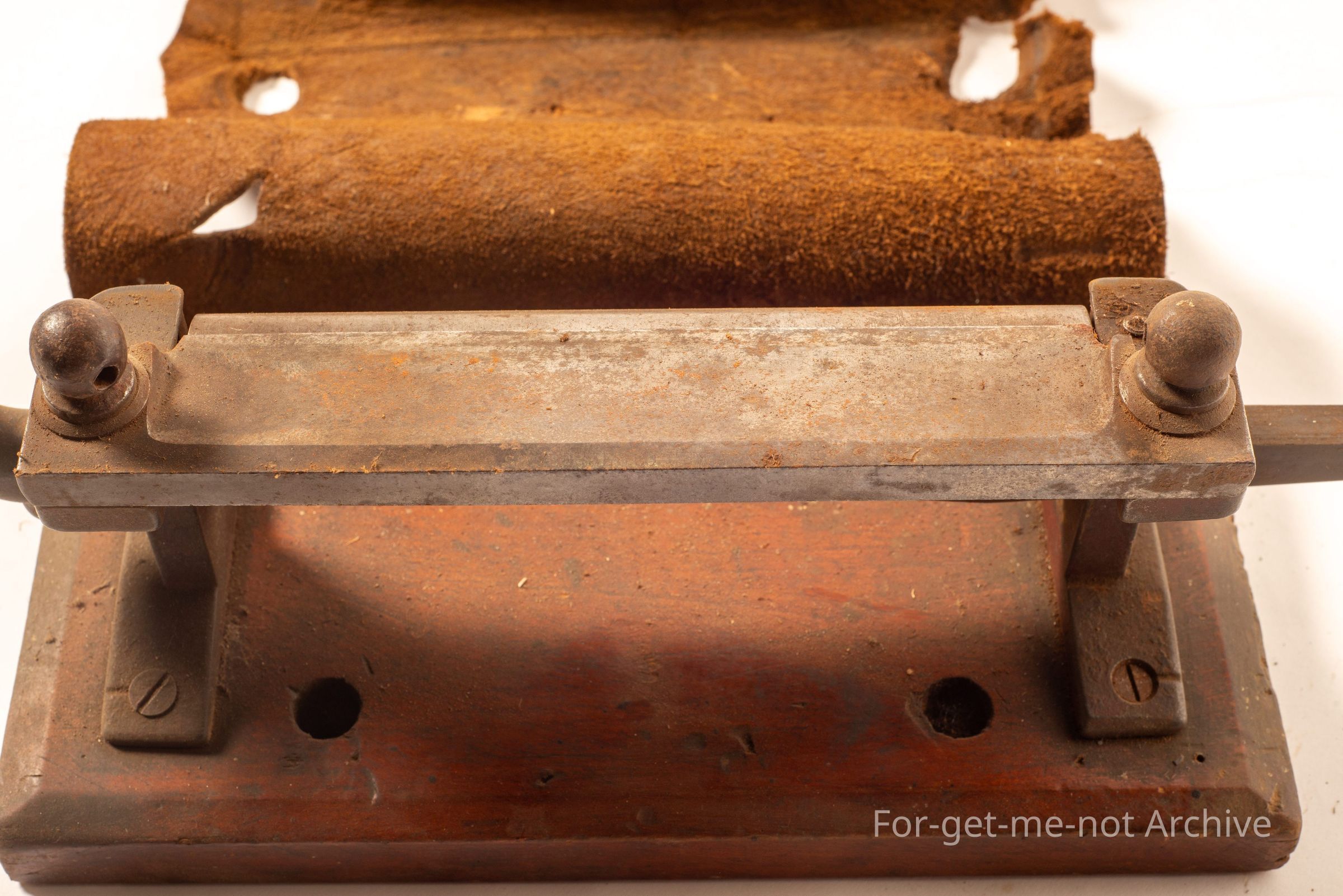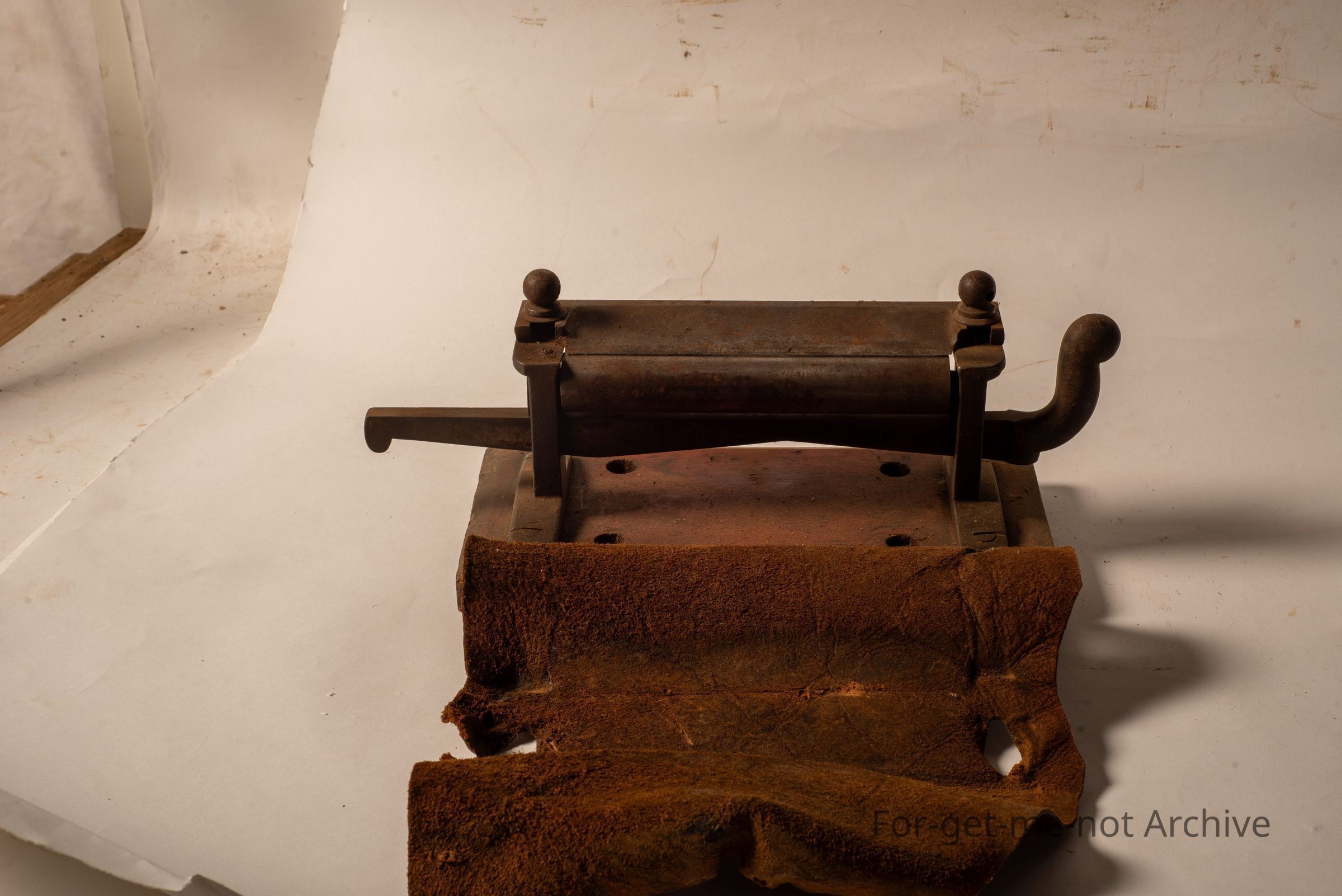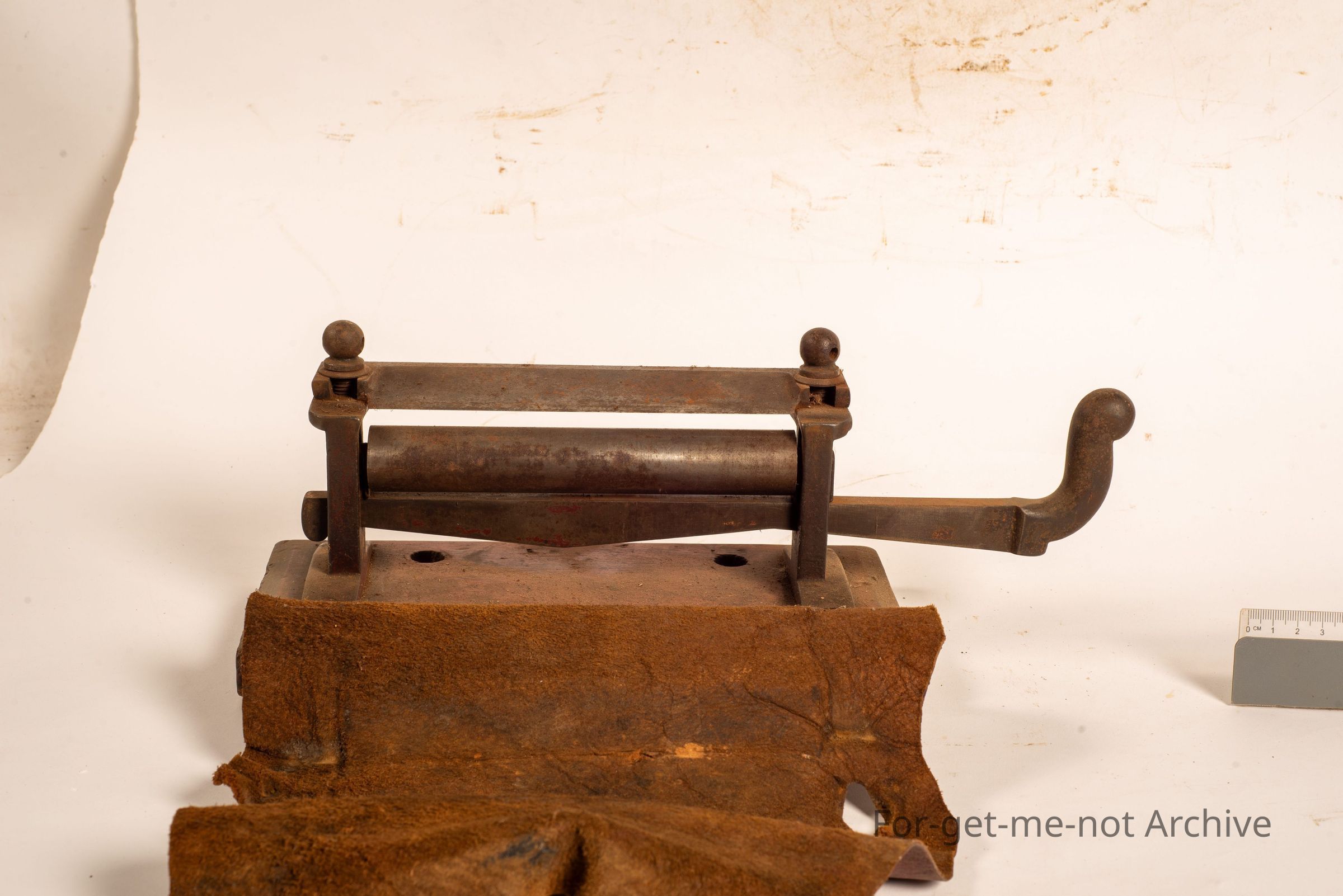 This is, possibly from a harness maker or a boot maker. It's, known as a leather thinner. So the leather was pulled through, under the blade, and as it went, it shaved the profile of the leather into a thinner foil. Quite a scarce machine. This one is in really good condition.Collection
