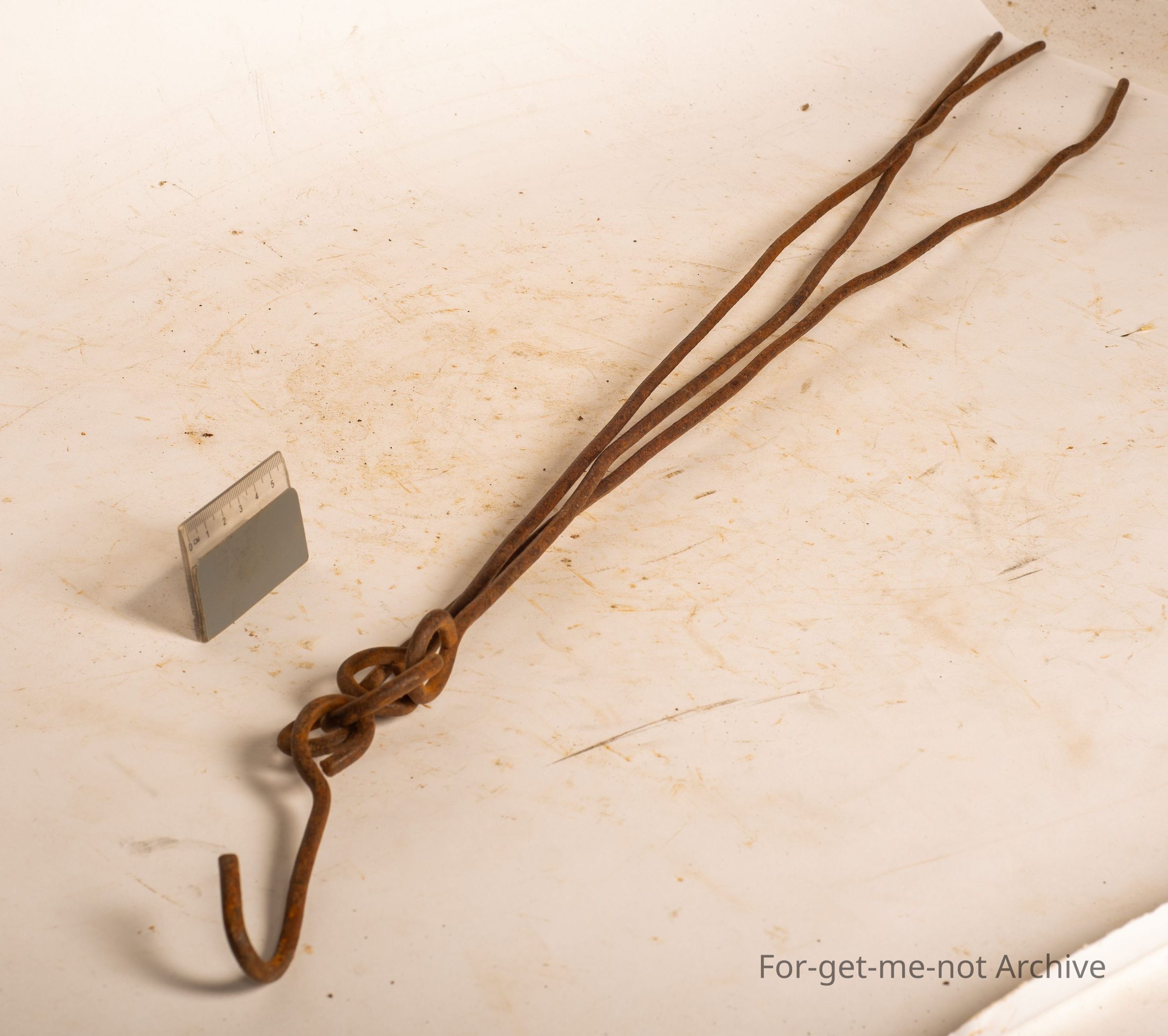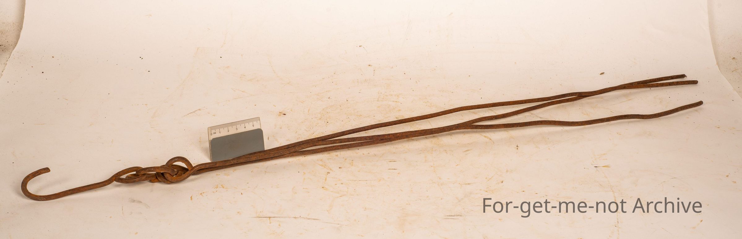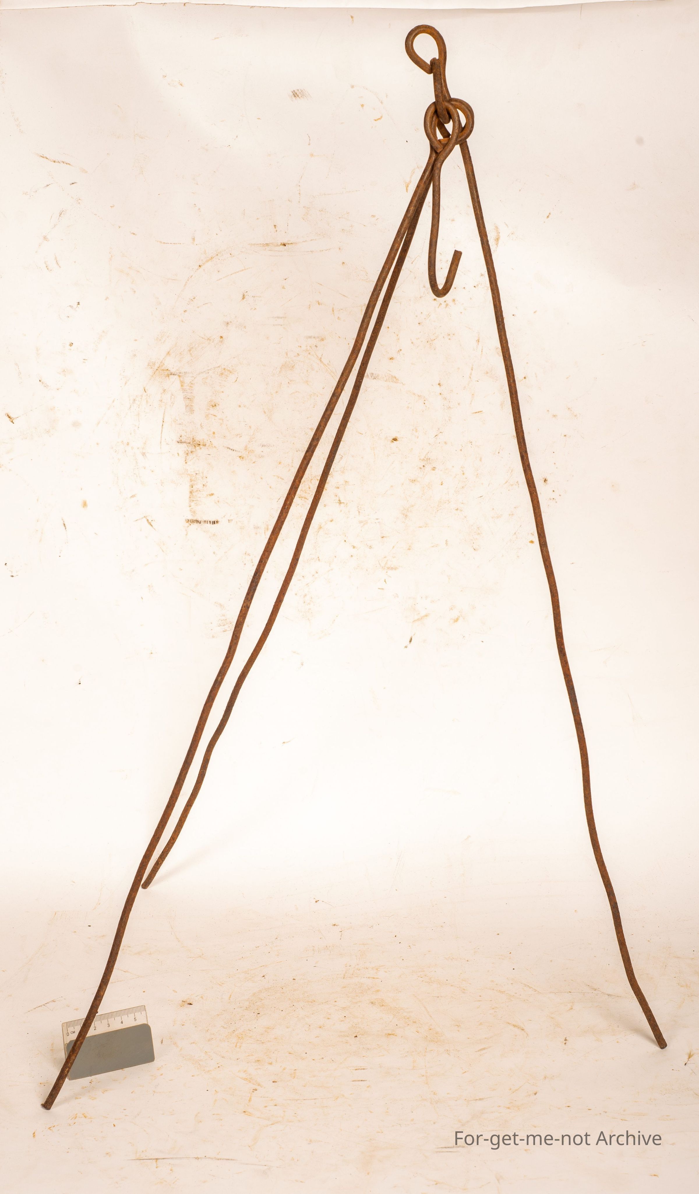 This is a small homemade 3 legged tripod with a hook on the top. This would have been used on the campfire, to hang a cooking pot or a kettle on. Very basic, but a classical early piece of bushcraft.Collection