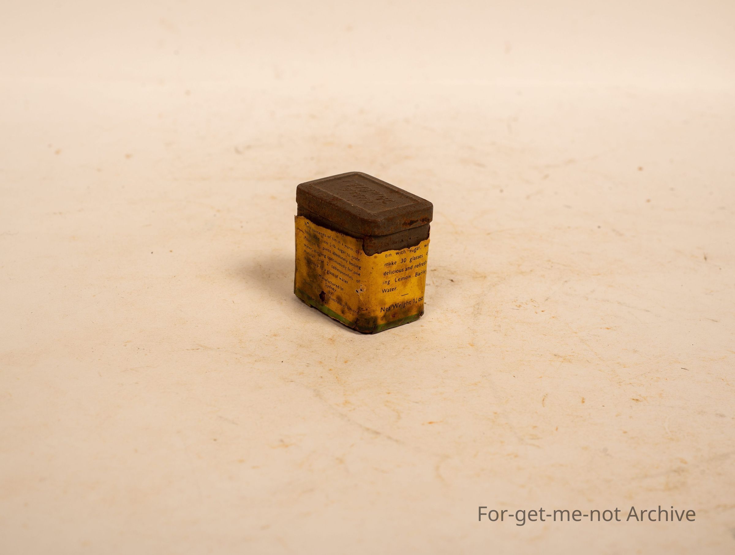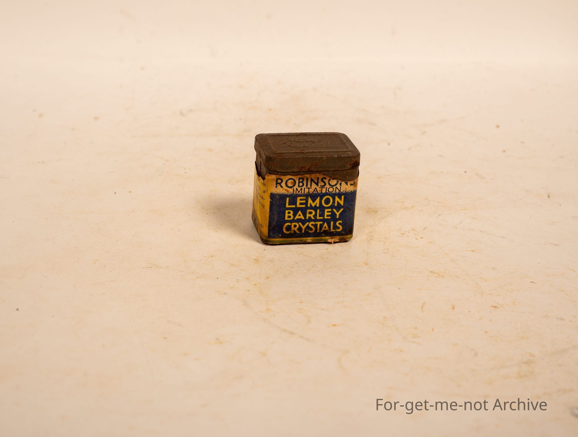 Small tin of Robinson's imitation lemon barley crystals. Probably a pretty old tin, showing its age