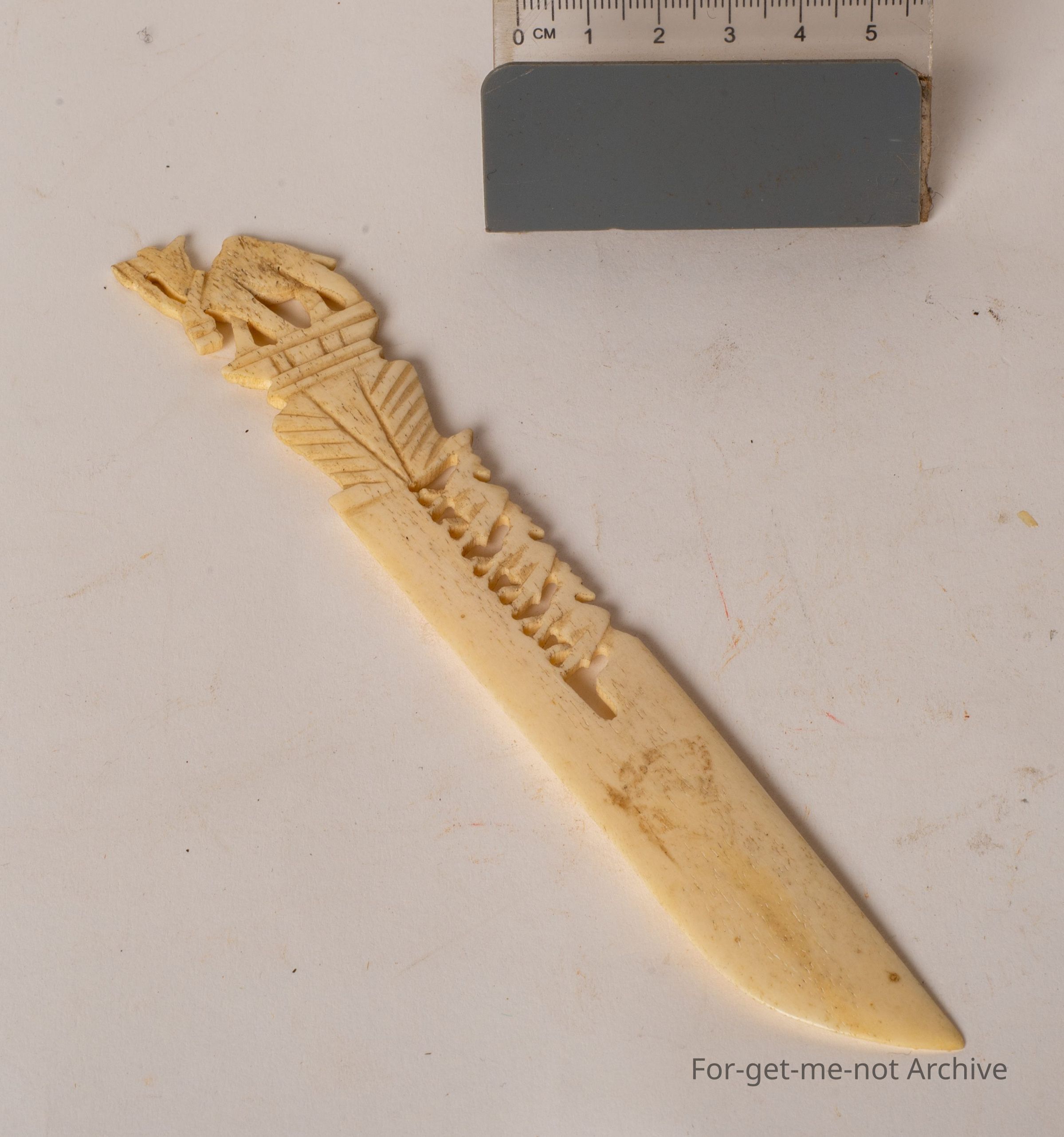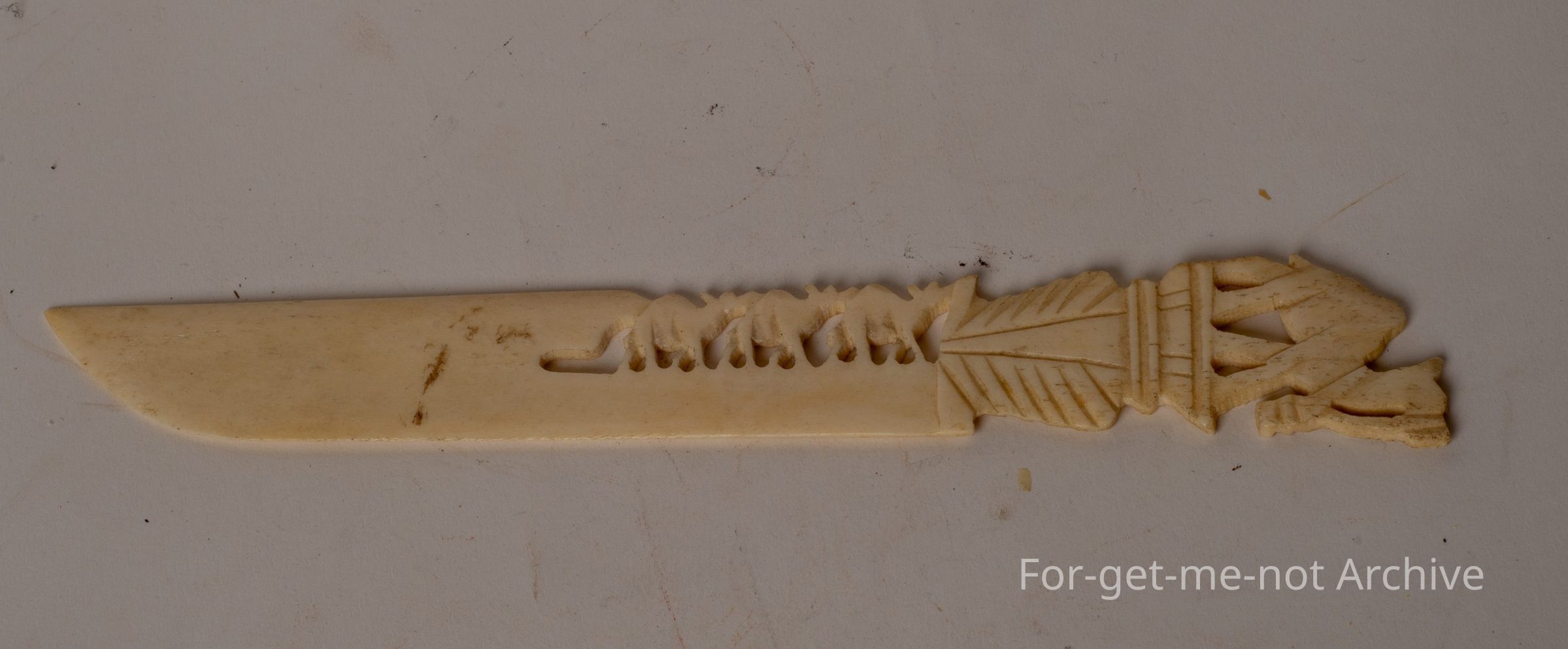 This is a beautiful little, maybe ivory or bone letter opener. The feature of this is it has carved camels, 1 on the end of the handle, 3 more in a camel train following. Lovely piece.Collection