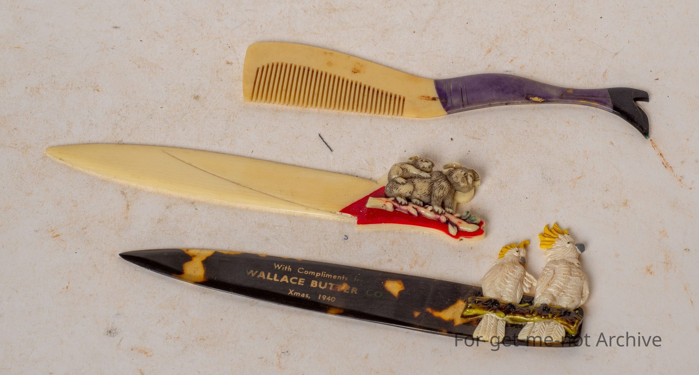 This is a little letter opener with compliments from Wallace Butter Company, Christmas 1940, featuring 2 sulphur crested cockatoos. Wonderful piece. 2nd one, another letter opener, with a koala with a young koala on its back. Very Australiana. The third one is a comb, a hair comb in the shape of a lady's leg with a shoe. Wonderful little novelty piece.Collection