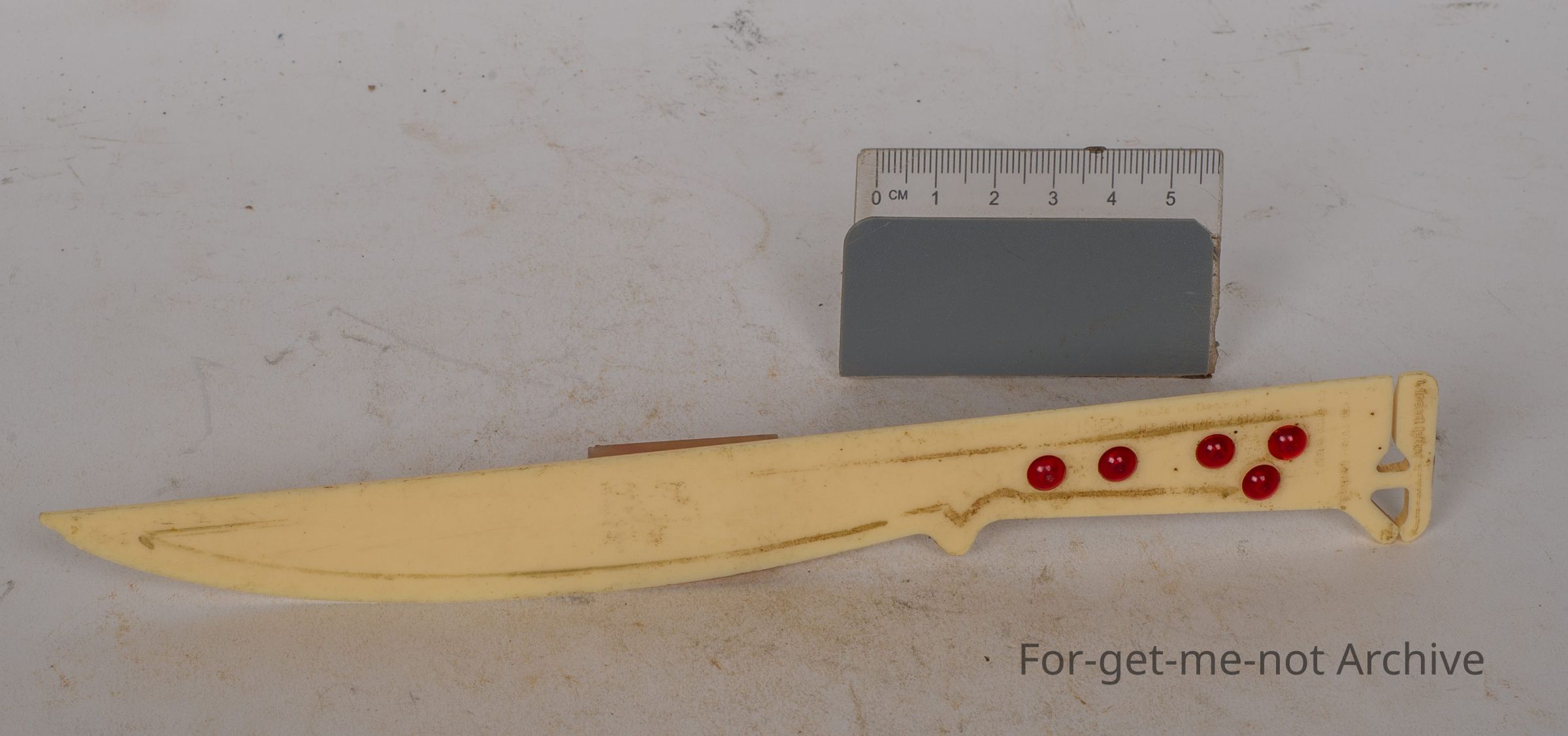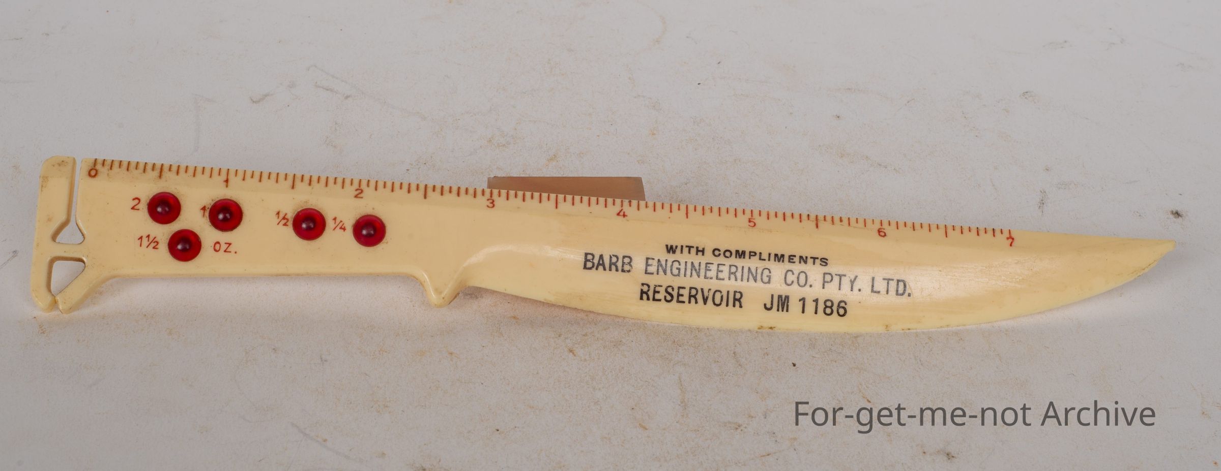 This is another letter scale of a totally different concept. This one, plastic. It works on a balance, say, on your finger. It has a slot for the letter, and when it balances level, the respective weight is shown on 5 different pieces, as to what the stamp's gotta be. It also seconds as a letter opener. Compliments Barbe Engineering Reservoir VictoriaCollection