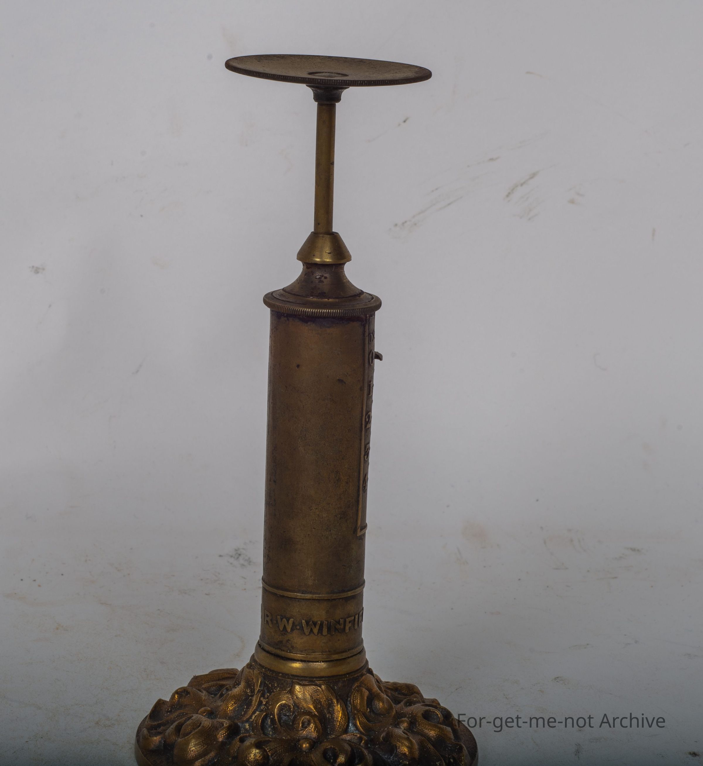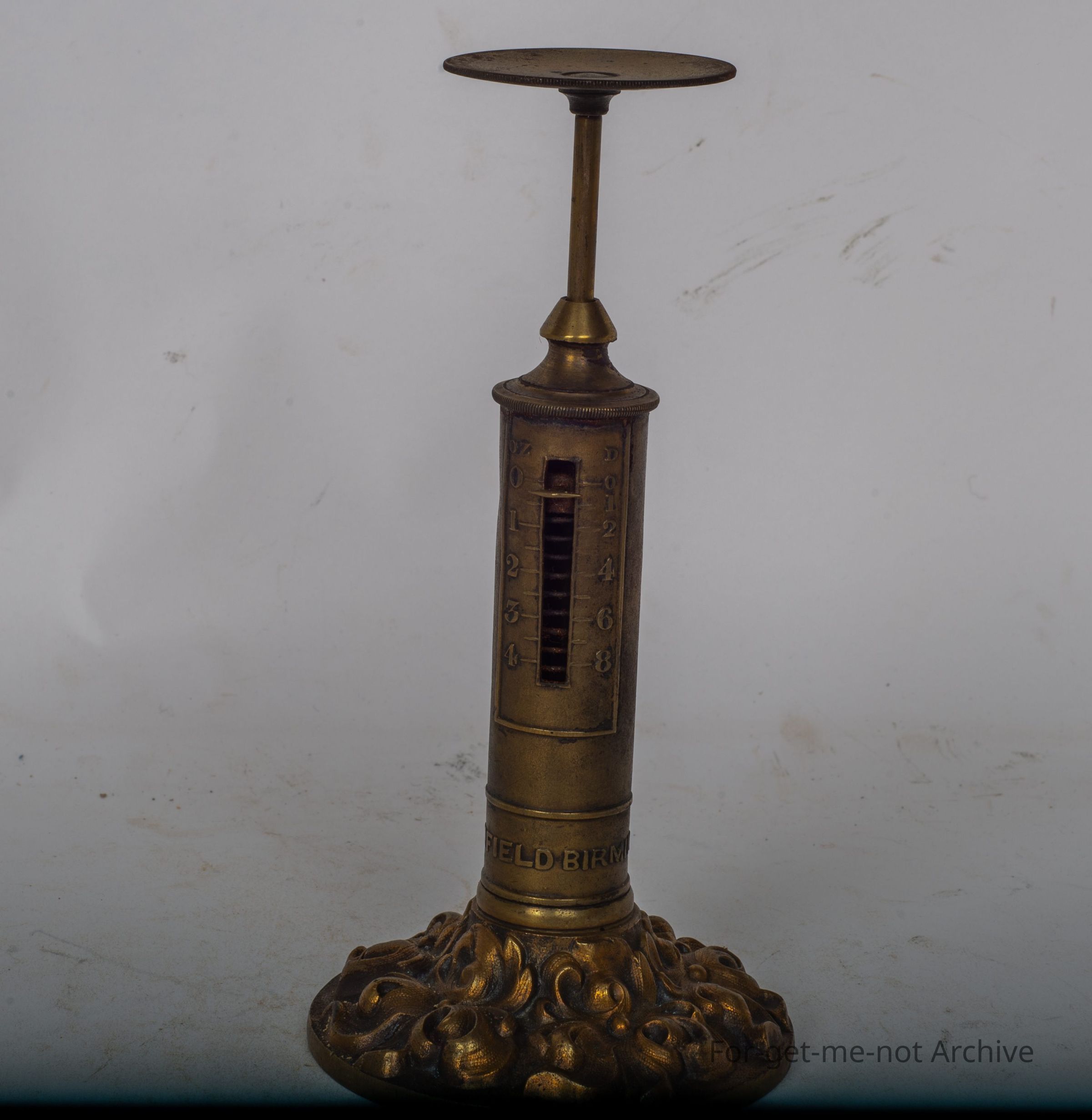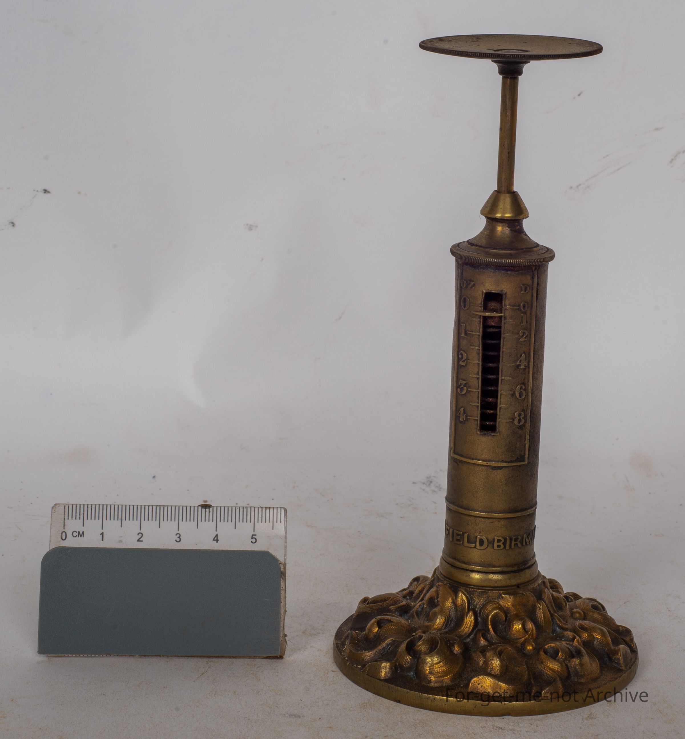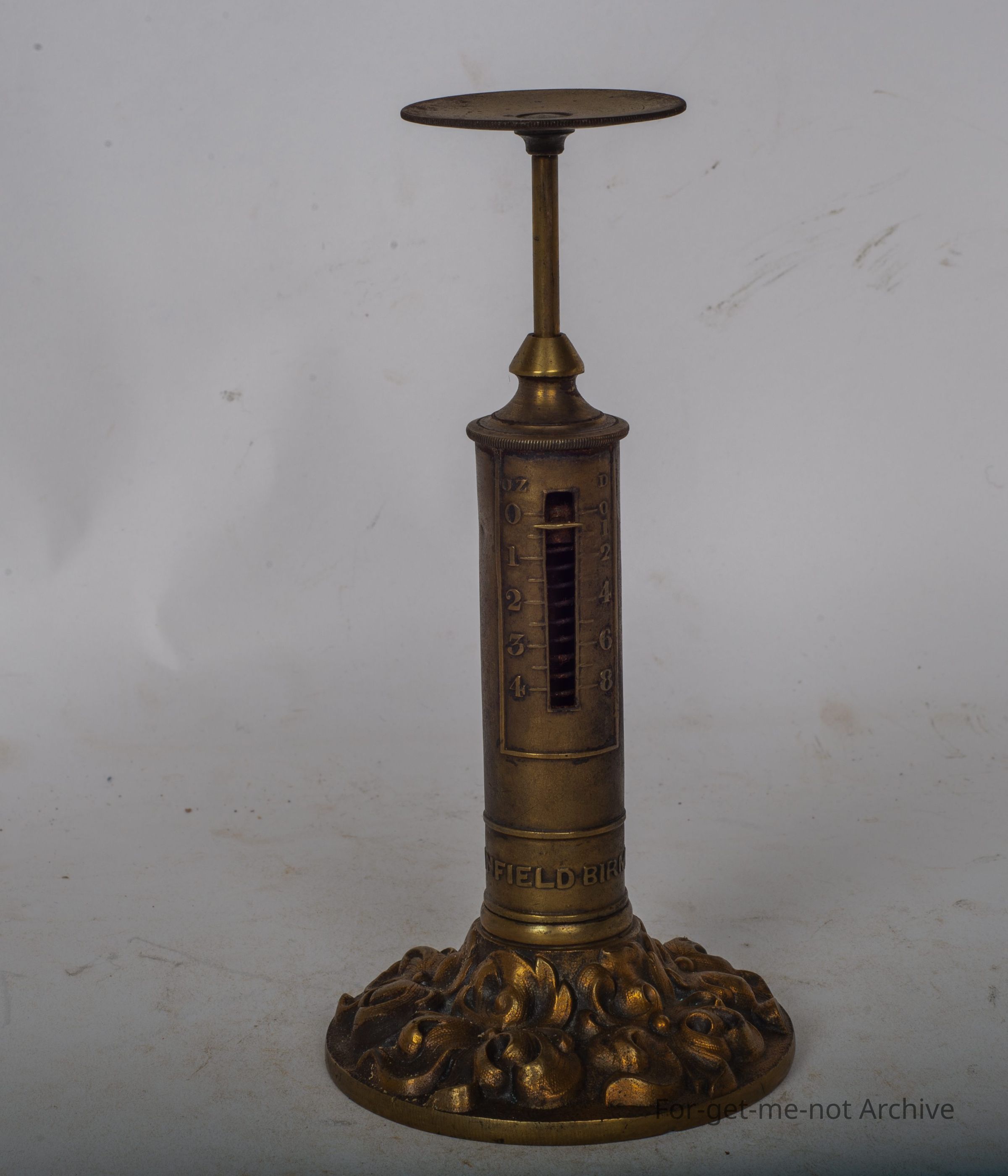 This is a beautiful little brass, letter scale, embossed RW Whitefield, Birmingham, little scale from, naught to 4 ounces, a little plate on the top to ship the envelope, cast brass baseCollection