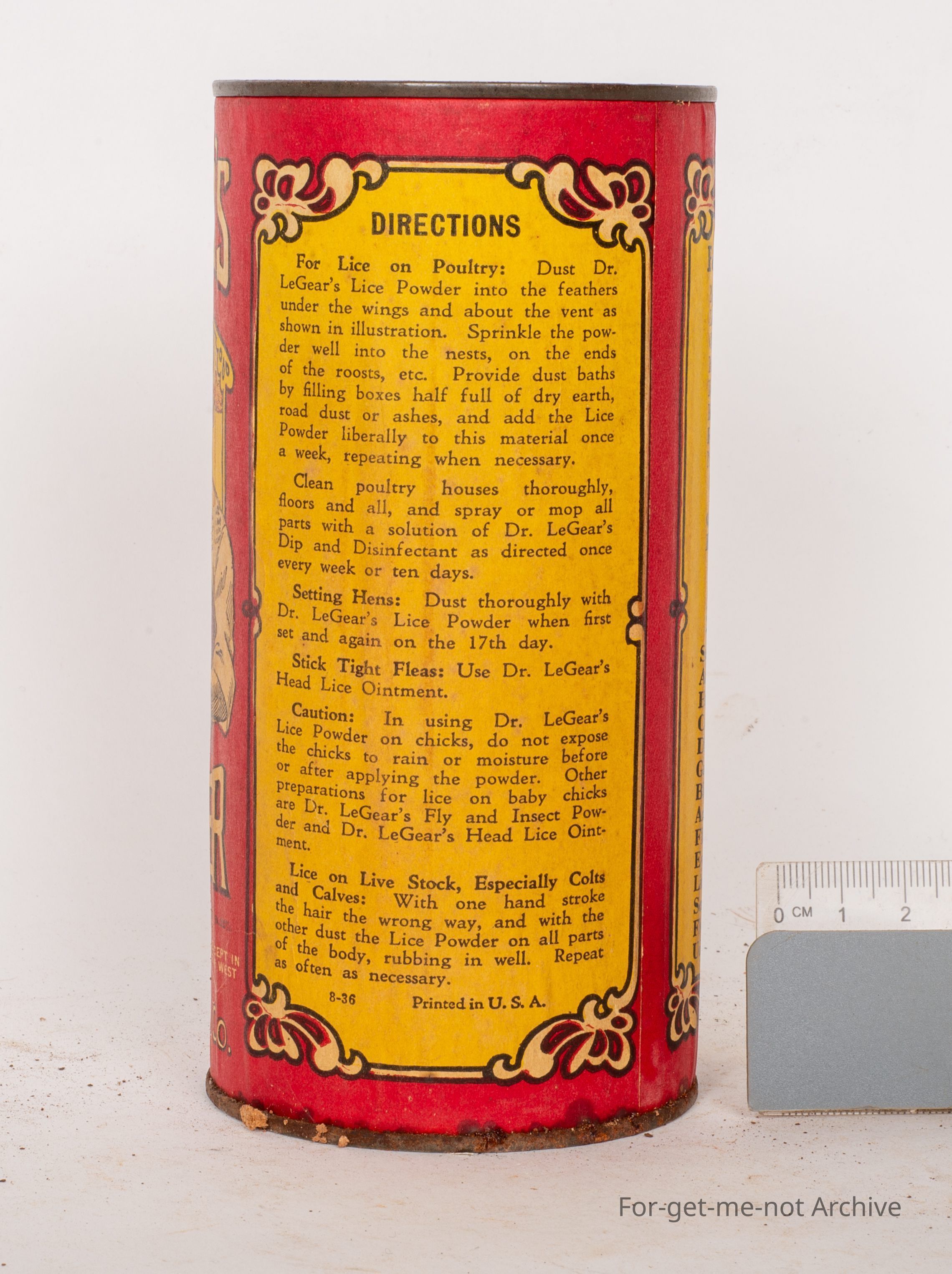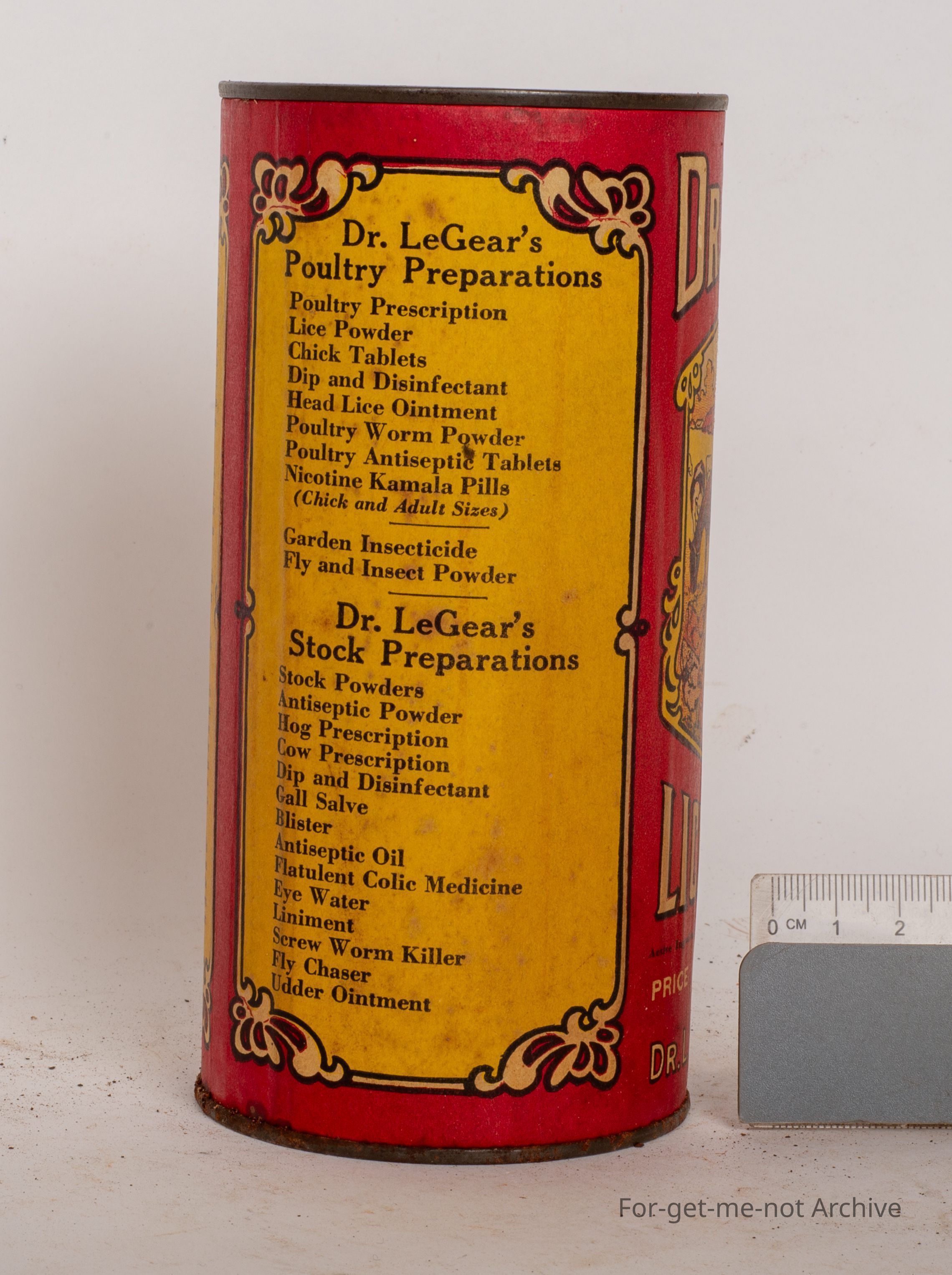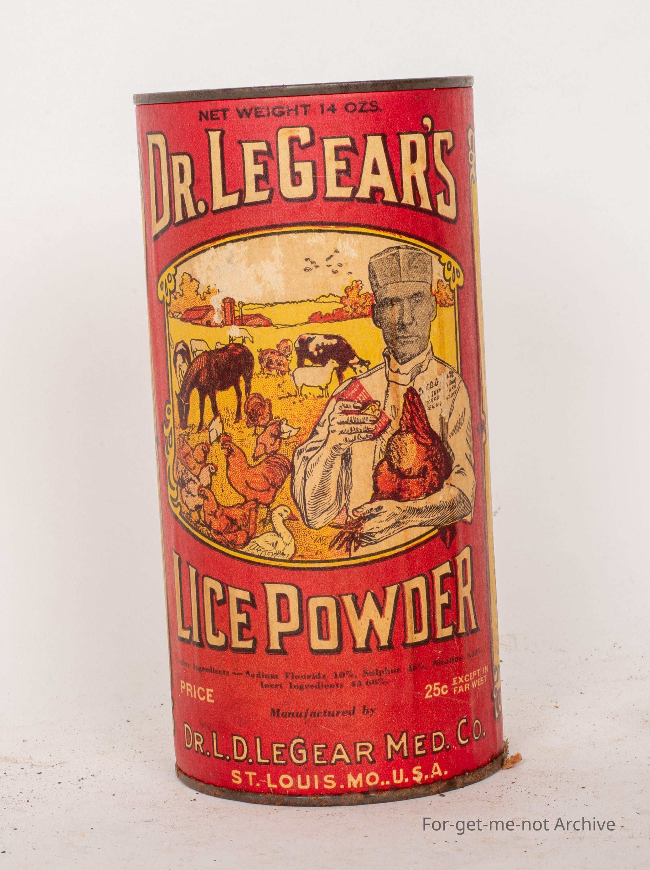 Doctor Laguerre's lice powder Paper label, beautiful condition, fixes lice in poultry, chick tablets, all the different products, plenty of directions, with a photo of doctor Legere and the chooks and all the animals around him.Collection