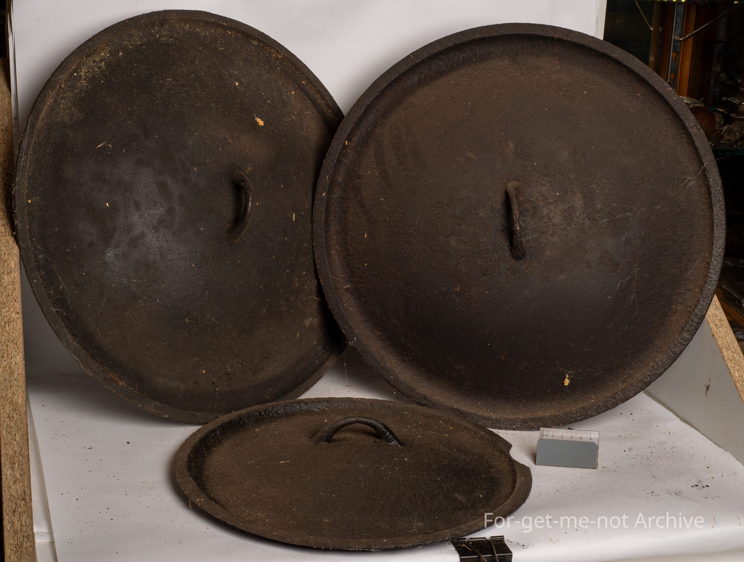 These are three lids from, camp ovens. There would be 2 about 18 inches and a smaller one of about 14 inches wonderful collectible pieces. Very, very hard to find.