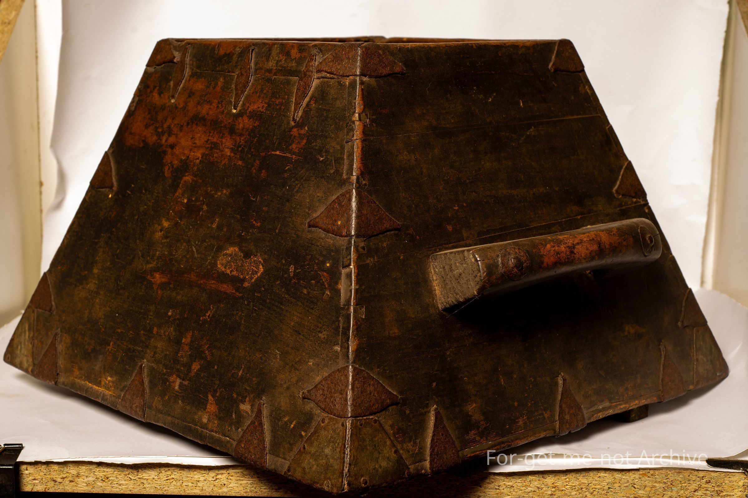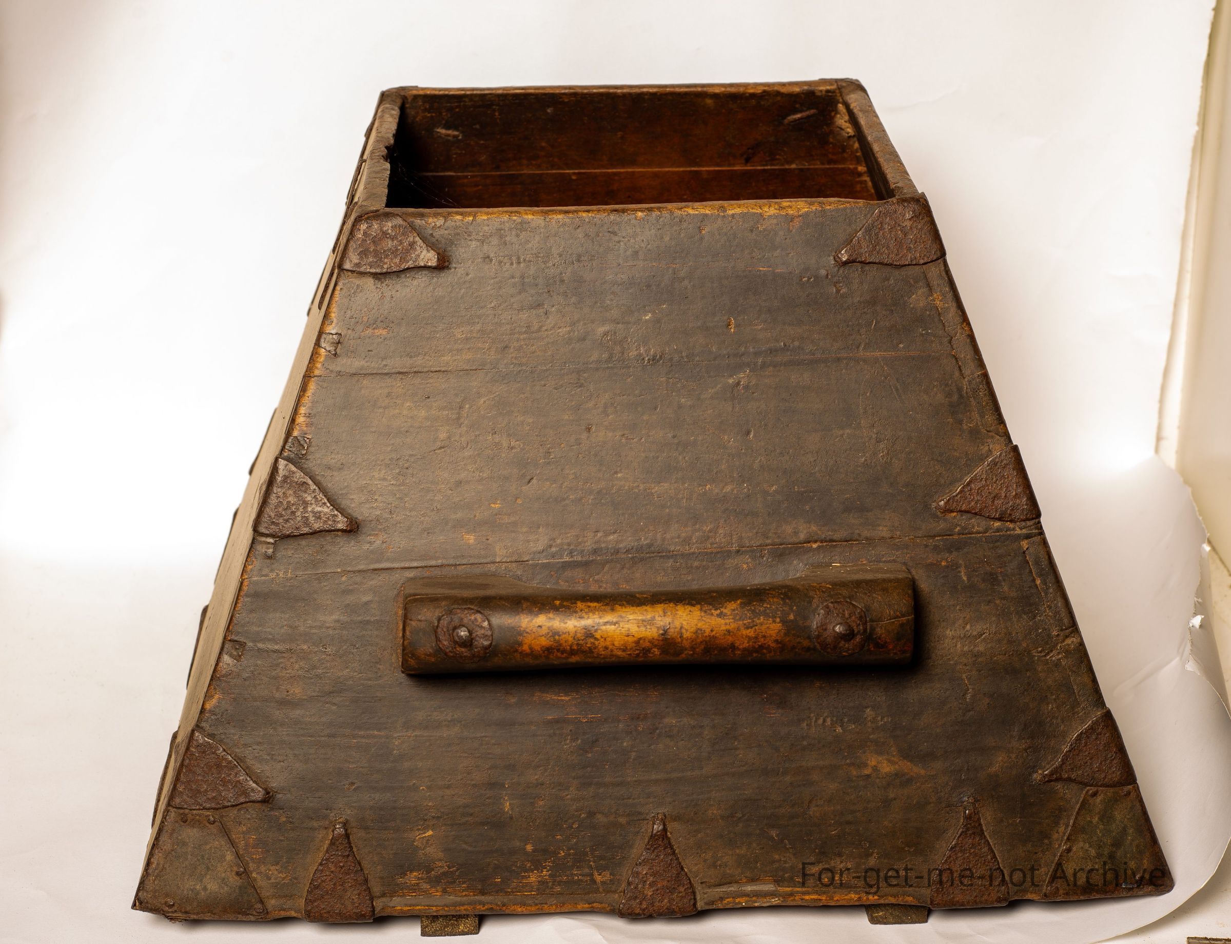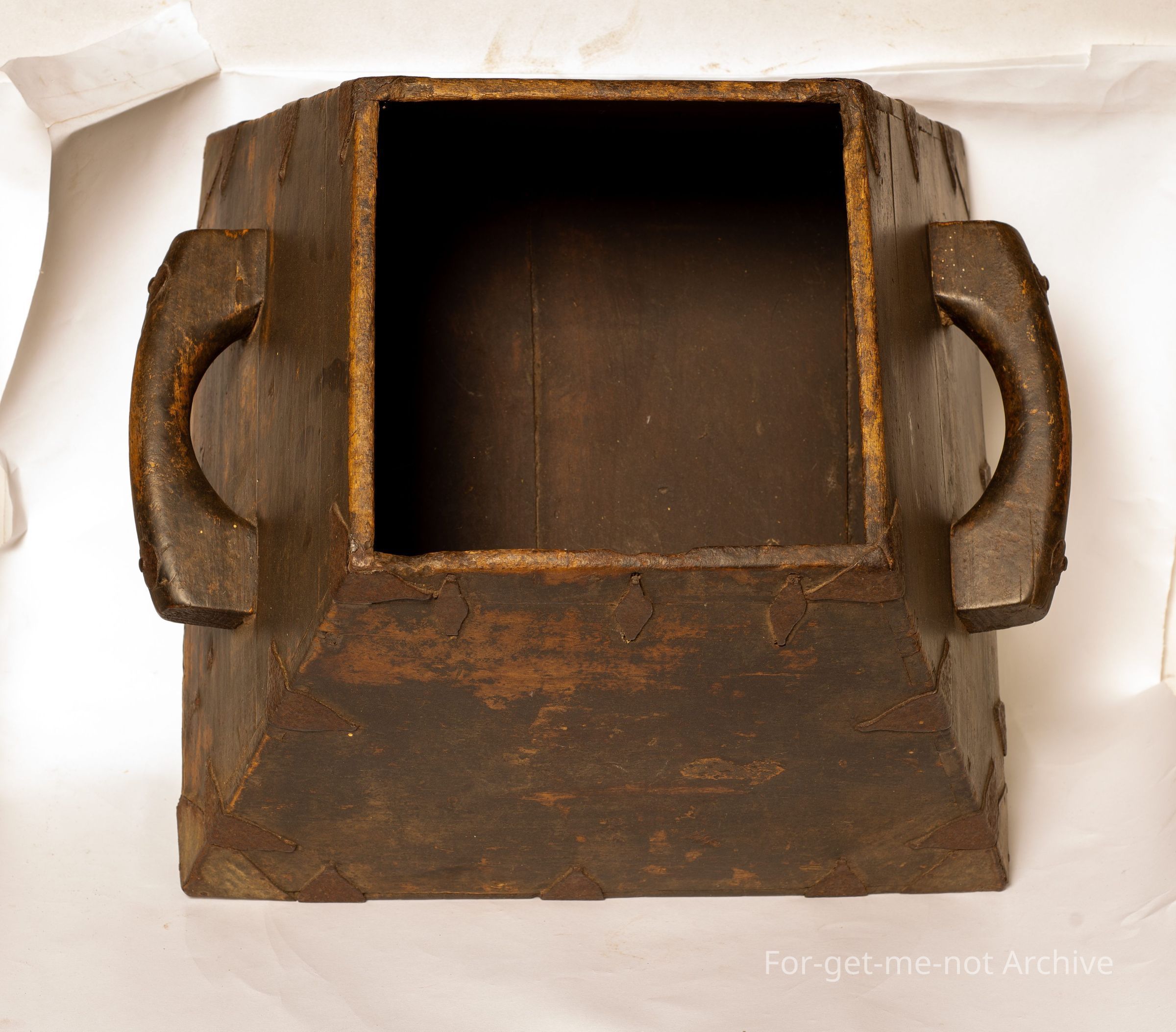 A wooden Chinese Life Measure from the Chinese Collection. This one has bracing of pieces of metal all around to strengthen. Heavy wooden handles on either side. These do not have a lid. They were, when filled with rice, a piece of wood was swept over the top to make it level for uniform measuring. Quite an early piece,Collection