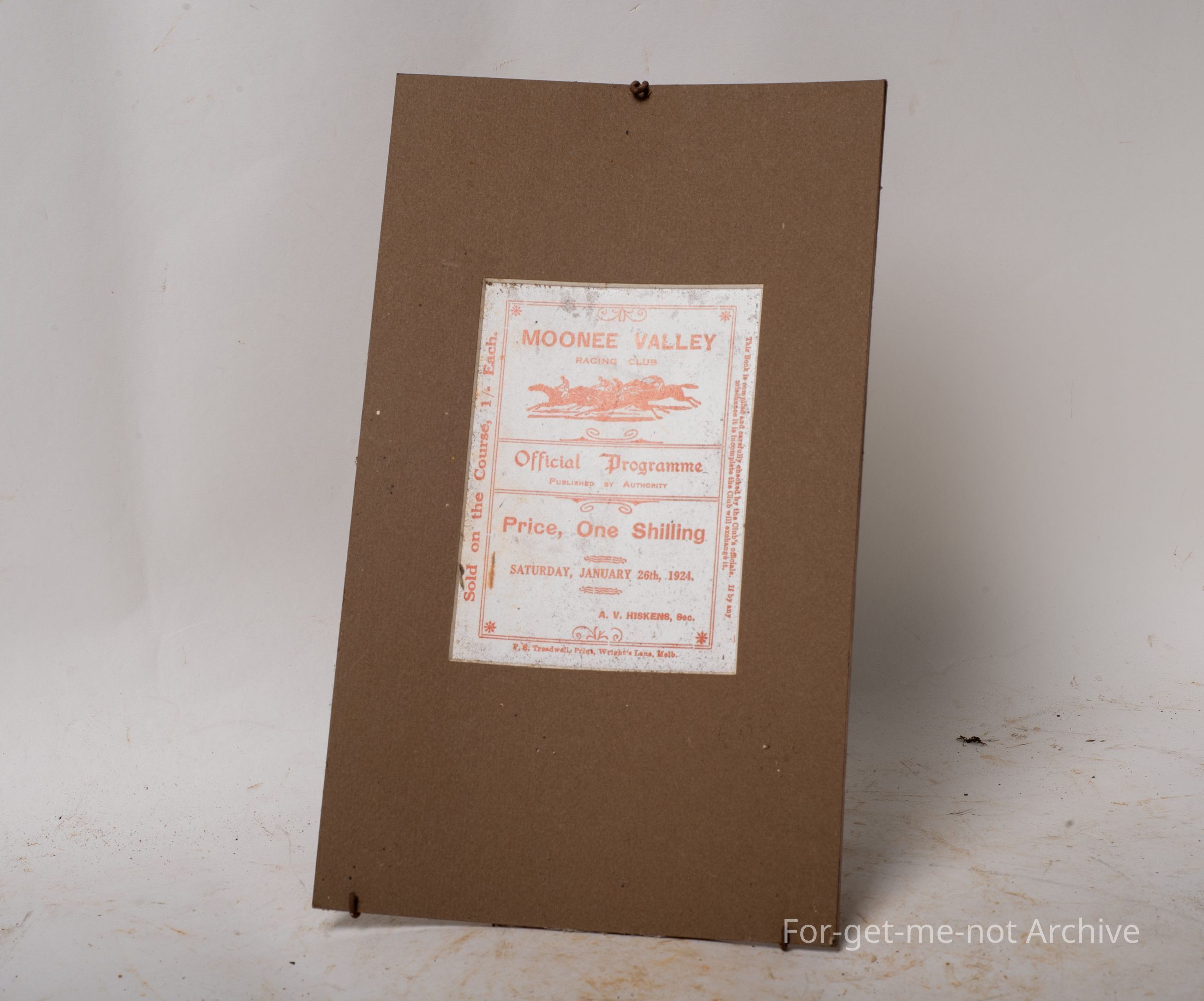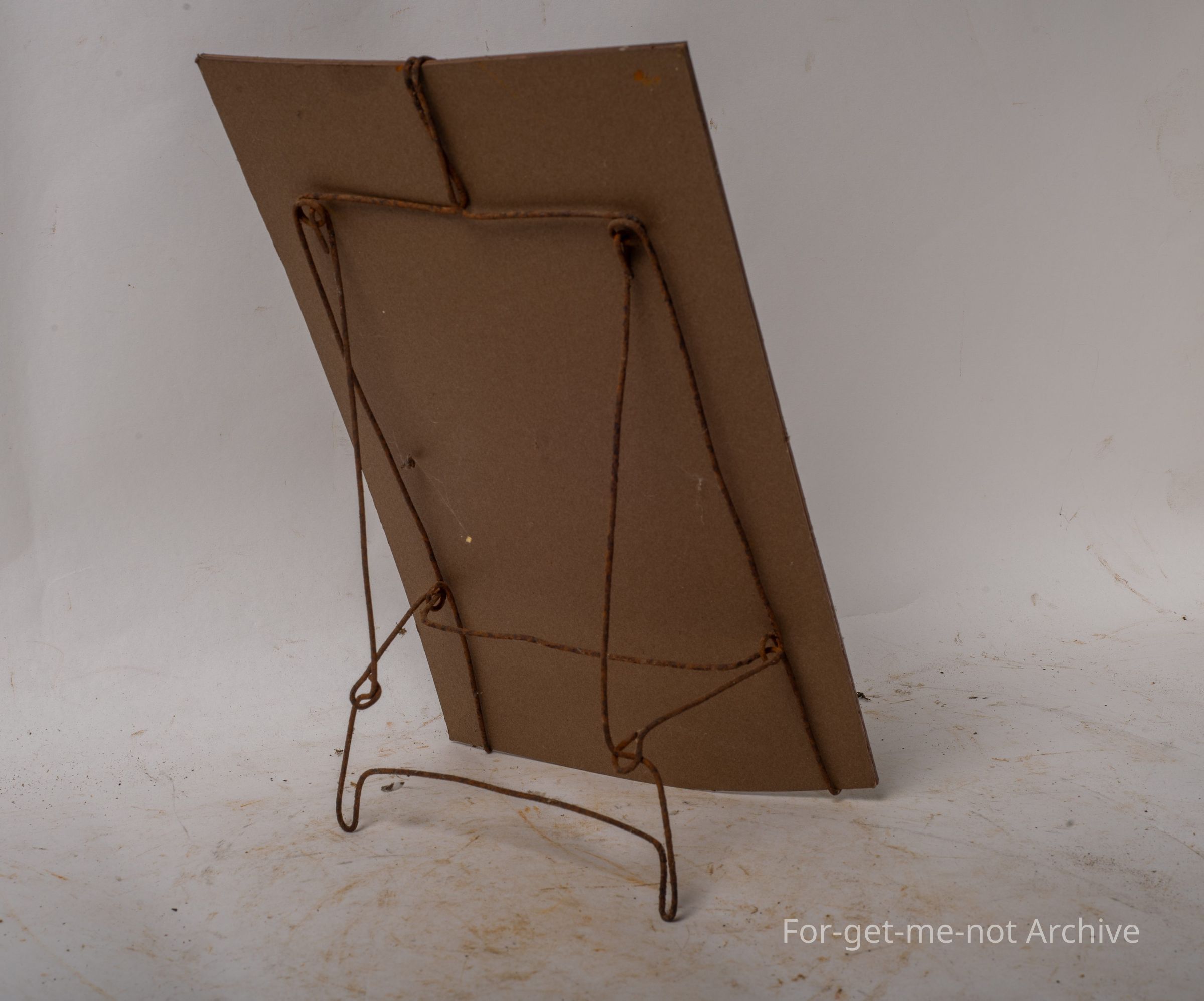 Is a little light wire work stand for putting a cardboard notice, piece into. They work extremely well. This one has a cardboard piece advertising Moonee Valley Official Waste Program 1 shilling.Collection