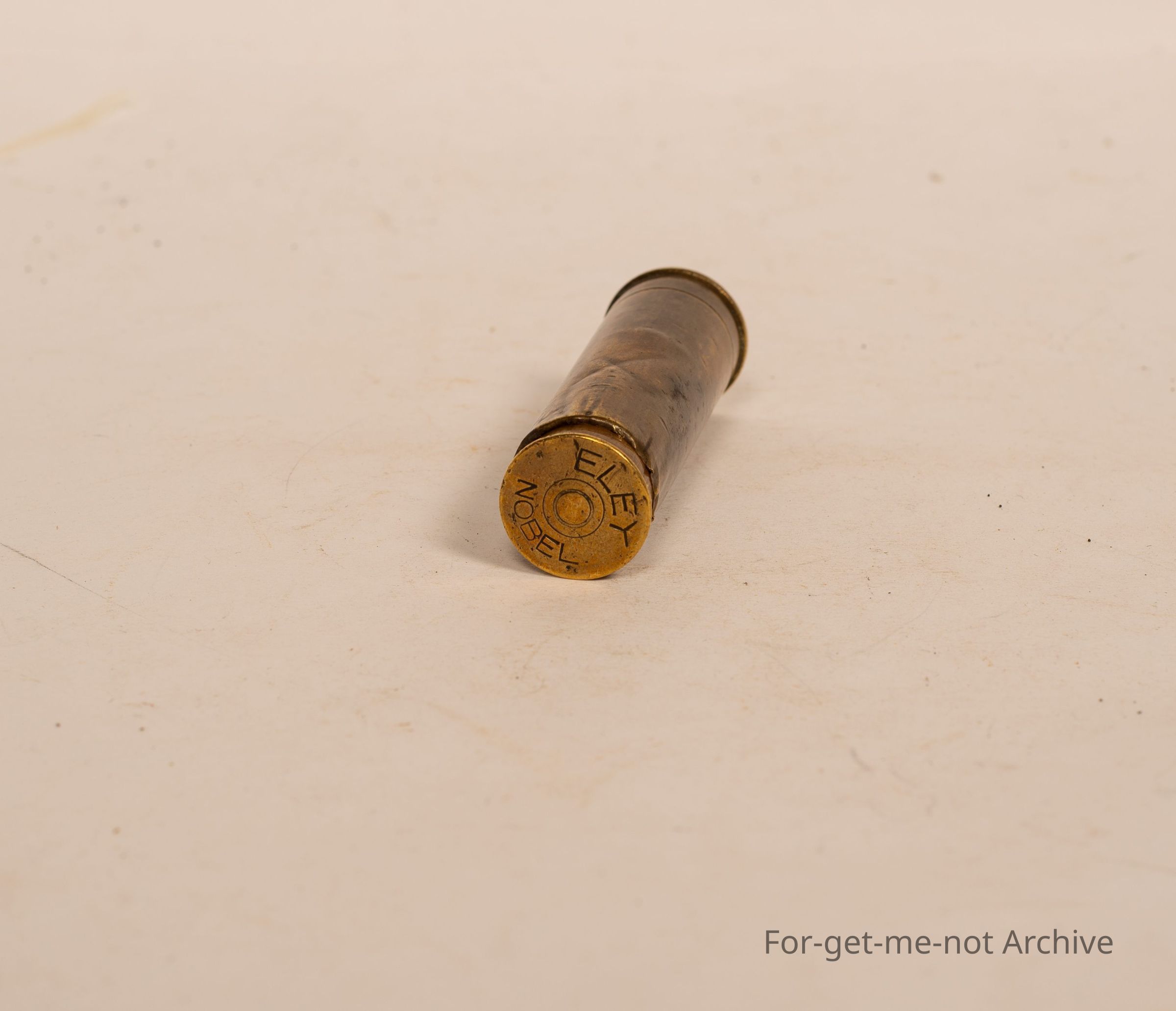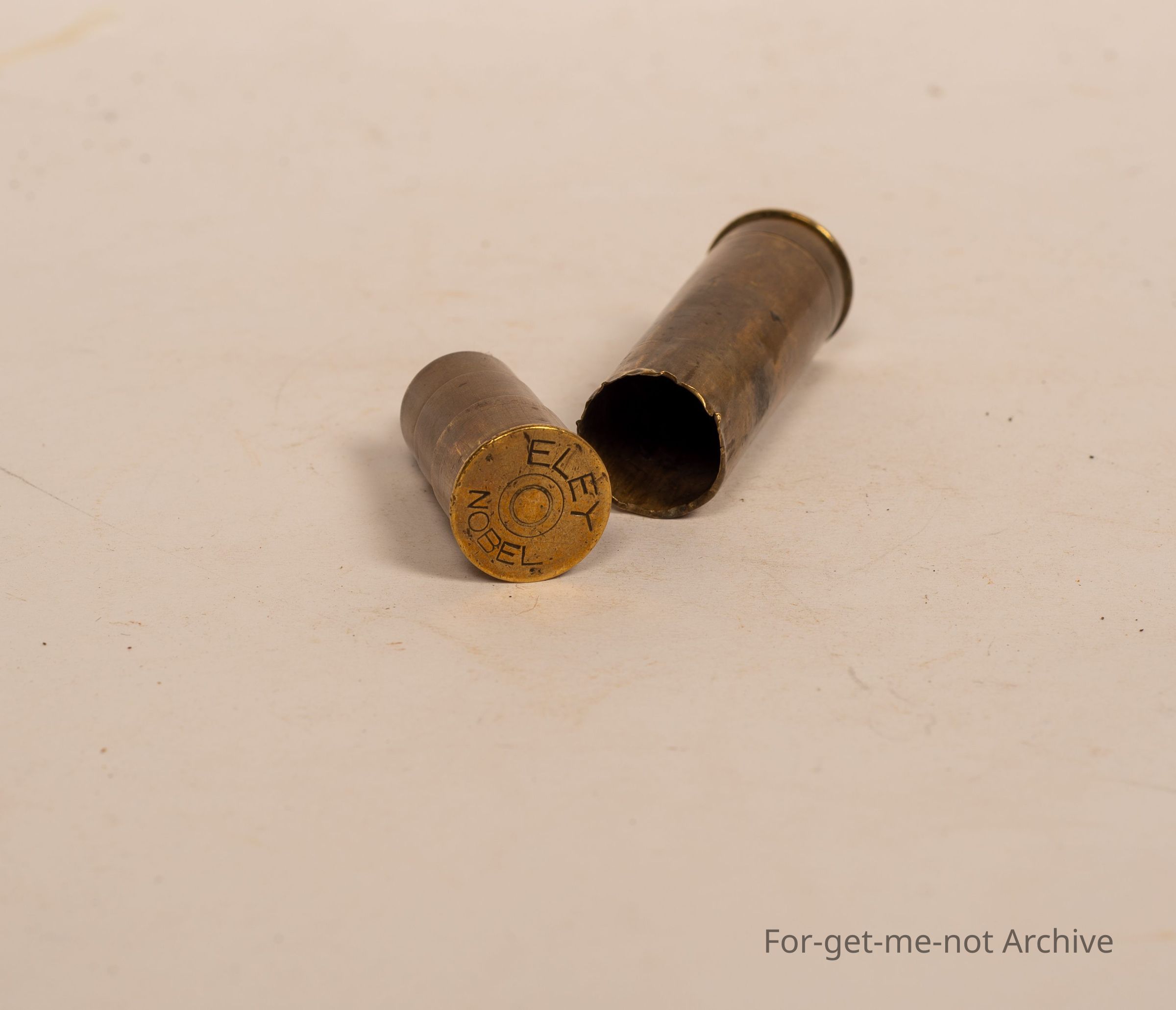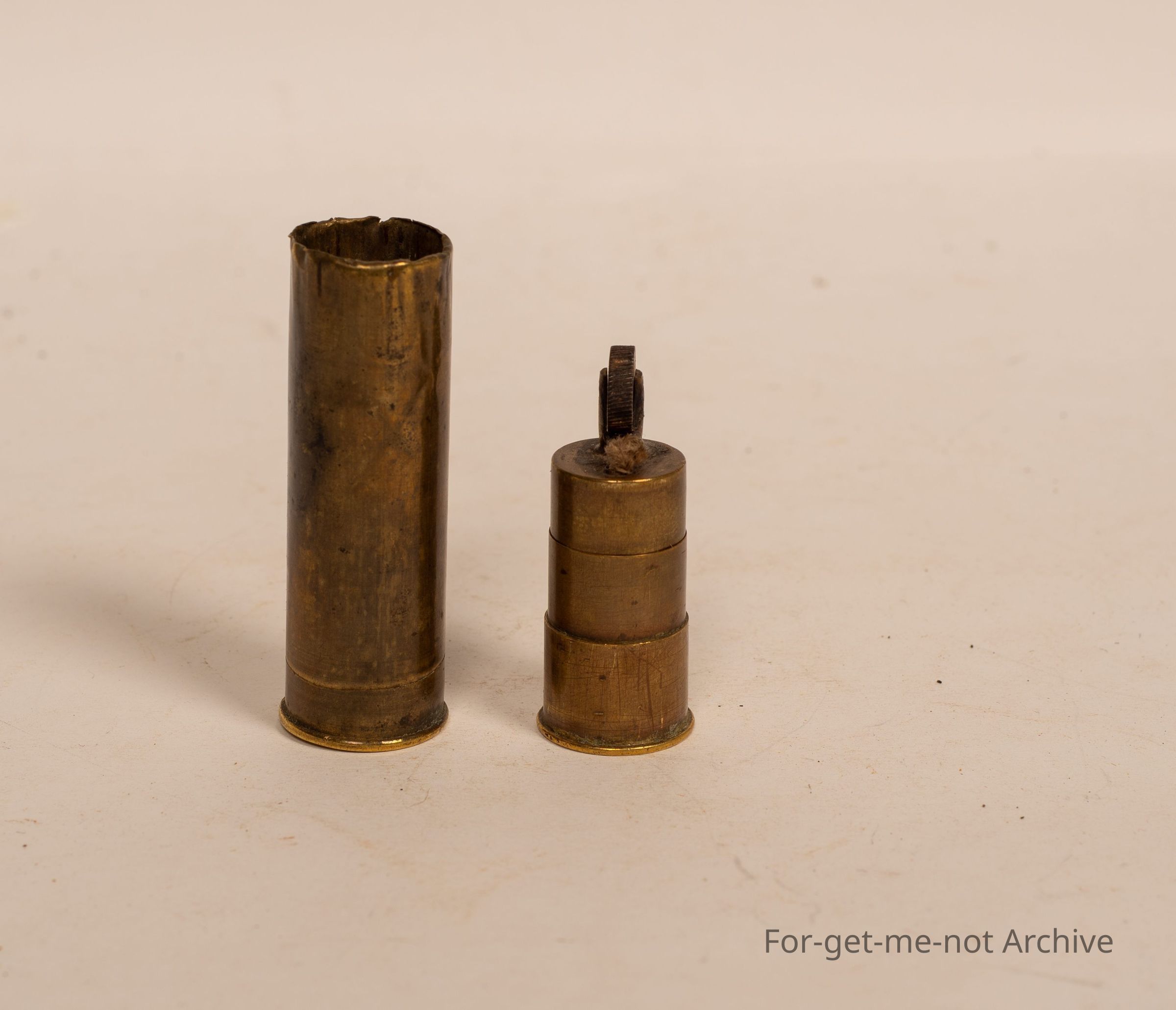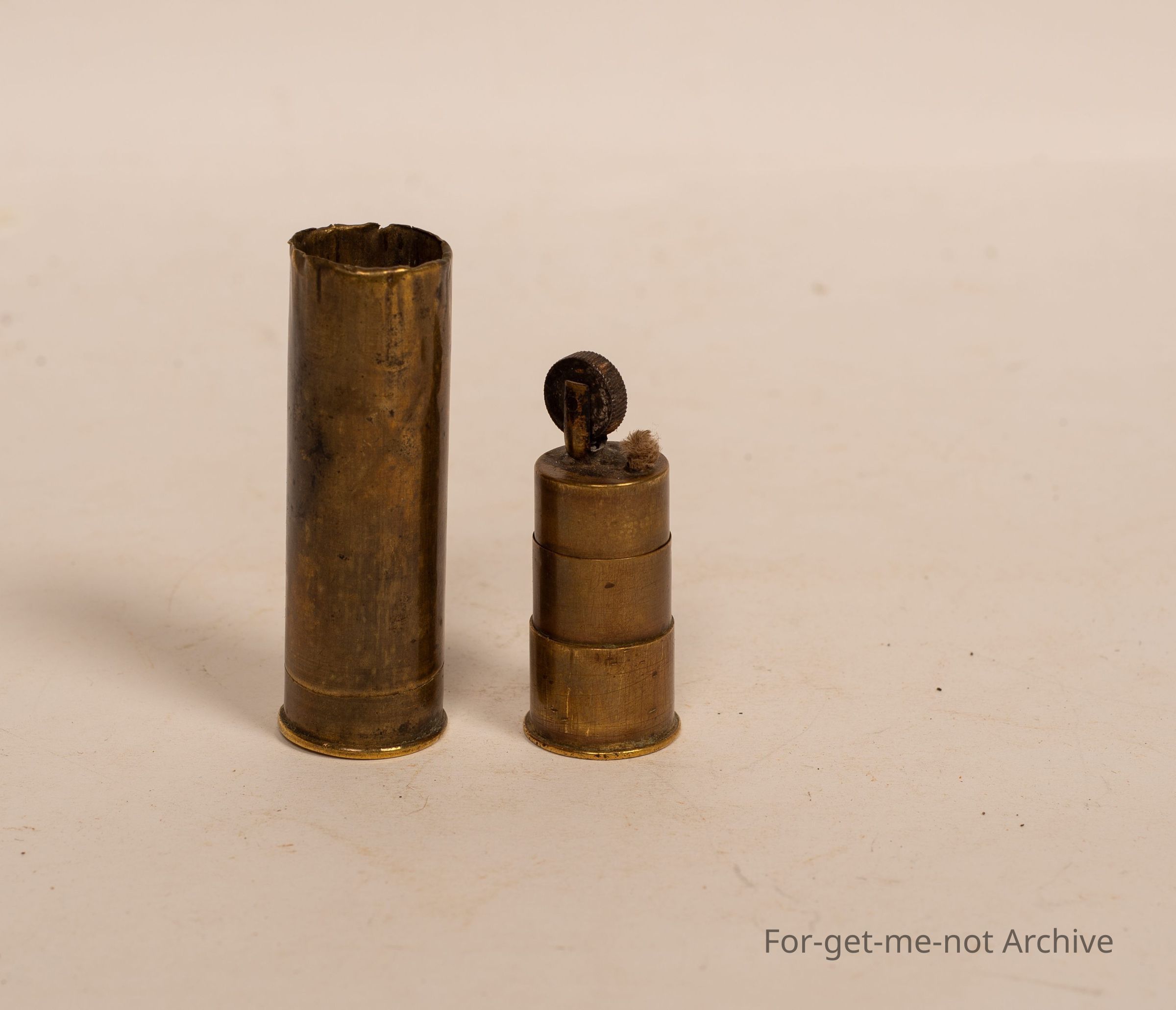 A cigarette lighter from Eely Noble that fits in snugly into a holder, which is in the shape of a shotgun cartridge. All made of brass. Quite a very rare piece,