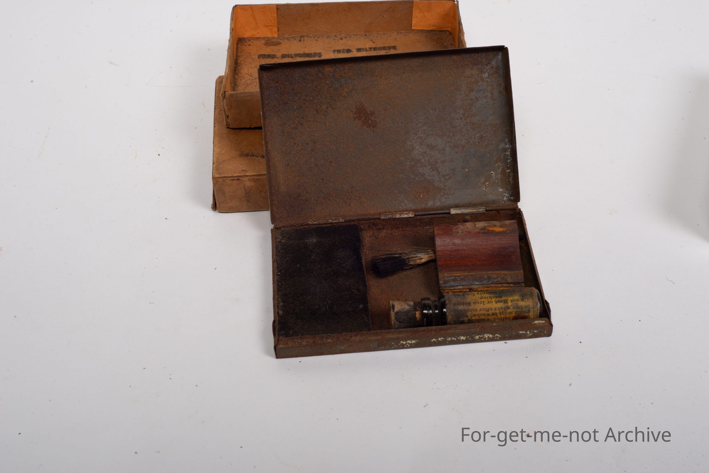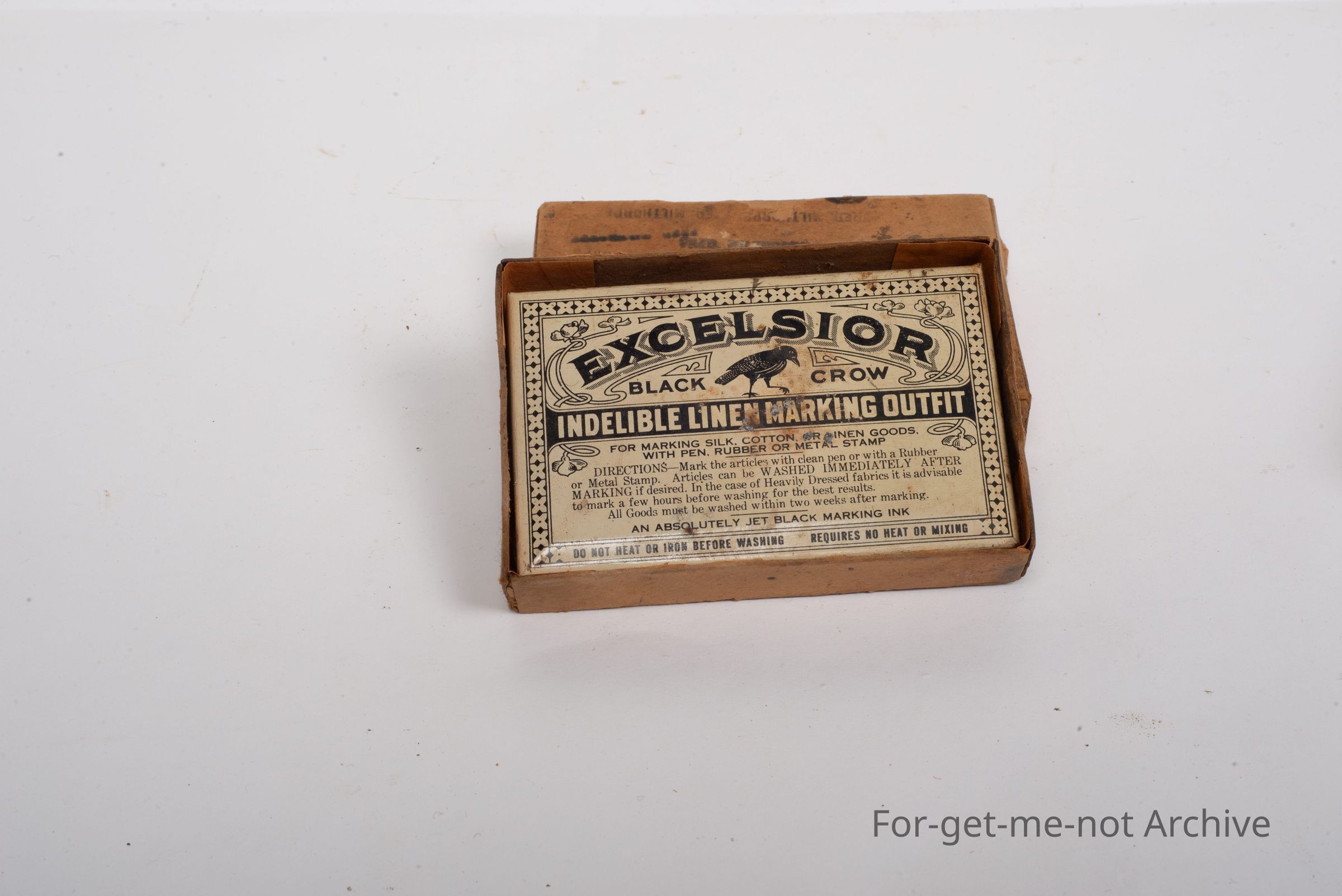 Is the tin in its original box of Excelsior Black Crow Indelible Linen marking outfit. Lovely condition,