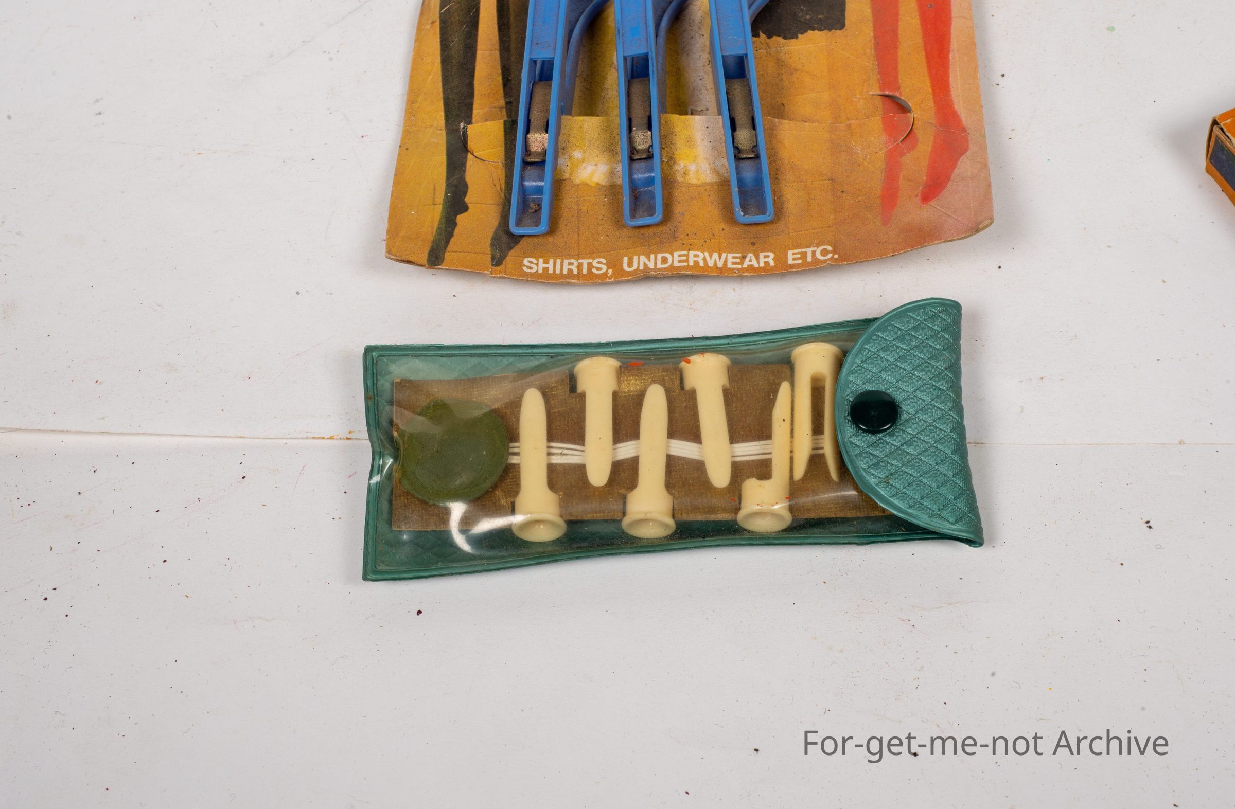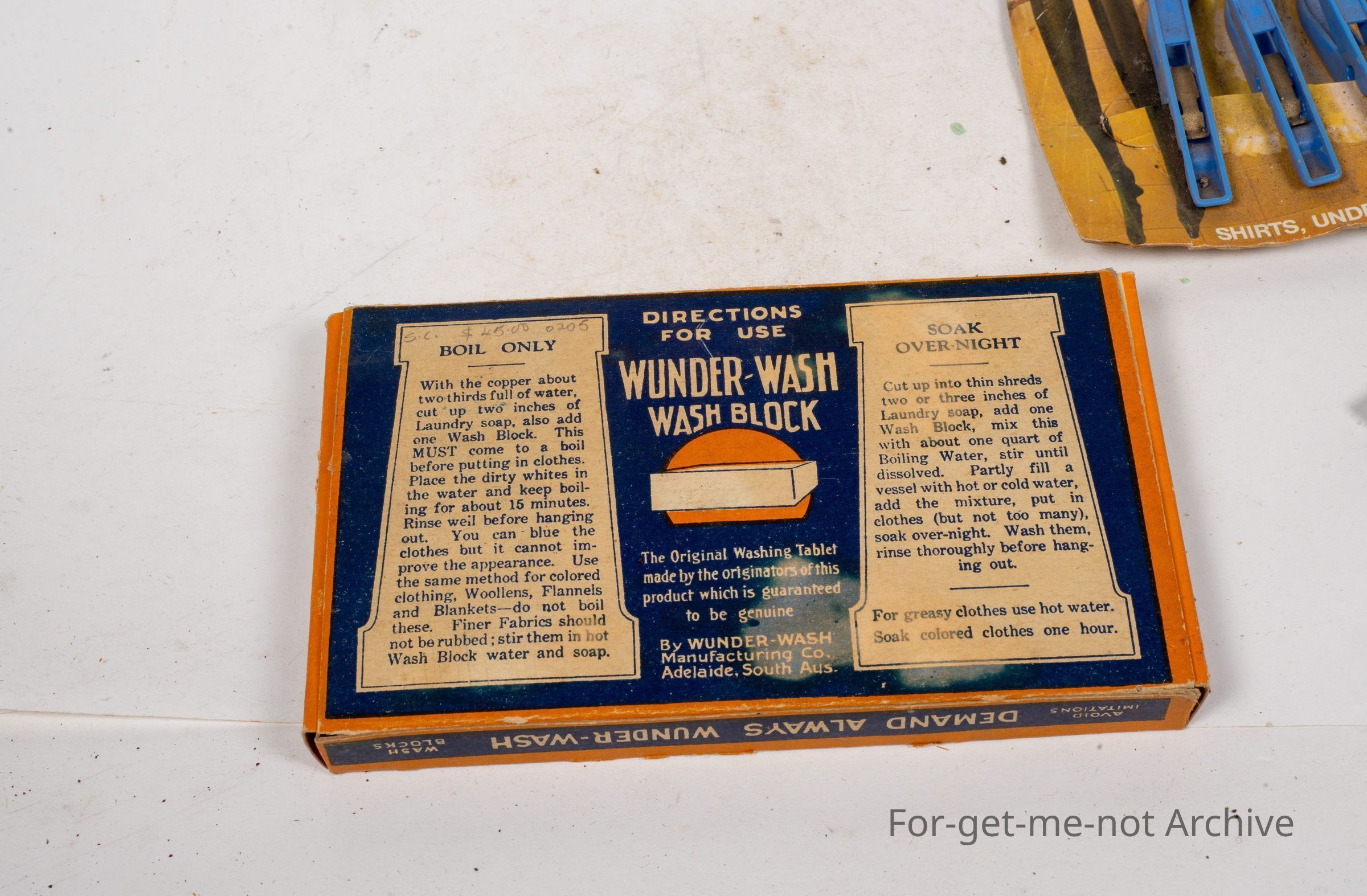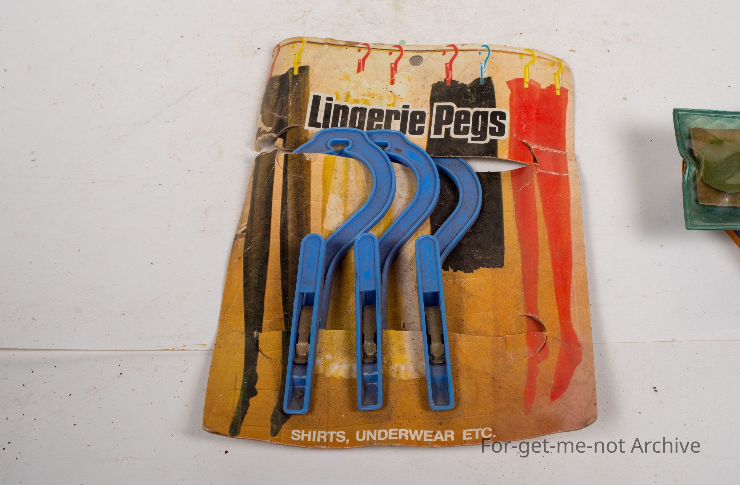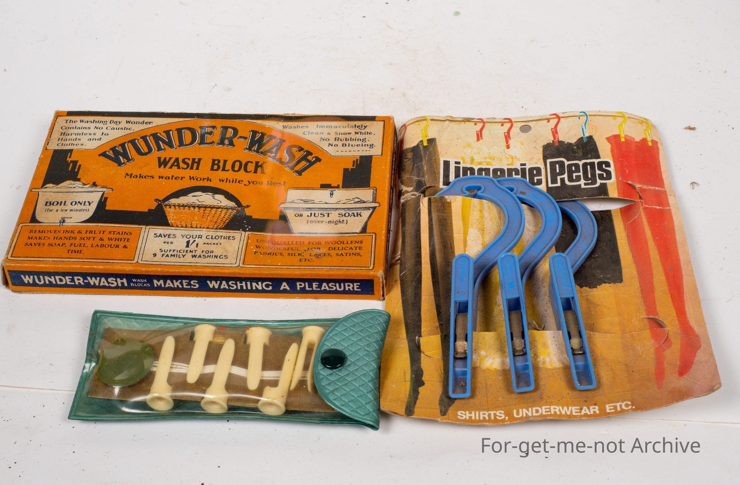 Is a group of 3. Wonder Wash block for washing, laundry. The second one is Lingerie pegs. Lingerie. Lingerie pegs, which can be used as a peg and hanging shirts, underwear, etcetera. The third one is a little plastic container of pegs, possibly for when you're camping or traveling and, in a in a plastic box.Collection