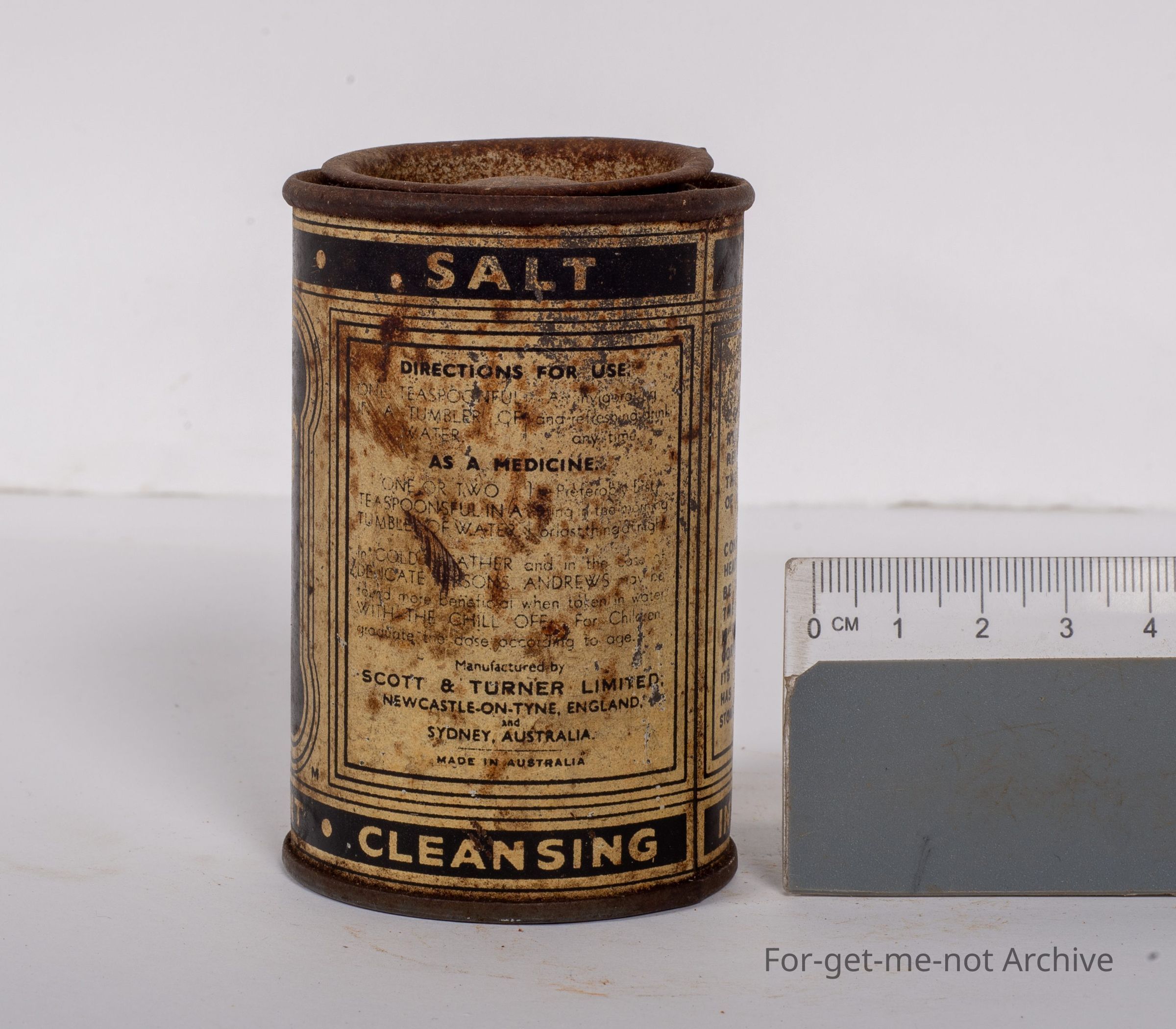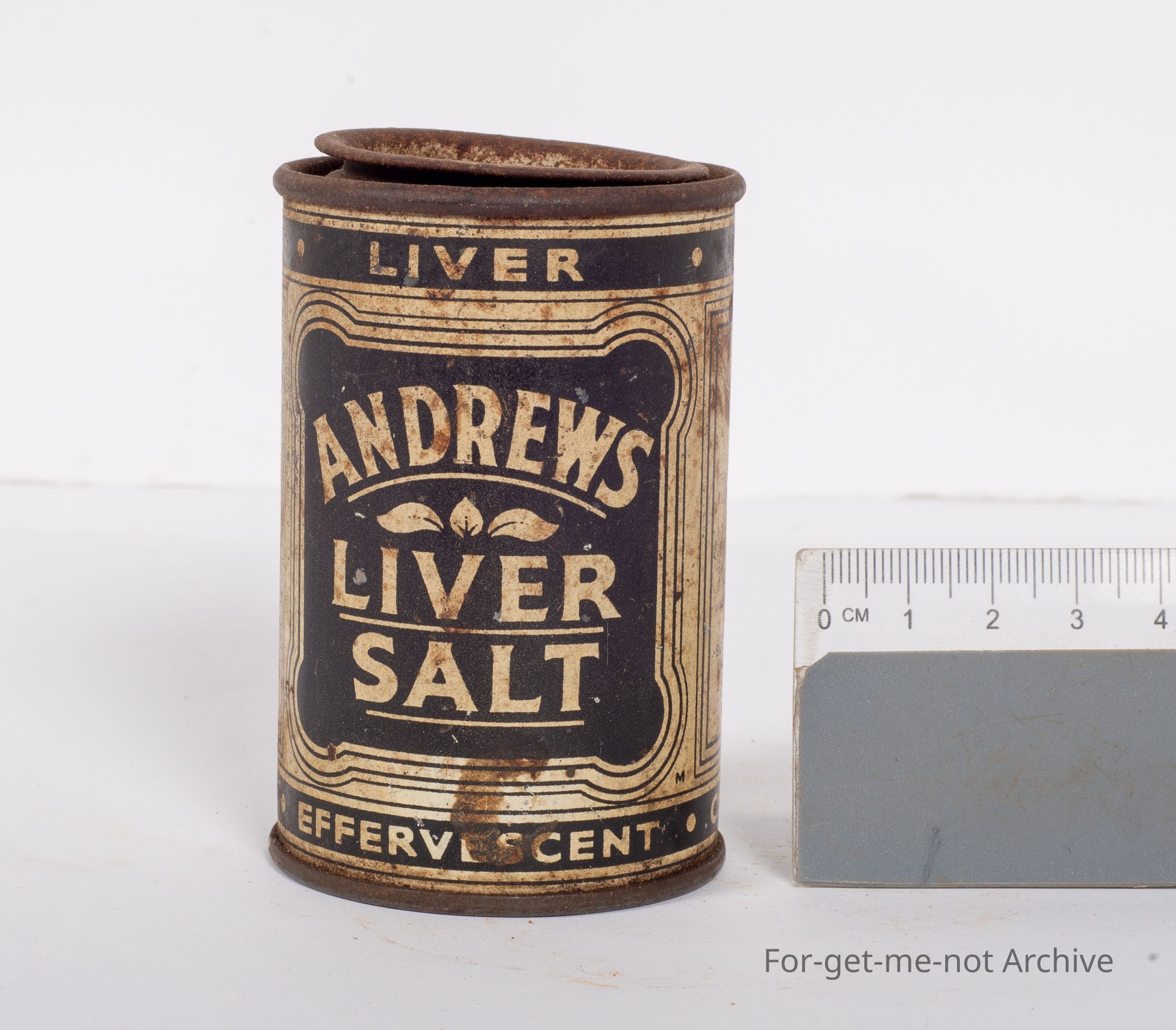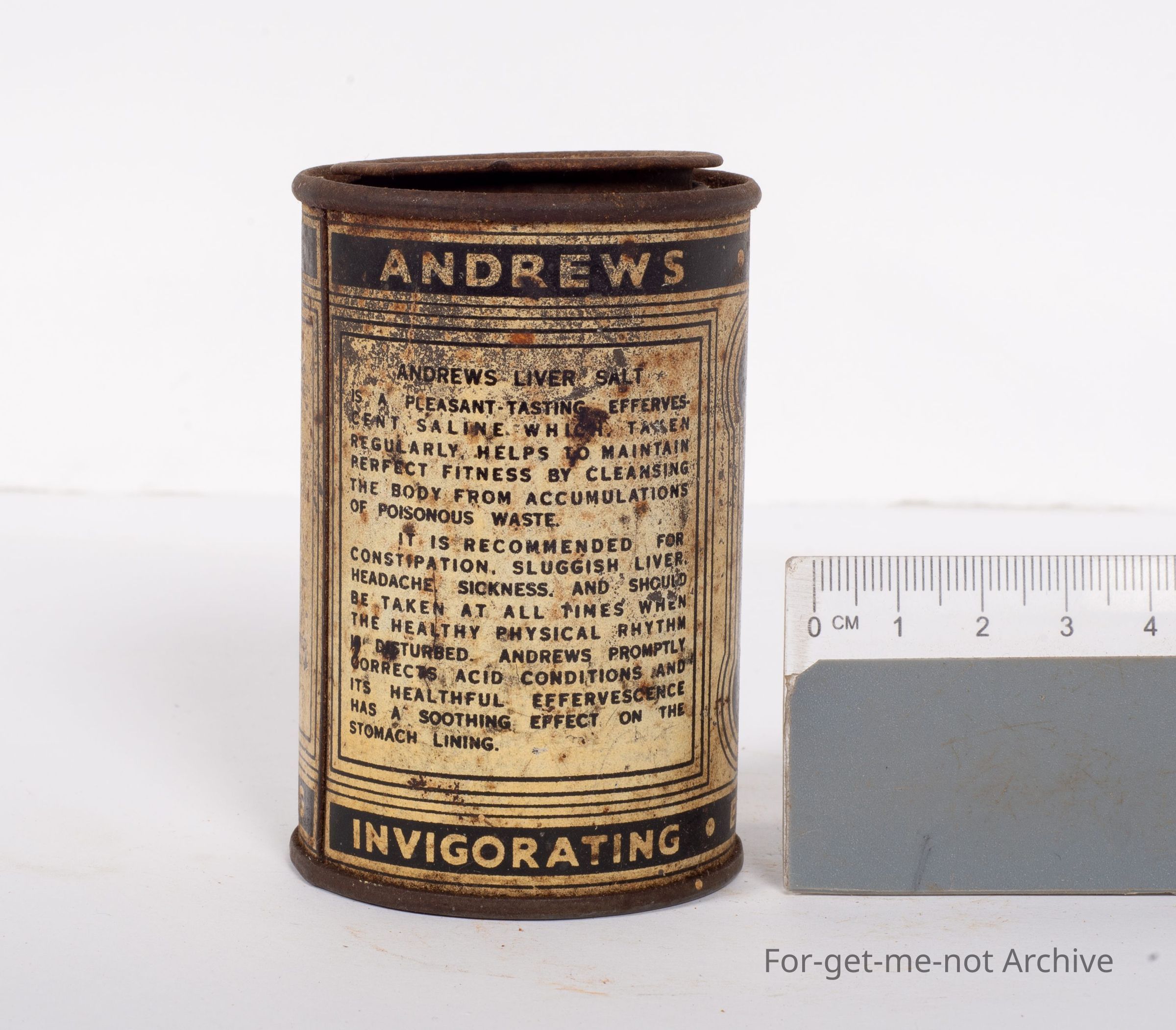 This is the smaller size tin of Andrews Liver Salt. This is the early tin, which is in black and white. It's rare to see this tin in good condition. Packed by Scott and Turner Newcastle Sydney.Collection