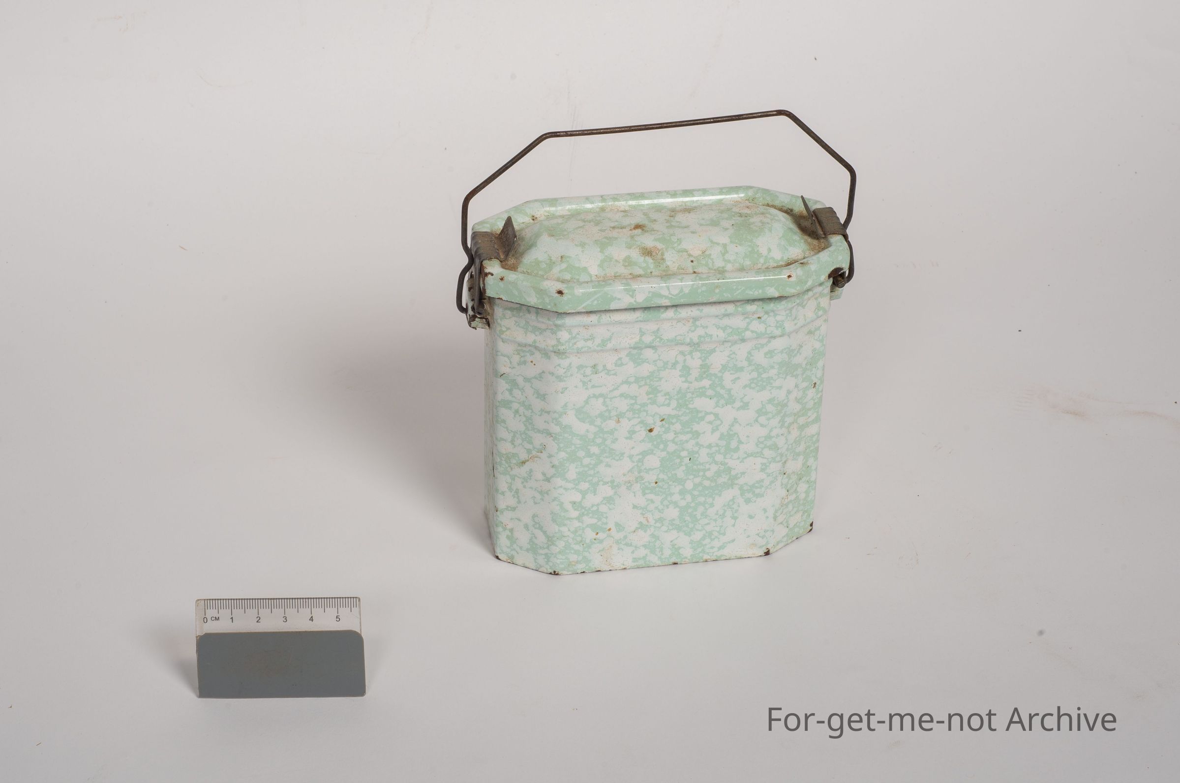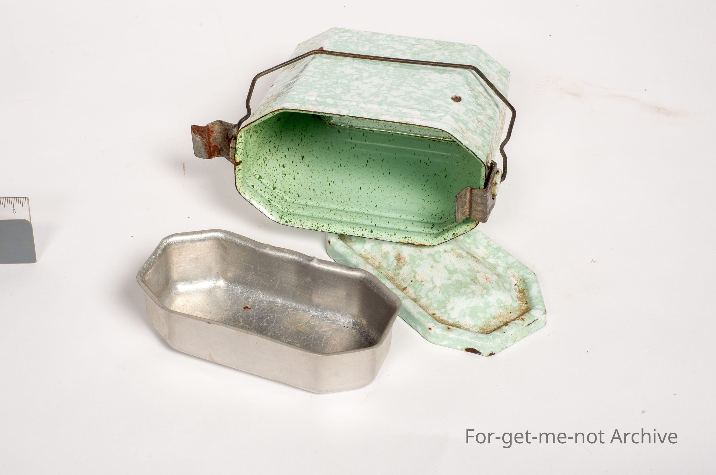 This is a little enamel lunch box handle. The lid comes off, in beautiful condition. English origins for the work of the state is food to work.
