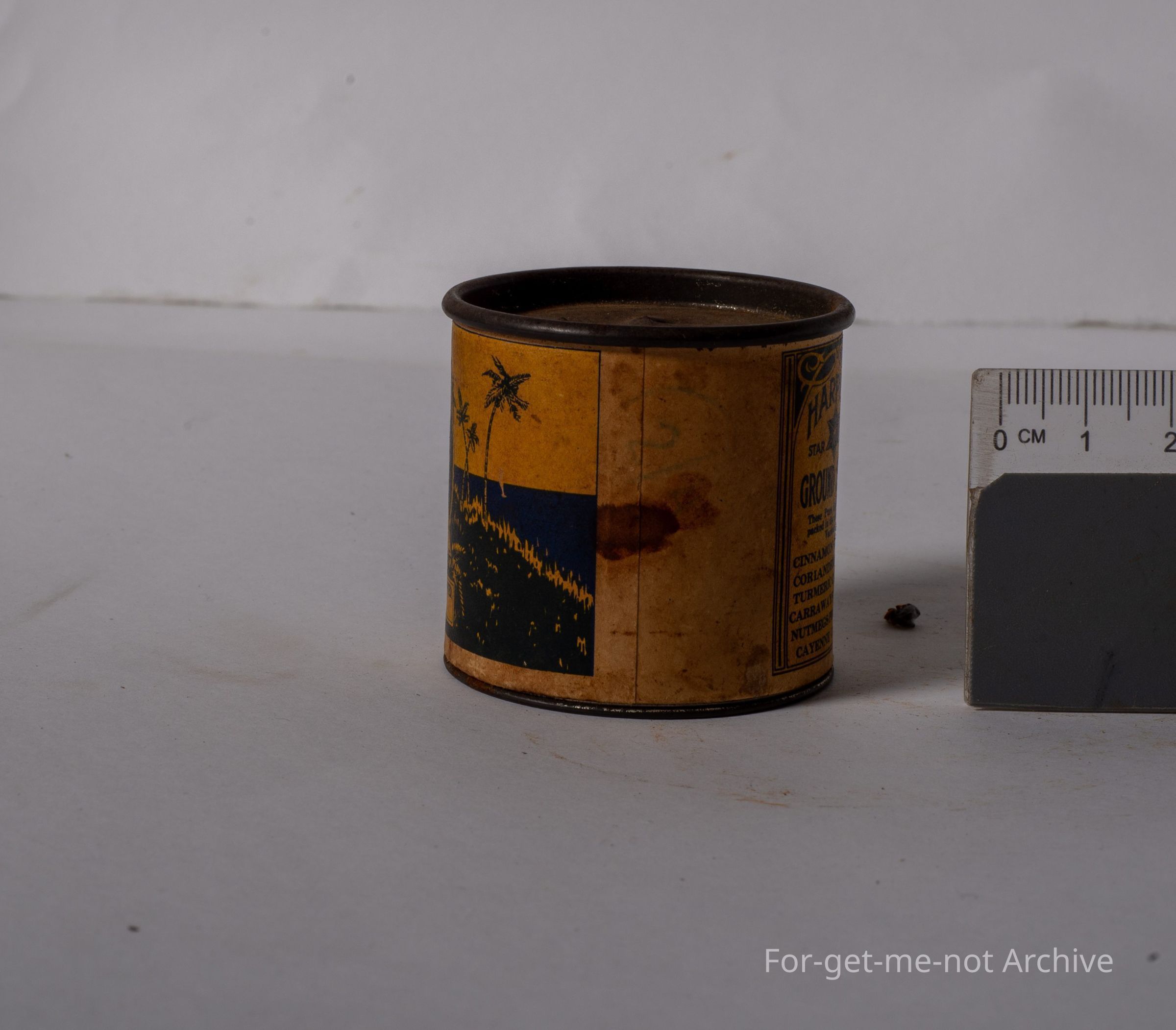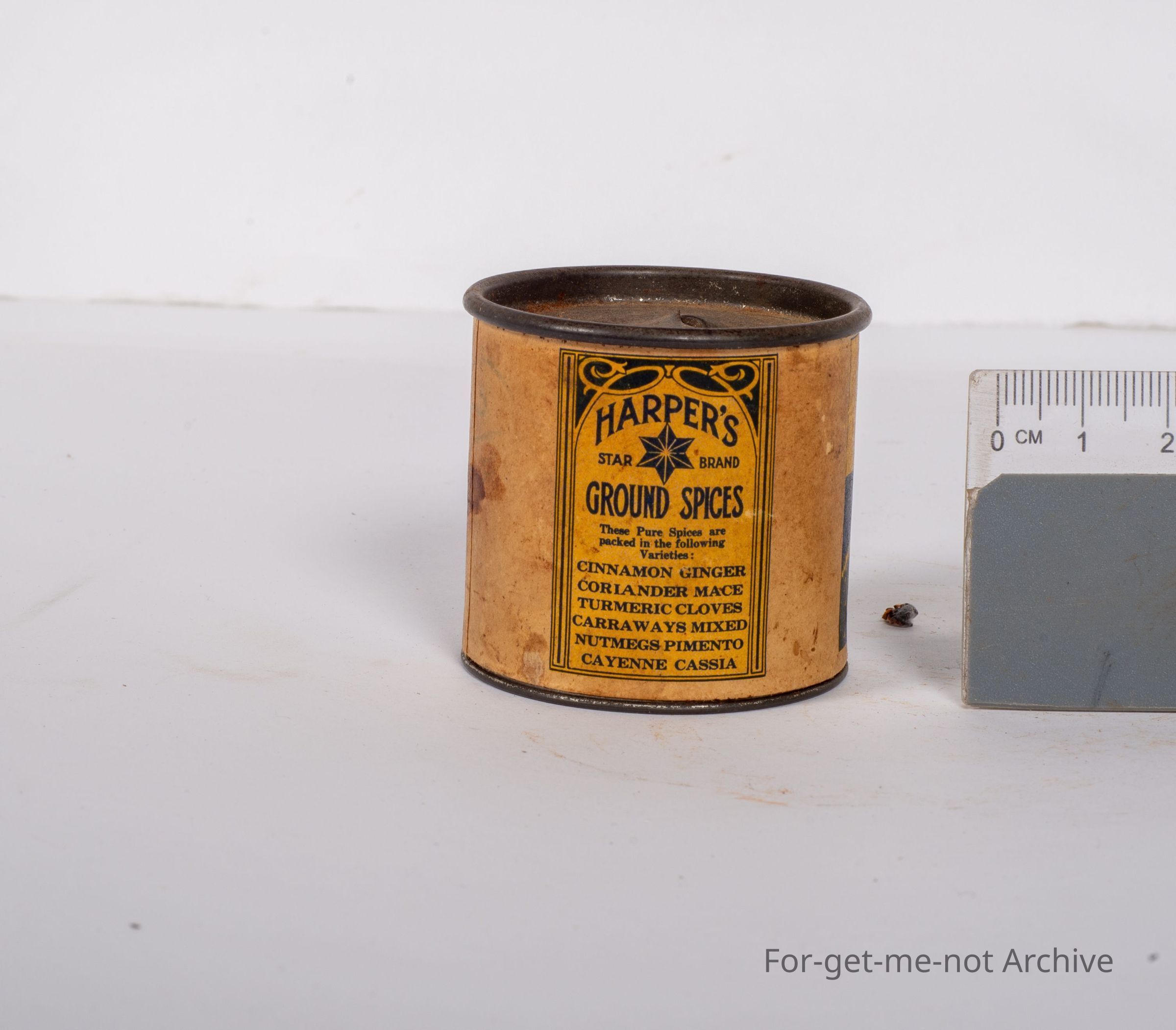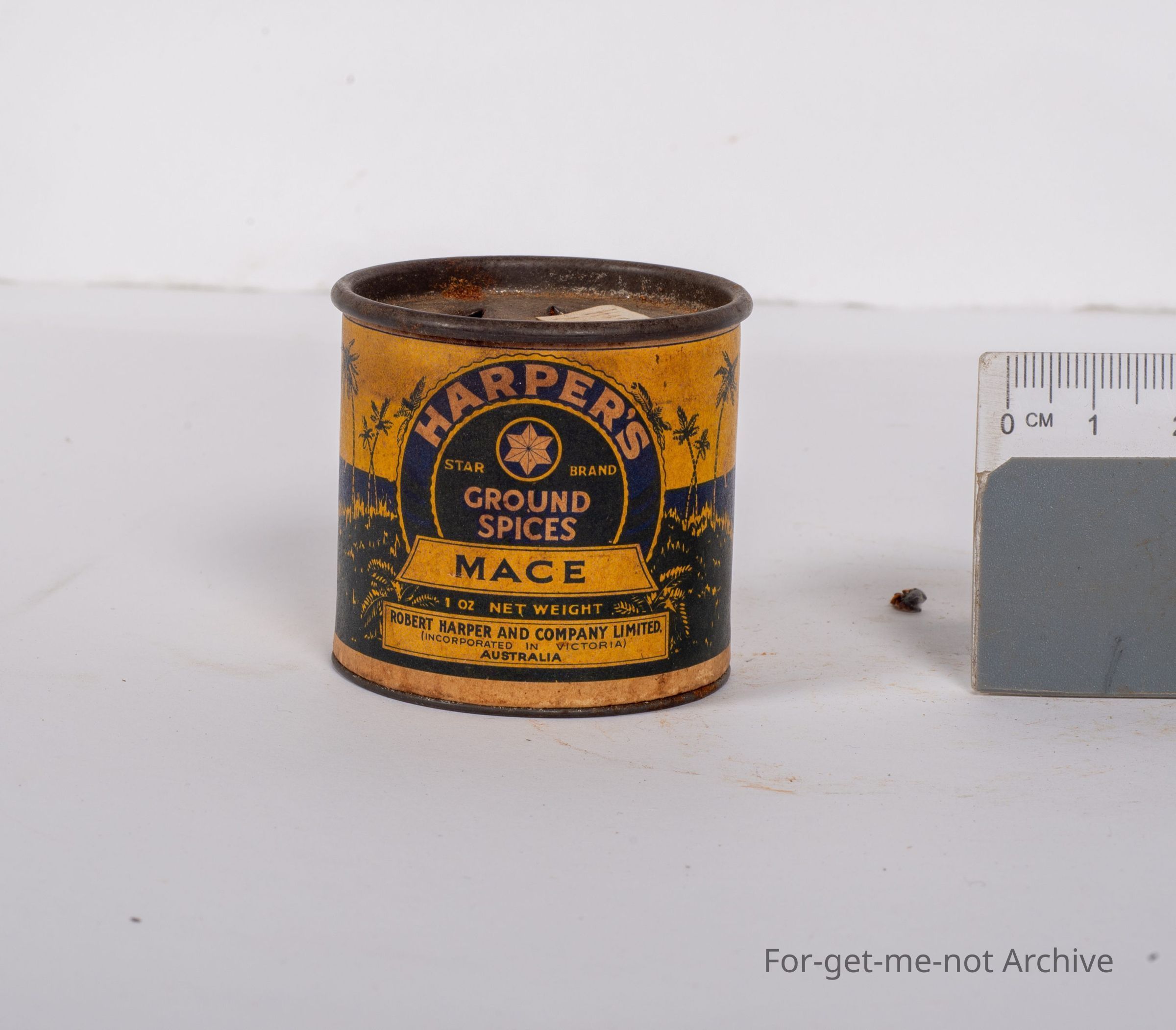 This is a small tin of Harper's Ground Spices, the Spice is Mace. Net weight 1 ounce. Packed by Roberts Harper and Company, Richmond, Australia.