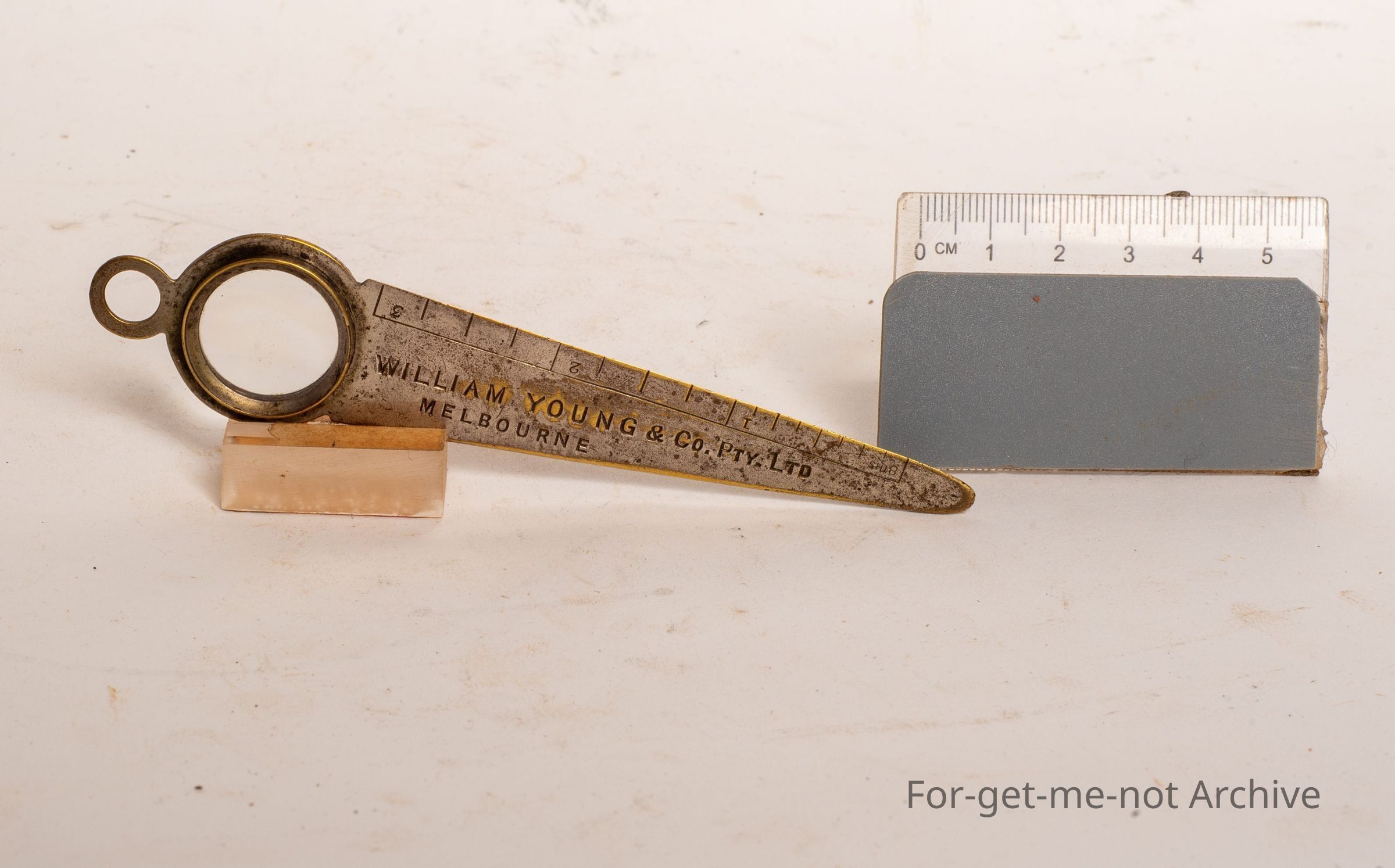 The text says William Young and Co, Melbourne, who were, industrial chemists. This was probably a piece for, viewing insects or some other minute thing. Fabulous Melbourne piece.Collection