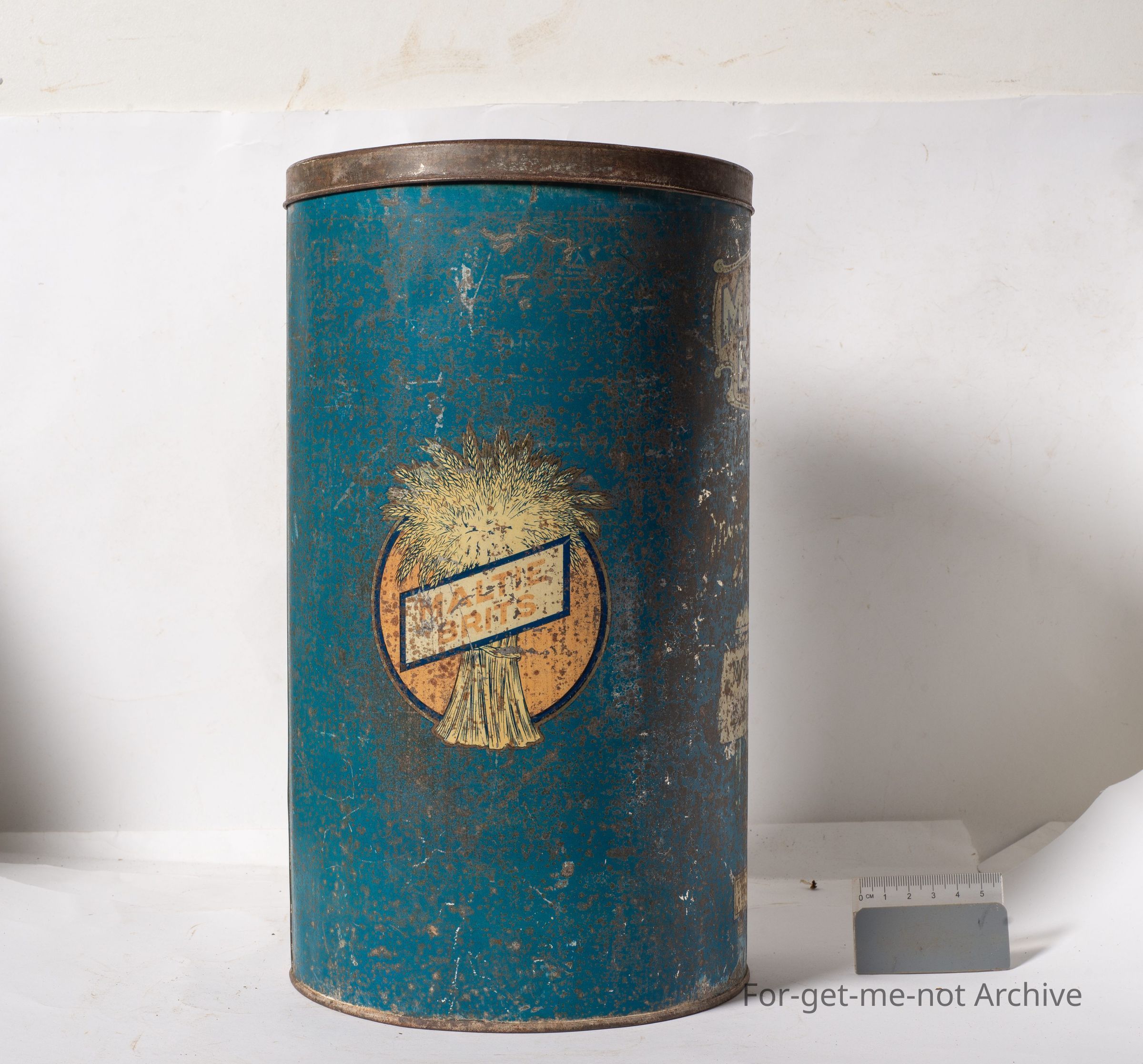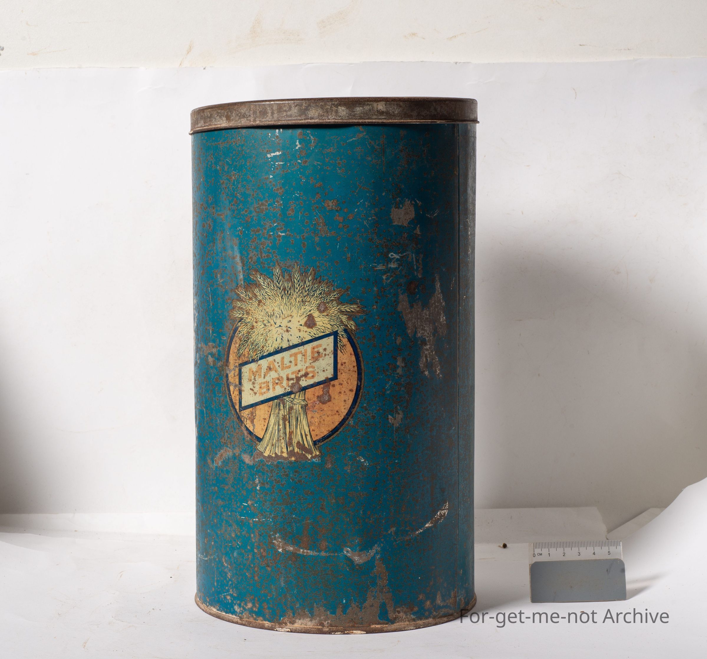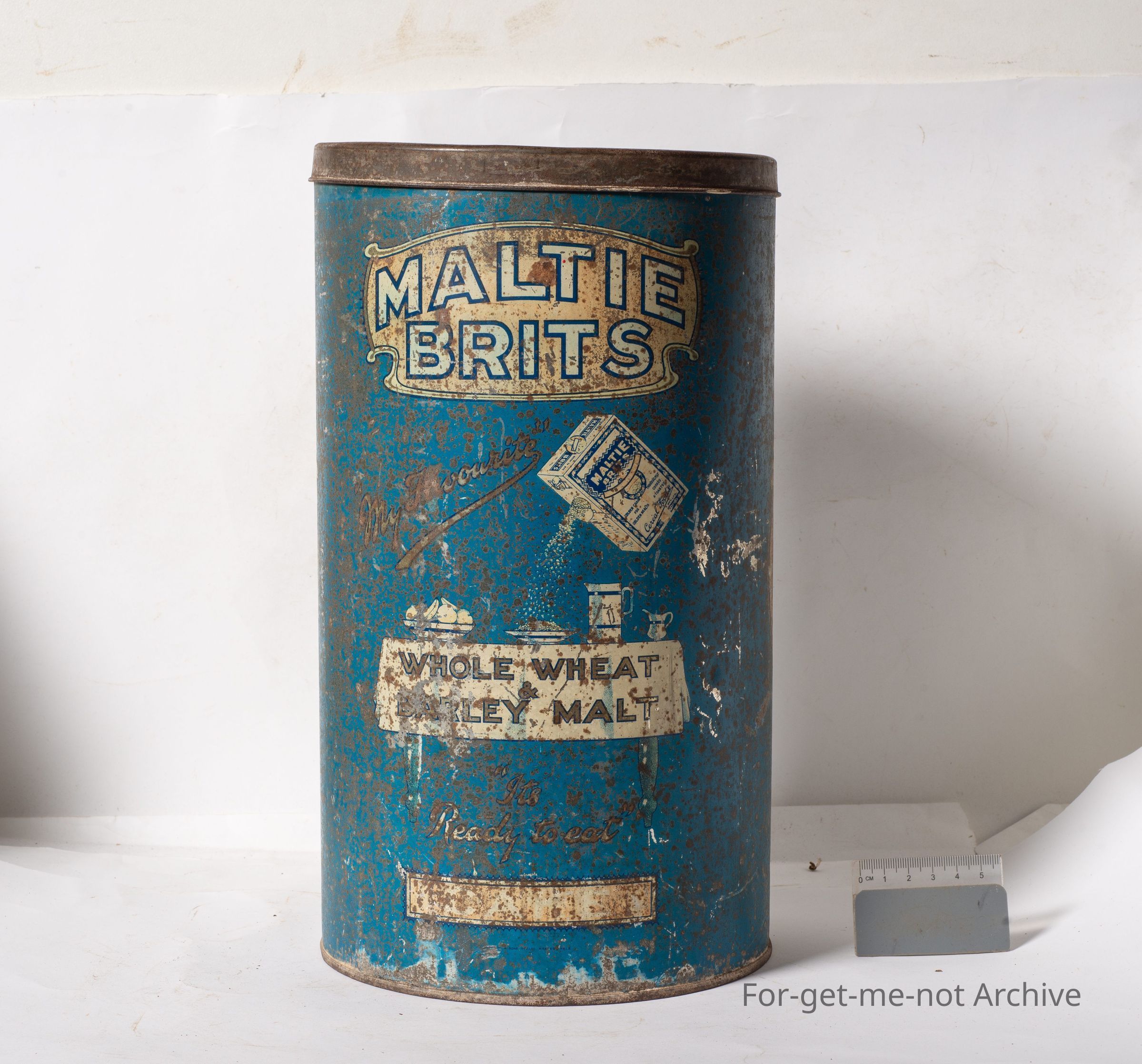 This is a long cylindrical tin, which has, had Maltie Brits, whole wheat barley malt, I imagine would be a breakfast cereal. Not in very good condition.