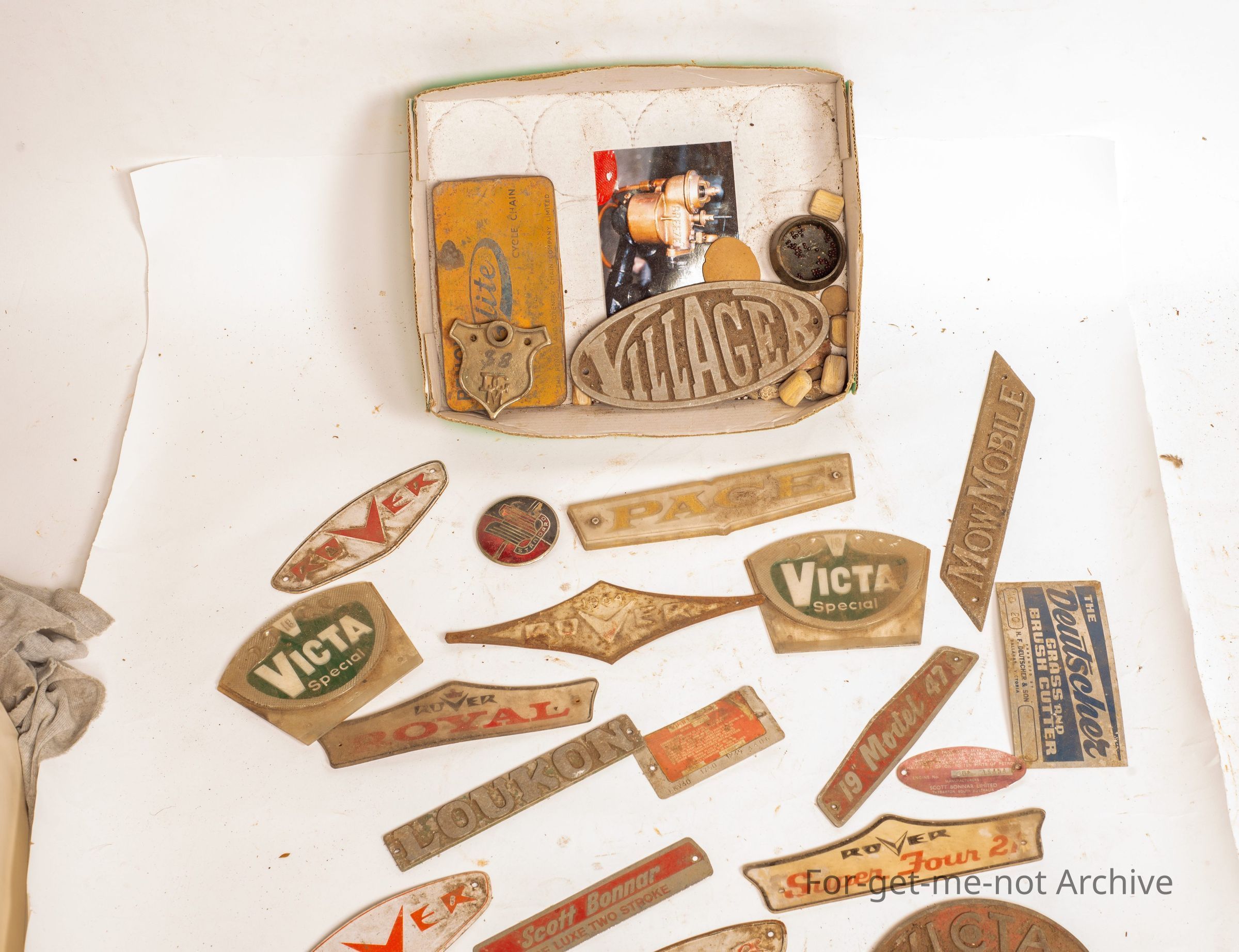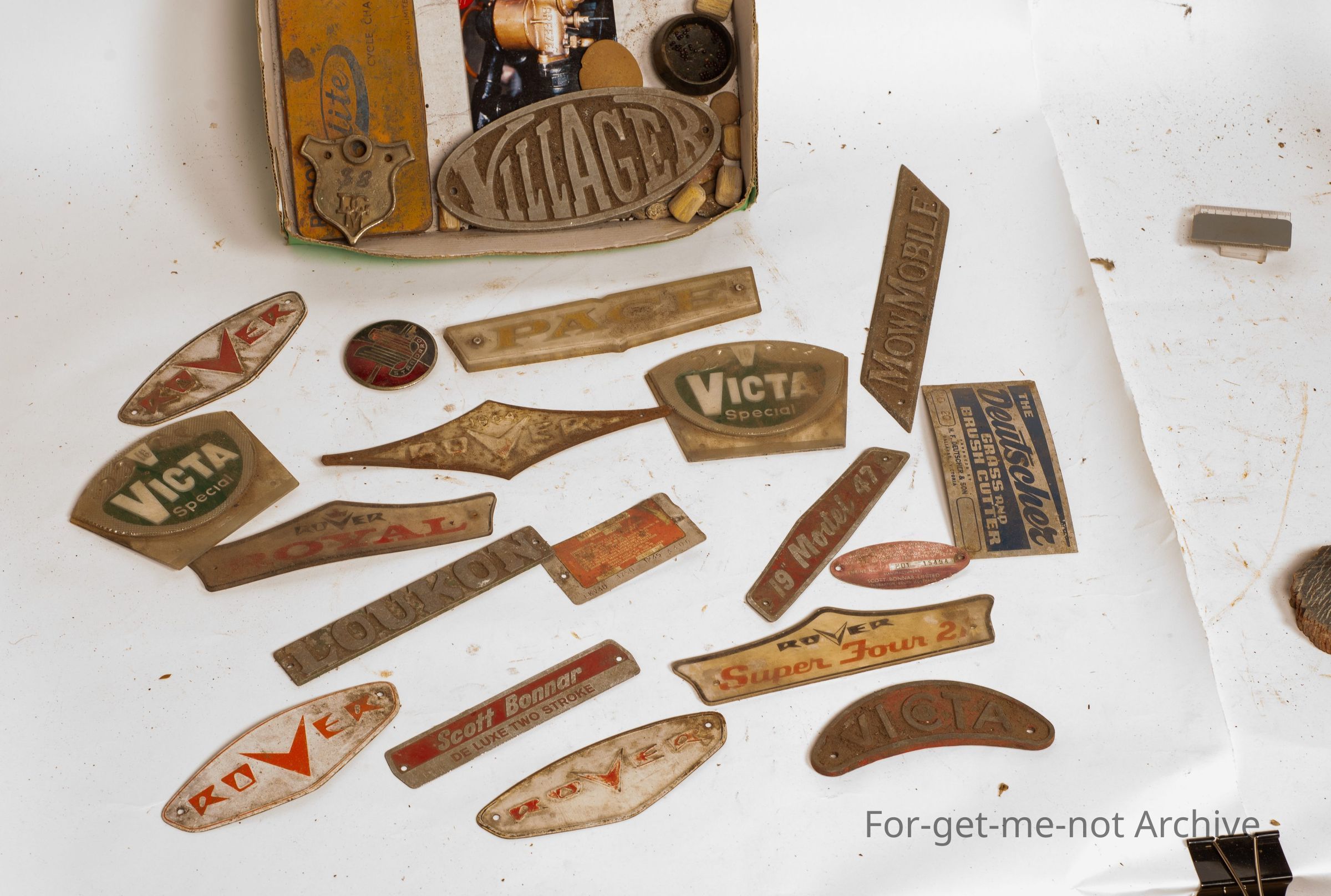 This is a box full of manufacturer's plaques from lawnmowers. These were all given to us by fellow Williams. Put on a display board. They look quite good.