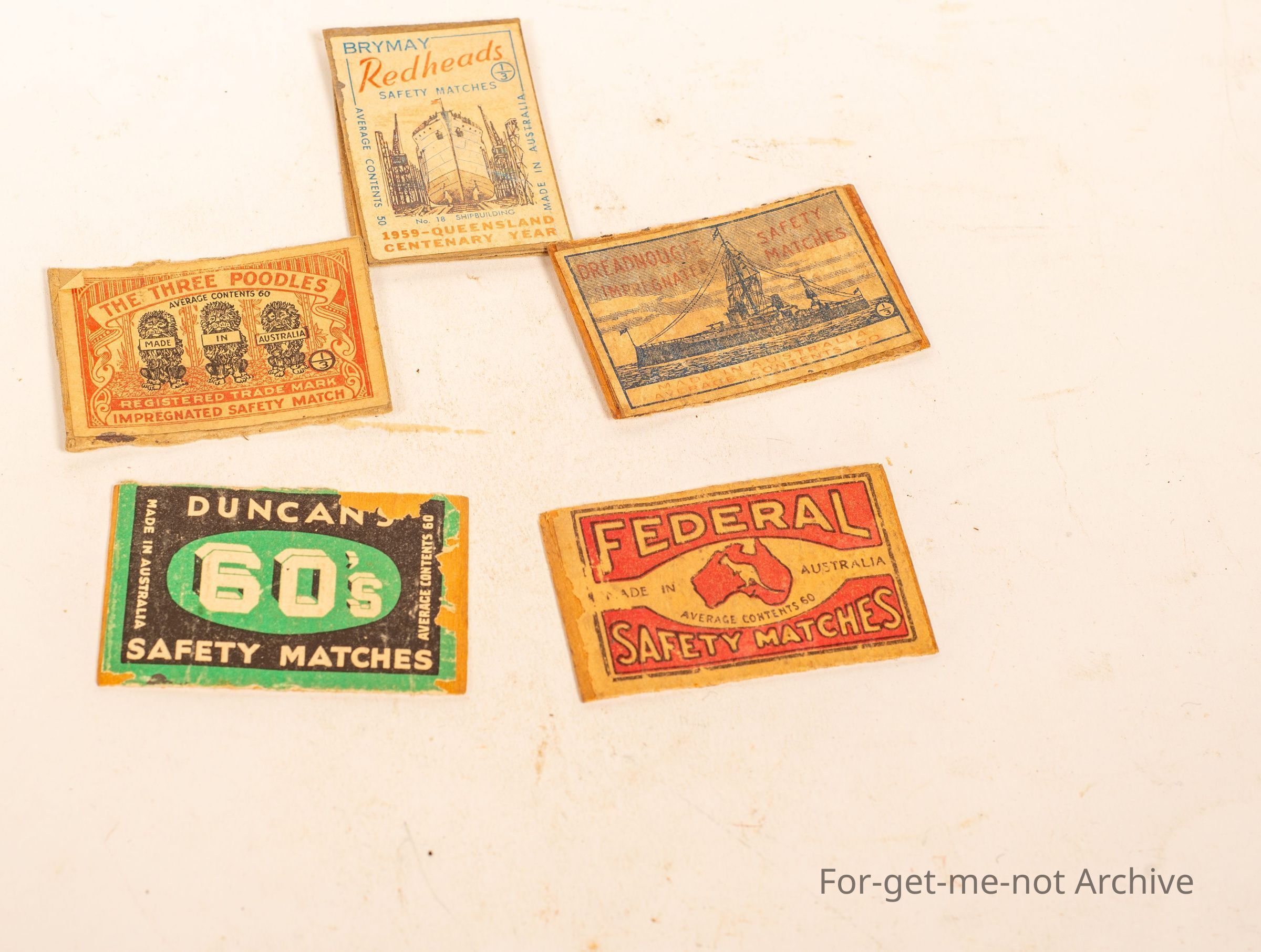 A group of 5. matchbox top, tops of boxes,