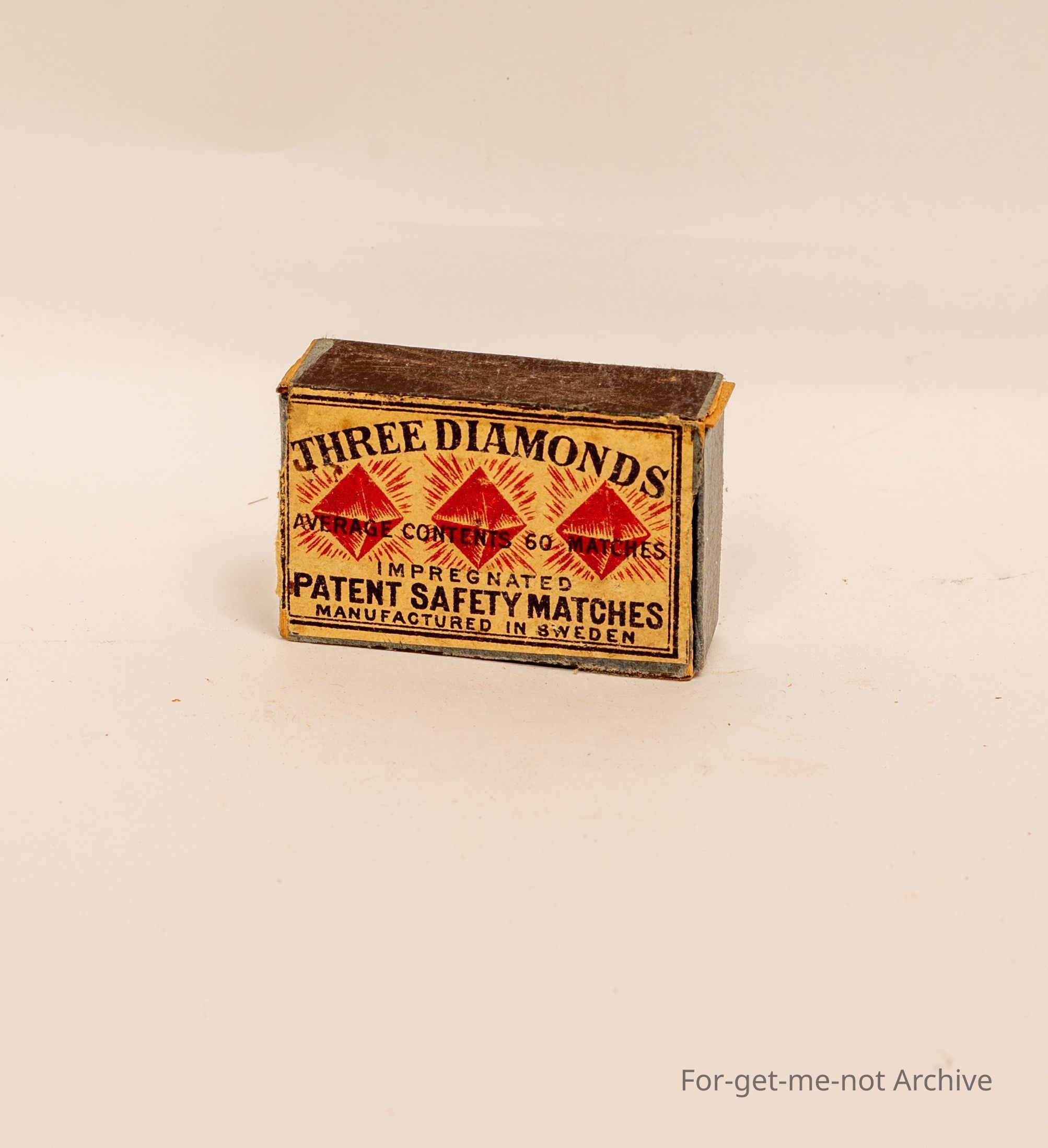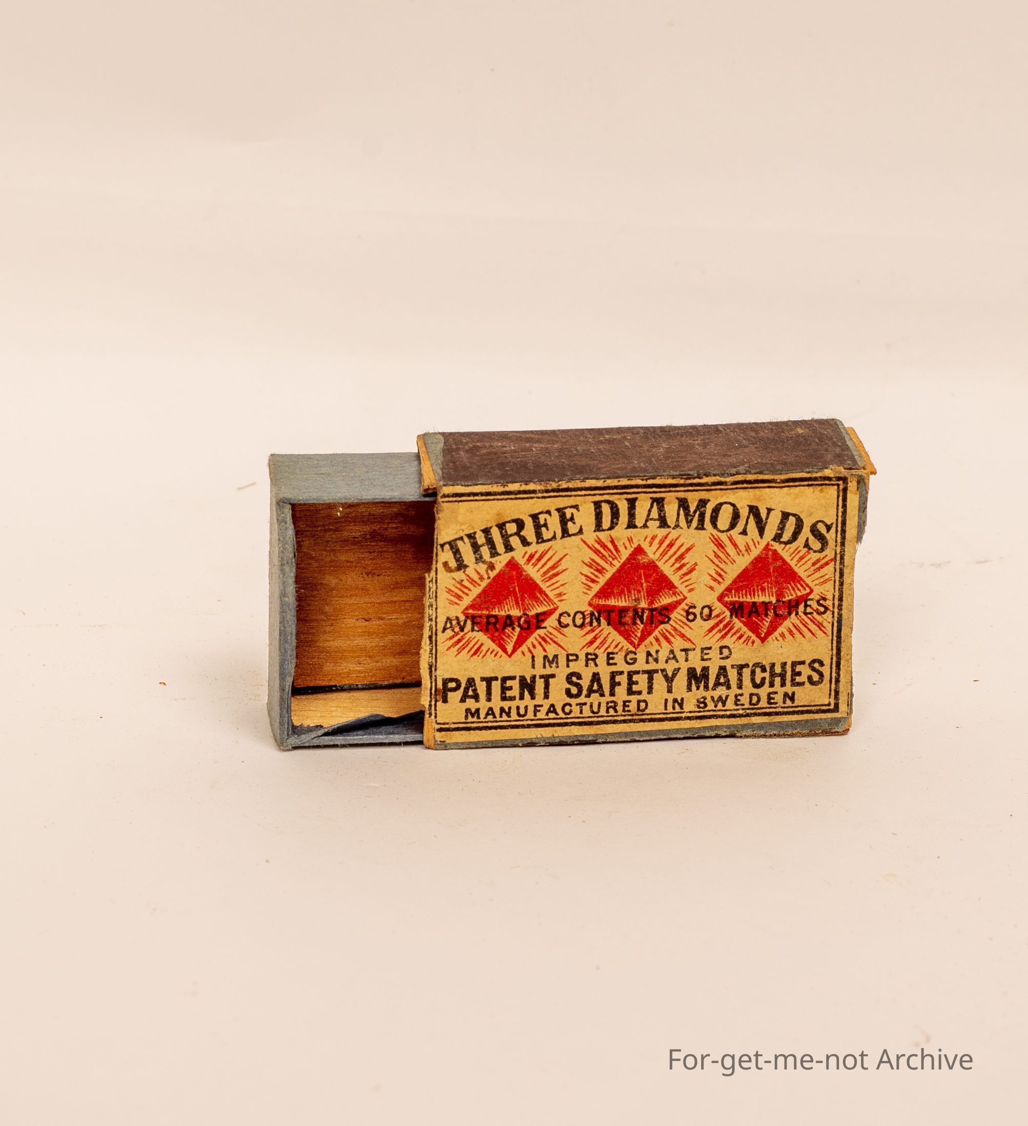 Wooden frame matchbox titled Three Diamonds Patent Safety Matches Manufactured Sweden.