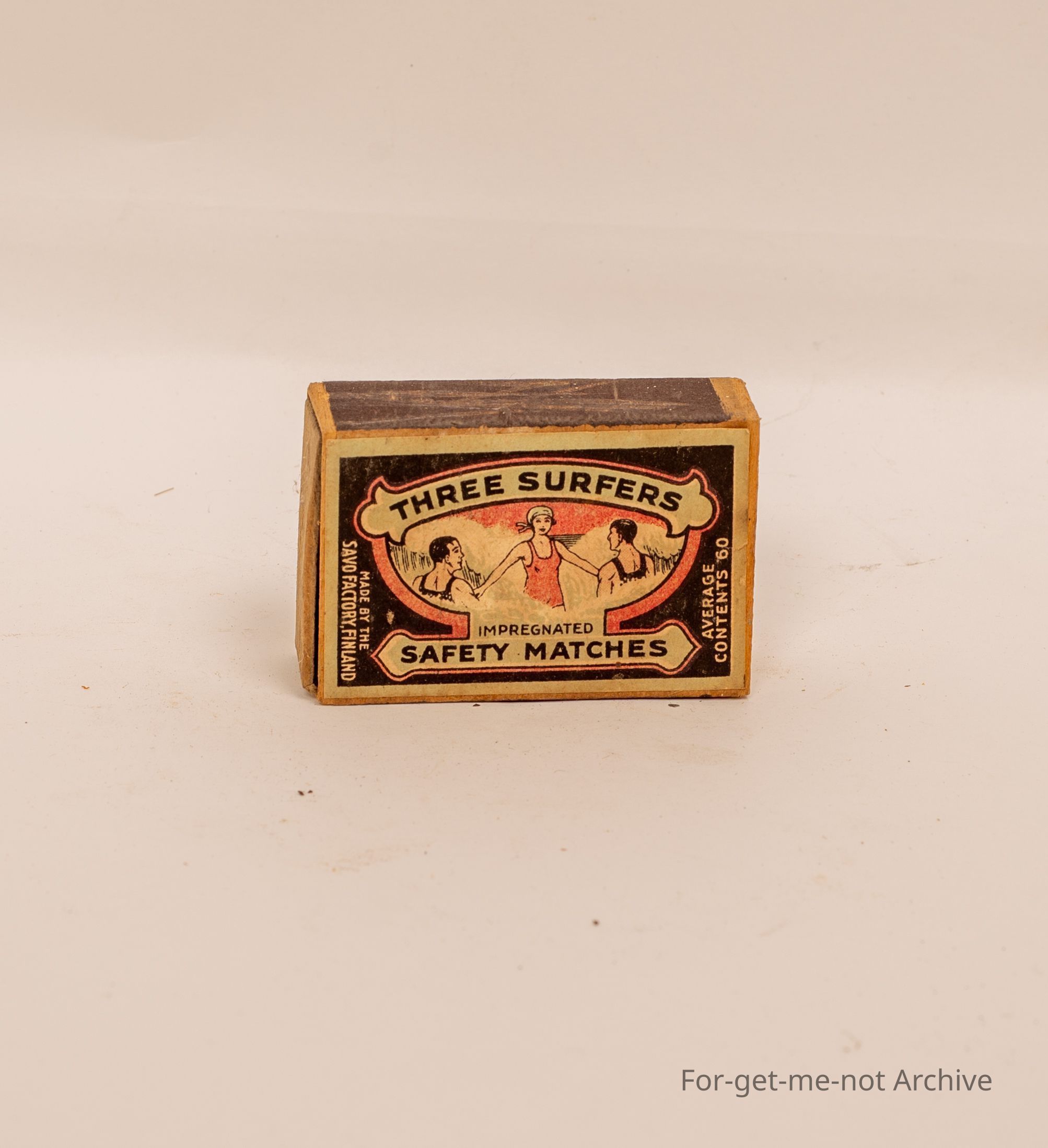 Wooden matchbox, Image Three Surfers Safety Match,