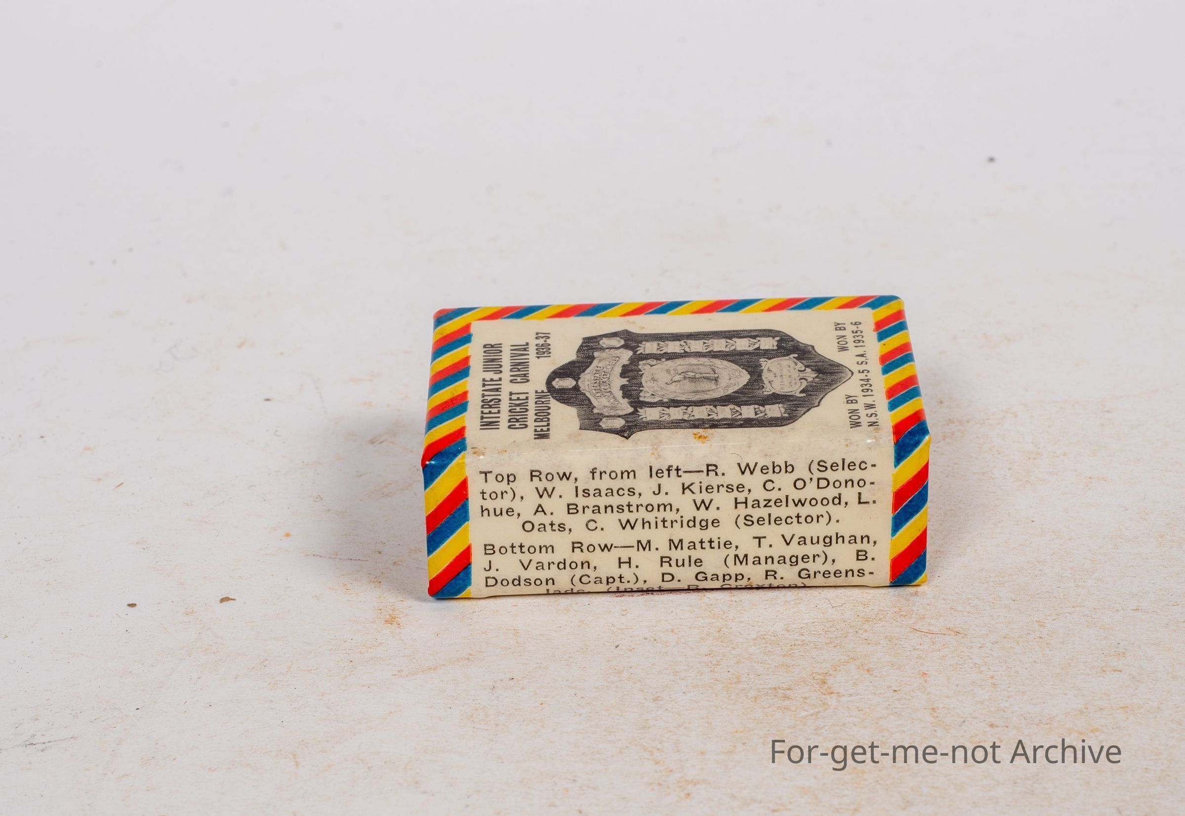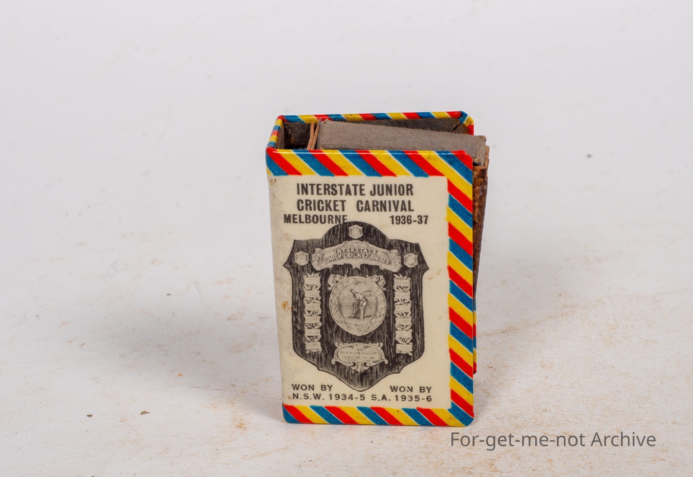 Cricket related. This is a matchbox cover, relating to cricket, interstate junior Cricket Carnival, Melbourne, 1936-37, with a crested board on the image for the interstate cricket carnival. In fantastic order with the name of the team members and the committee all on the back, On the other side is a photograph of the team.Collection